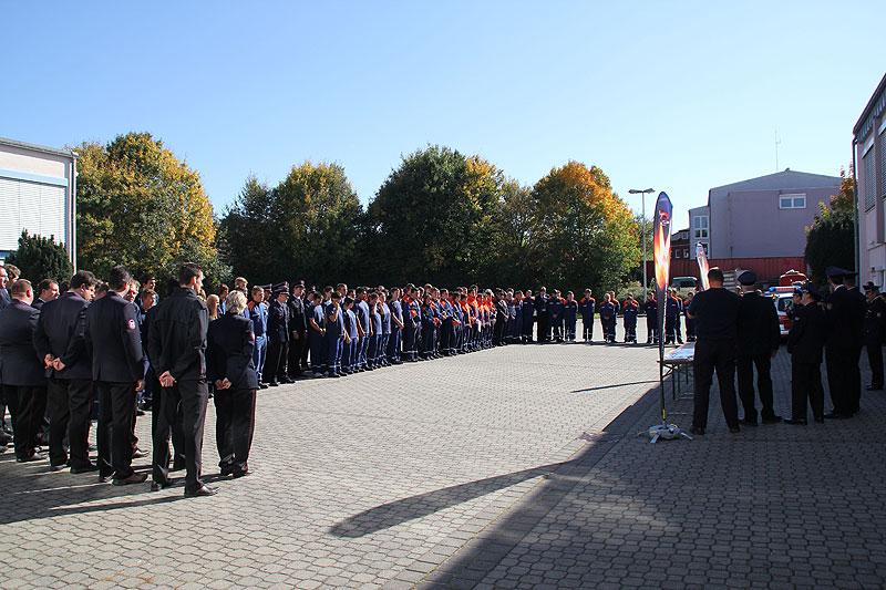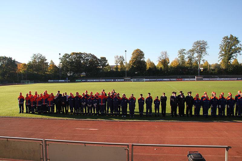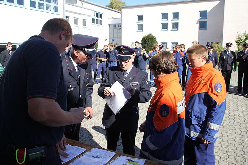 Unter den Augen des Abnahmeberechtigten der Deutschen Jugendfeuerwehr, Norbert Wanner und Wolfgang Eberle und den Schiedsrichtern galt es die fünf Aufgaben der Jugendleistungsspange zu erfüllen. Nachdem die Gruppen am Morgen von Kreisjugendfeuerwehrwart Nikolaus Klasan, Landrat Dr. Achim Brötel und Bürgermeister Roland Burger begrüßt worden waren, ging es an's Eingemachte. Für die je neun Gruppenmitglieder galt es gemeinsam fünf Aufgaben zu erfüllen und dabei auch noch einen guten Eindruck bei den Schiedsrichtern zu hinterlassen.