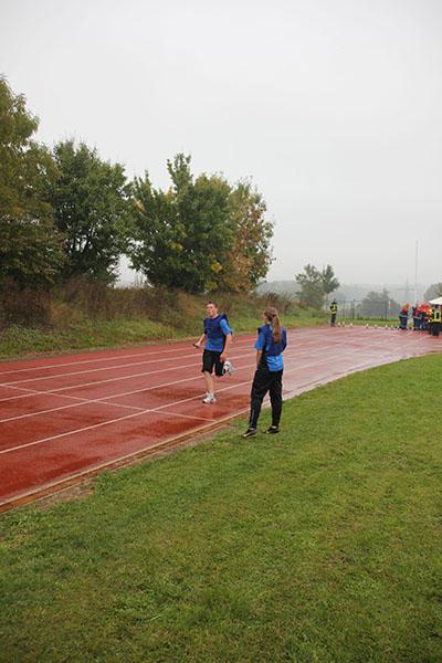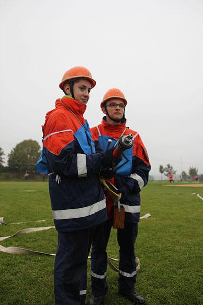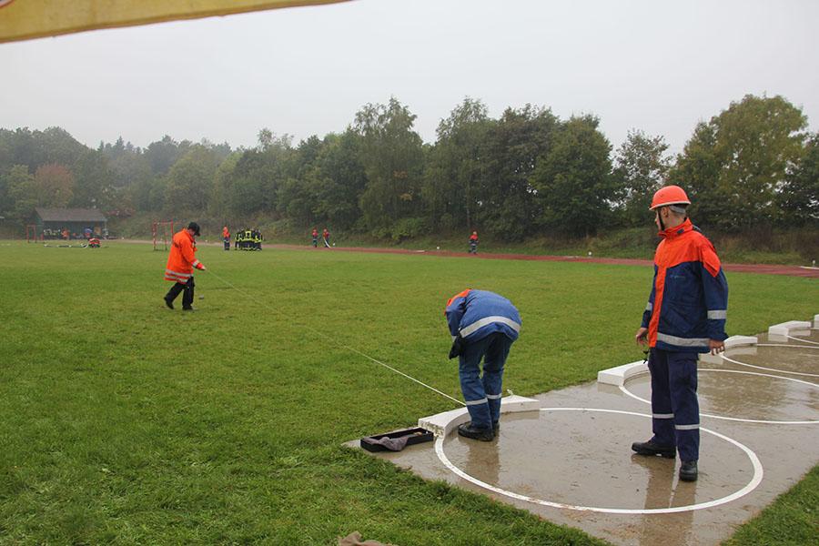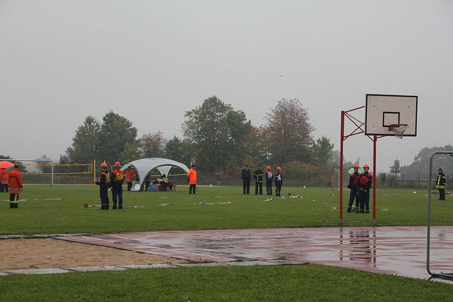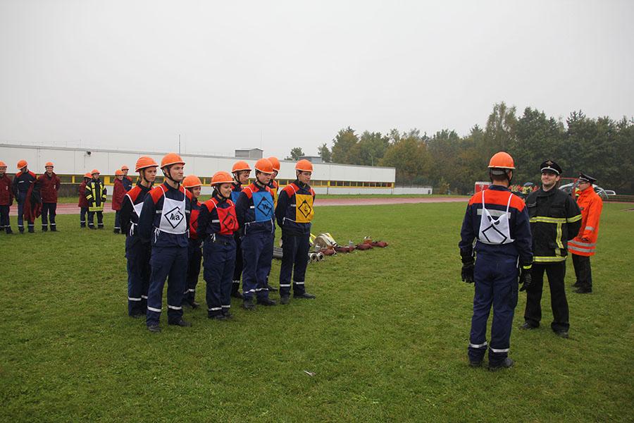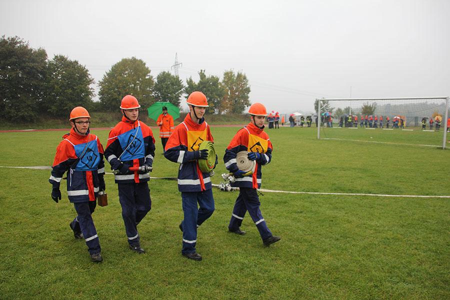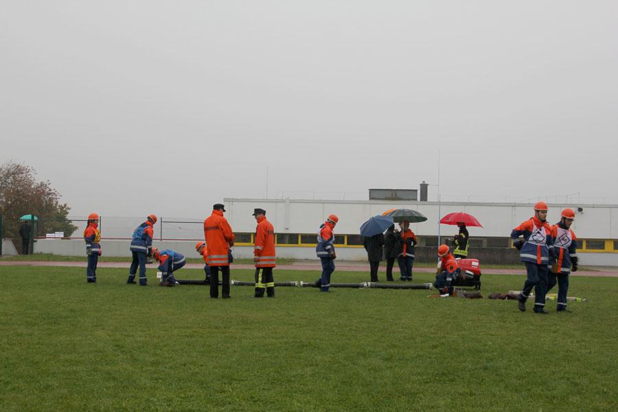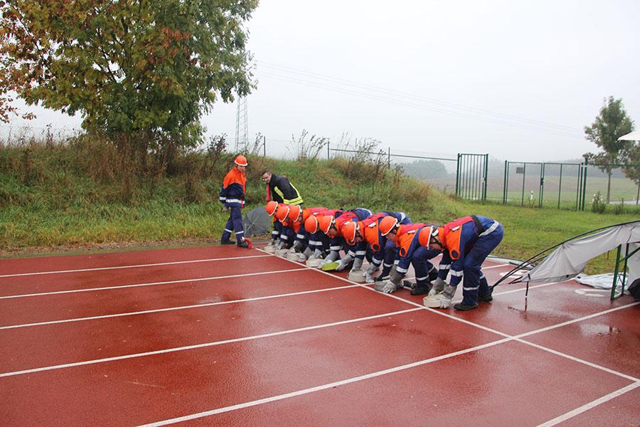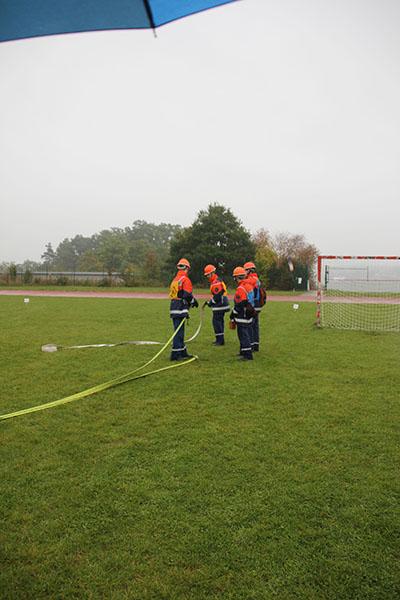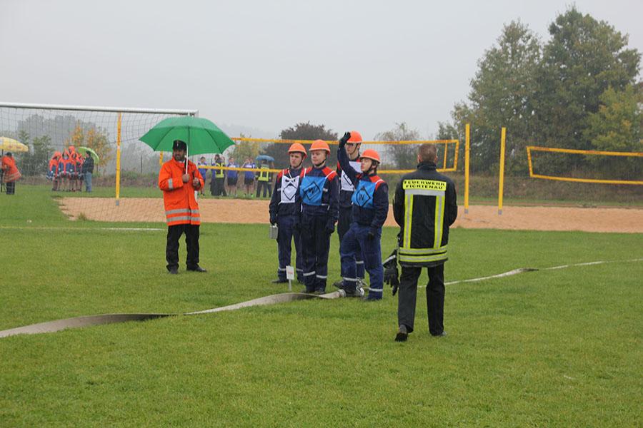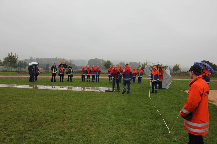 16 Gruppen mit je neun Jugendlichen machten sich bei strömendem Regen auf dem Sportgelände des GTO in Osterburken am Samstag Vormittag ans Werk und zeigten unter den Augen der Schiedsrichter und der Abnahmeberechtigten der Deutschen Jugendfeuerwehr Norbert Wanner, Oliver Zwölfer und Mike Supper gute bis sehr gute Leistungen. Nachdem die Gruppen am Morgen von Kreisjugendfeuerwehrwart Nikolaus Klasan begrüßt worden waren, ging es an's Eingemachte. Für die je neun Gruppenmitglieder galt es gemeinsam fünf Aufgaben zu erfüllen und dabei auch noch einen guten Eindruck bei den Schiedsrichtern zu hinterlassen.