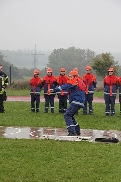 Osterburken | Welche Arten tragbarer Leitern gibt es bei der Feuerwehr? Wie lange braucht Ihr, um eine Schlauchleitung von 120 m Länge sauber auszulegen? Wie schnell könnt Ihr zu neunt 1500 m laufen und wie weit zusammen Kugelstoßen? Diesen und vielen anderen Fragen gingen 16 Mannschaften am Samstag, 05.10., in Osterburken bei der Abnahme des höchsten Abzeichens der Deutschen Jugendfeuerwehr auf den Grund.