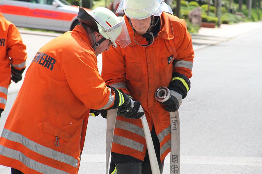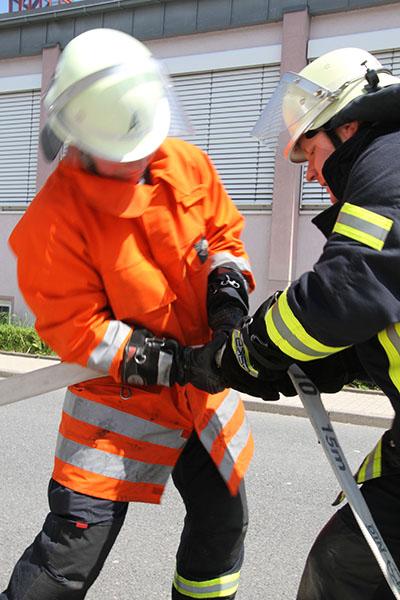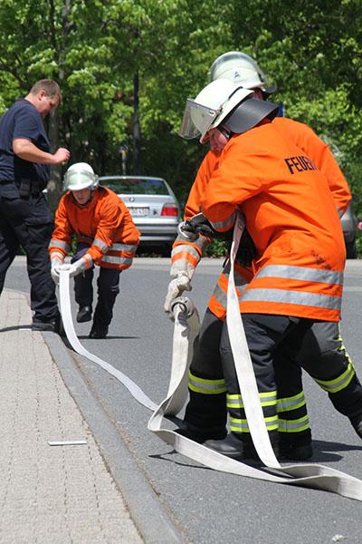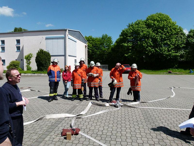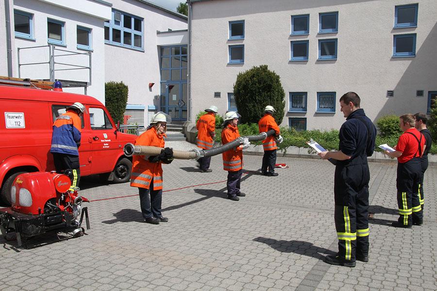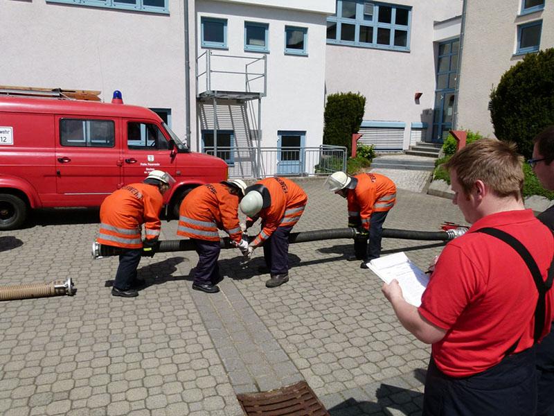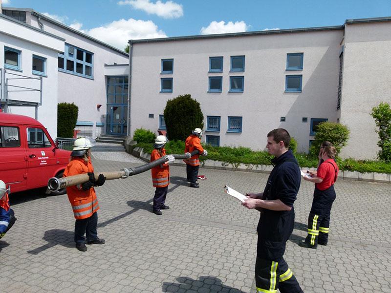 Nach einer Theorieeinheit am Vormittag legten die Jugendgruppenleiter zuerst die Jugendflamme Stufe 1 und Stufe 2 ab, nach einer Stärkung ging es am Nachmittag mit der Leistungsspange der Deutschen Jugendfeuerwehr weiter - Schnellangriff (8 Schlauchleitungen ausrollen und in weniger als 75 Sekunden zu einer Leitung zusammenkuppeln) und der Löschangriff nach der Feuerwehrdienstvorschrift 3 brachten die neuen Schiedsrichter bei sommerlichen Temperaturen in voller Montur ins Schwitzen.