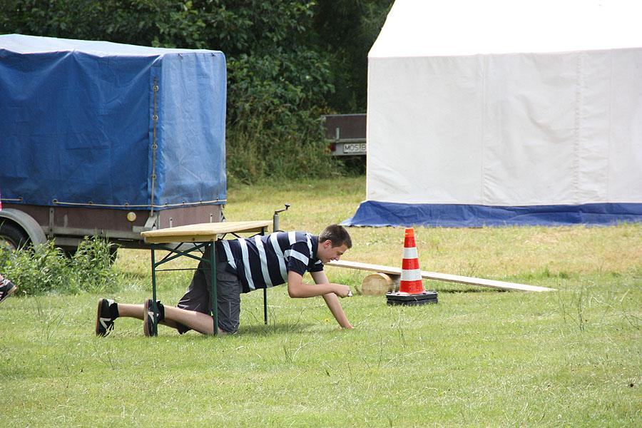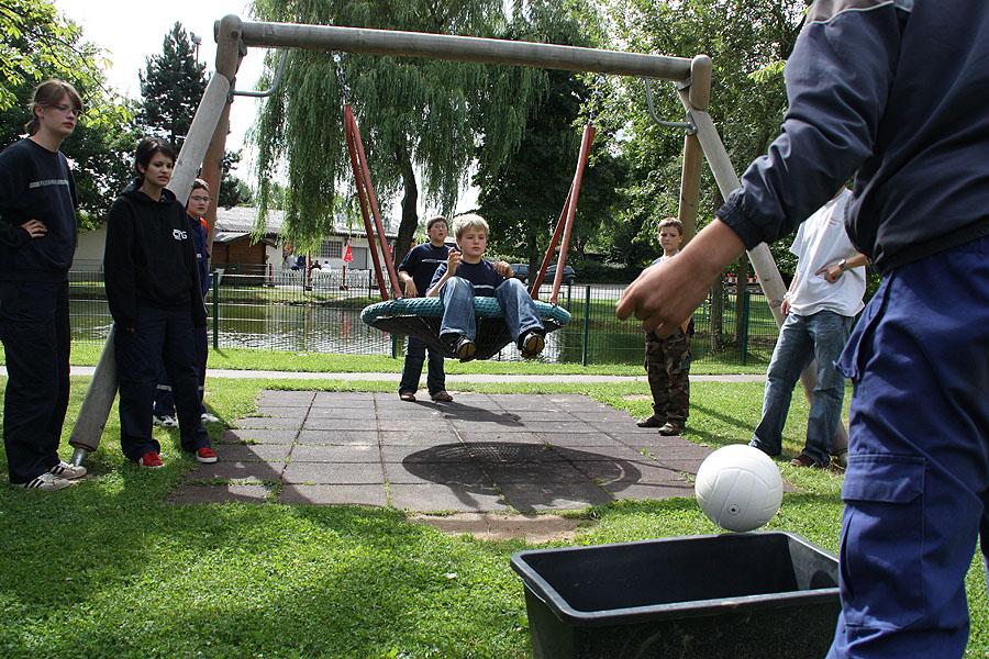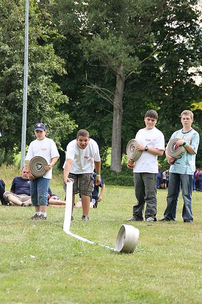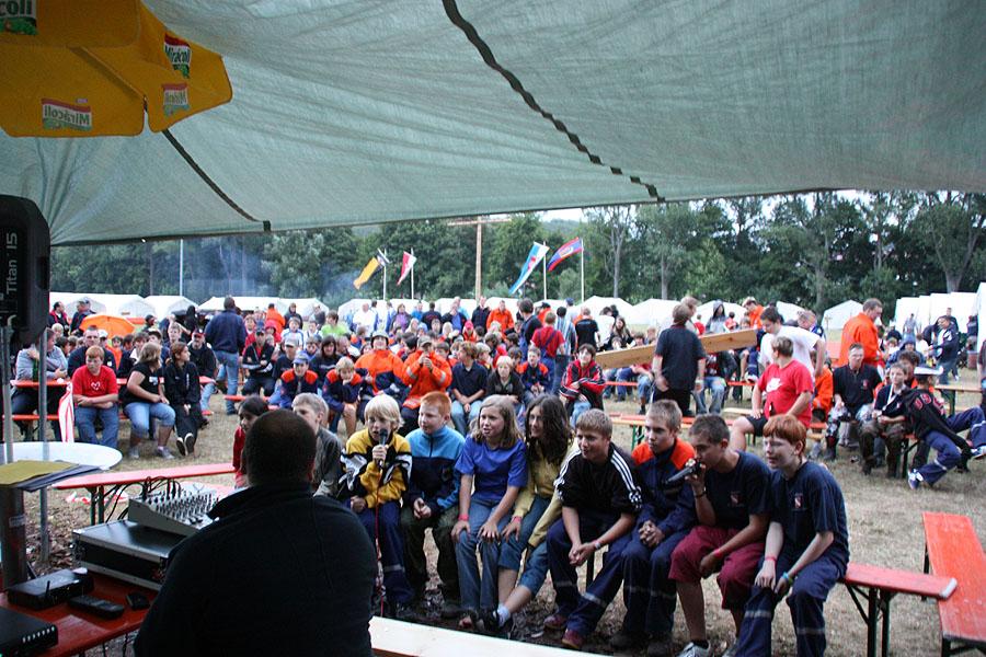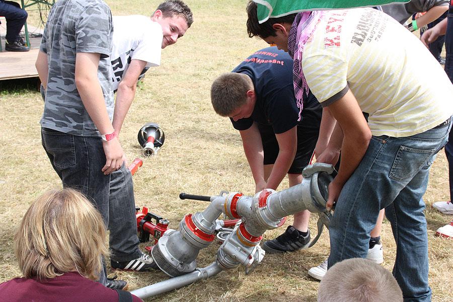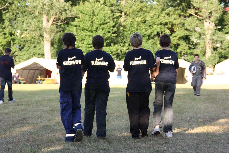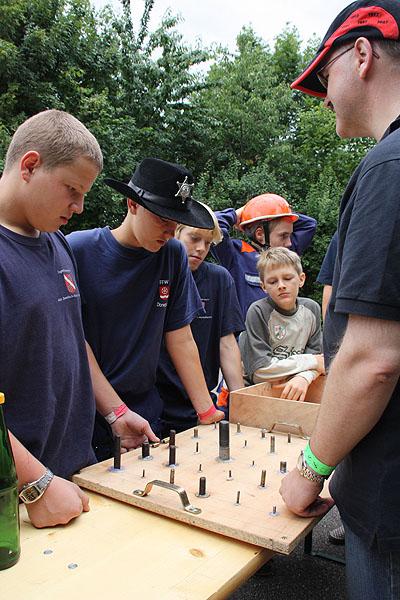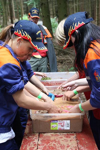 Nach einem verregneten Vormittag, machten sich die Jugendlichen am Nachmittag mit ihren Betreuern auf den Weg zu einer Wanderung, die mit verschiedenen Spielen gespickt war. Auf dem Weg Richtung Ünglert und Steinbach und zurück auf den Zeltplatz mussten die Jugendlichen sechs Aufgaben erfüllen, die Geschick, Intelligenz und Feuerwehrtechnisches Wissen voraussetzten.