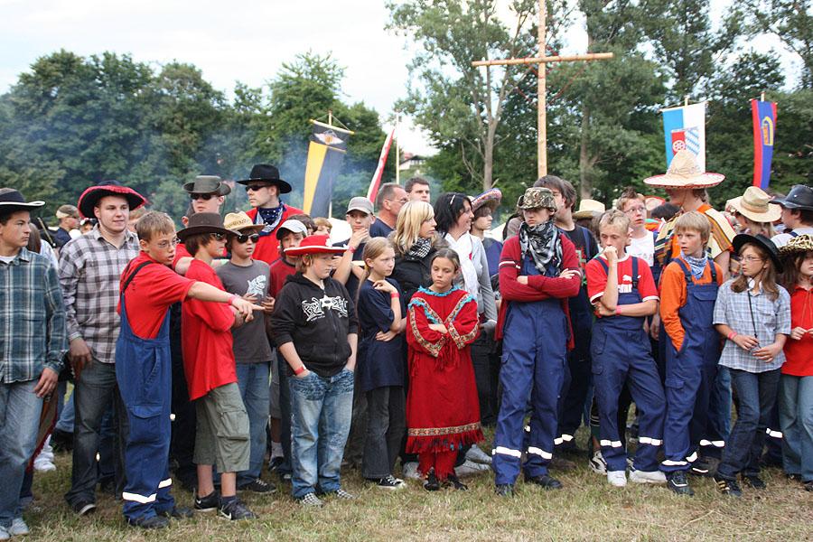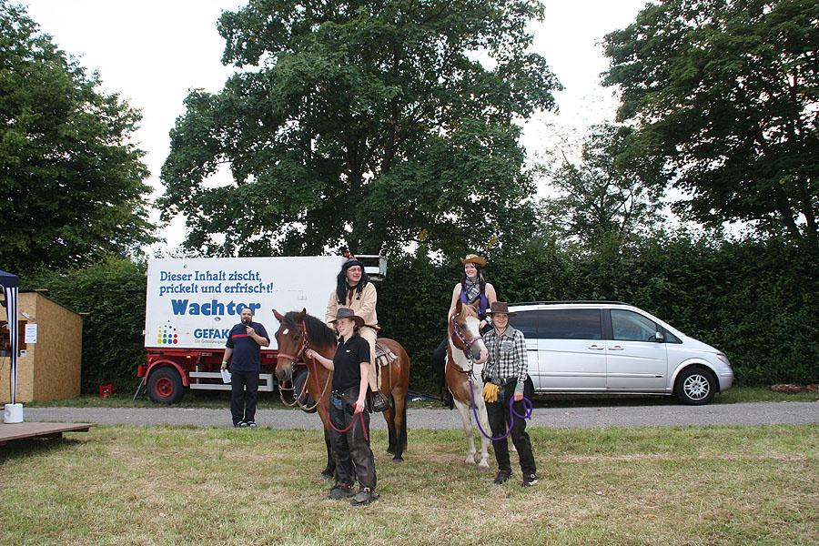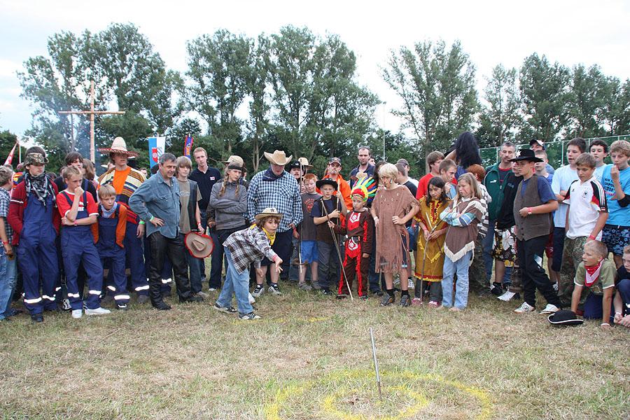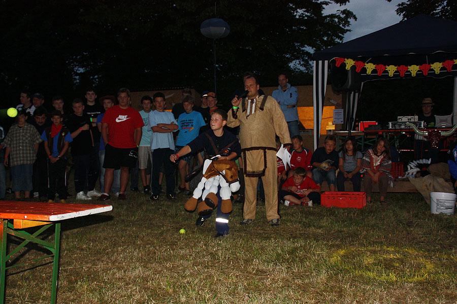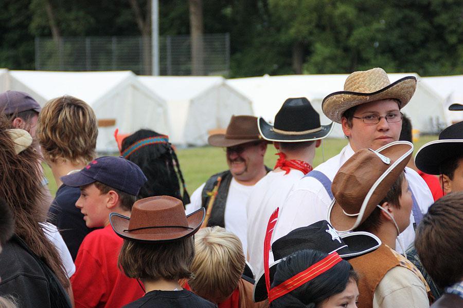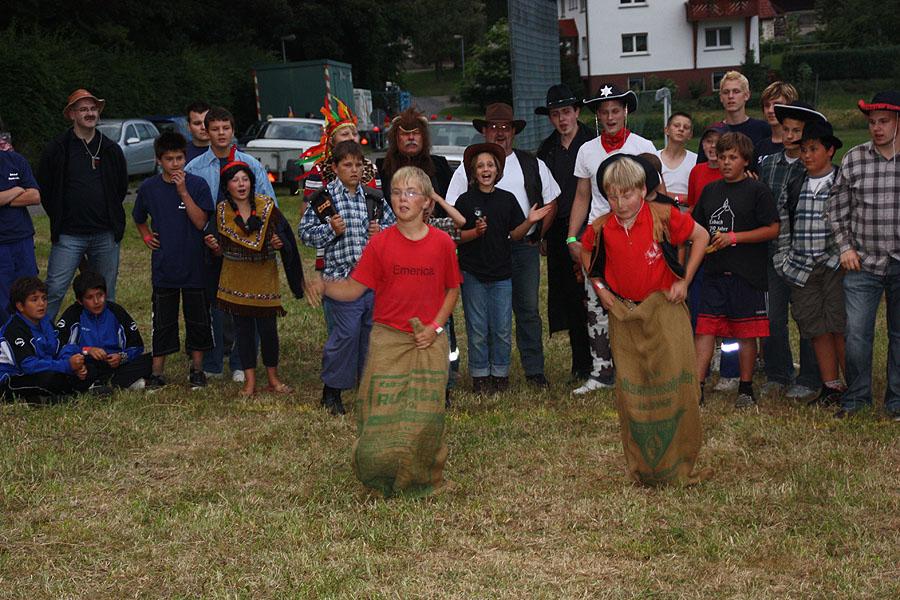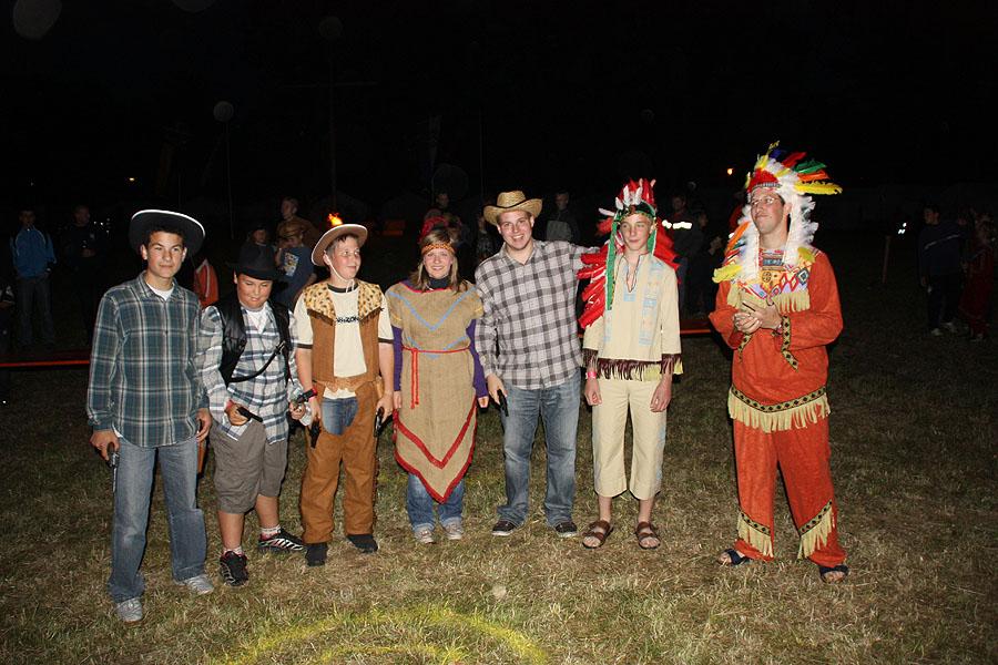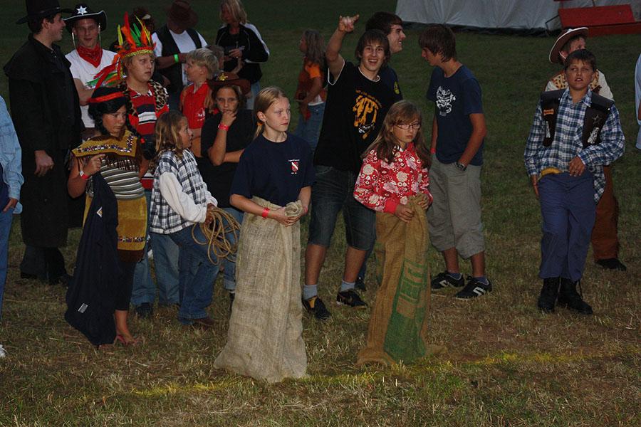 Kreisjugendfeuerwehrwart Nikolaus Klasan eröffnete das Lagerleben am Freitag abend und begrüßte gemeinsam mit Ortsvorsteher Kurt Müller die 26 Jugendfeuerwehren aus dem ganzen Neckar-Odenwald-Kreis. Nach dem Abendessen startete "Wild Wild West" mit dem Einritt der Kreisjugendleitung von vier Pferden vom benachbarten Reiterhof Partsch. Nach drei Wild-West-Spielen, bei denen es galt, Hufeisen zielgenau zu werfen, Büffel zu jagen und in Säcken zu hüpfen, fand die große Kostümprämierung der Jugendfeuerwehr statt. Ein Großteil der Jugendlichen war in einfallsreichen Kostümen angetreten.