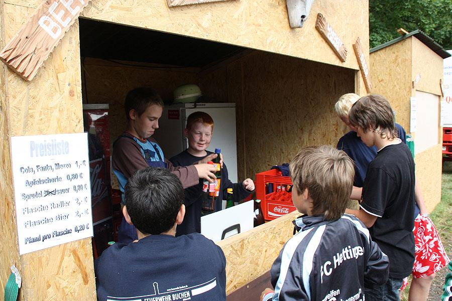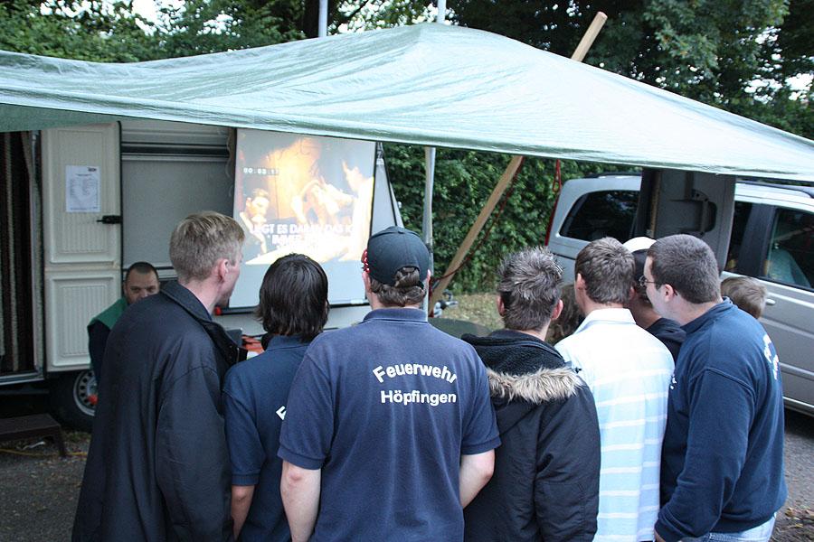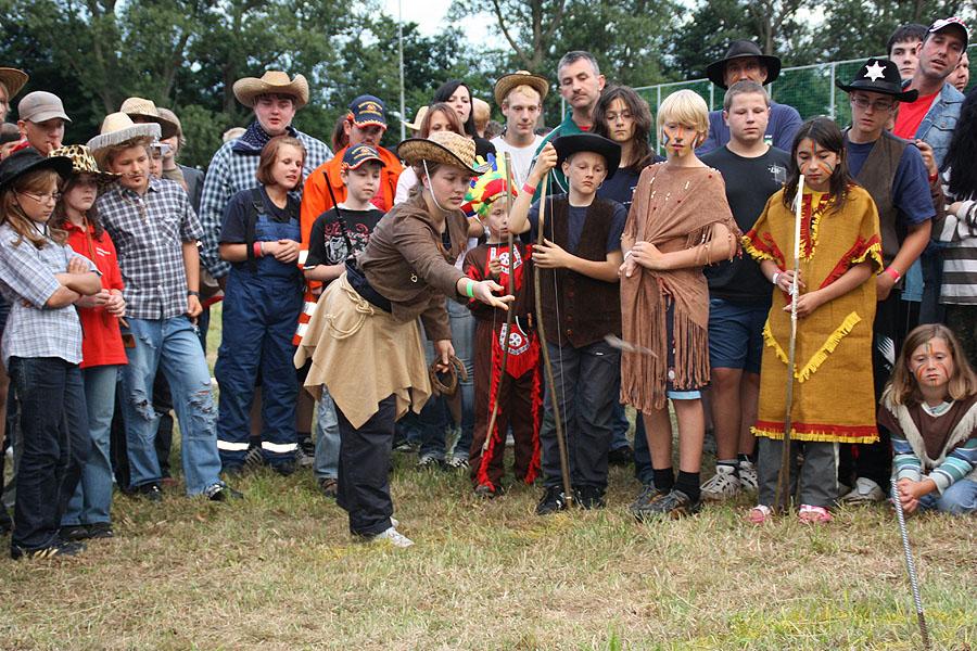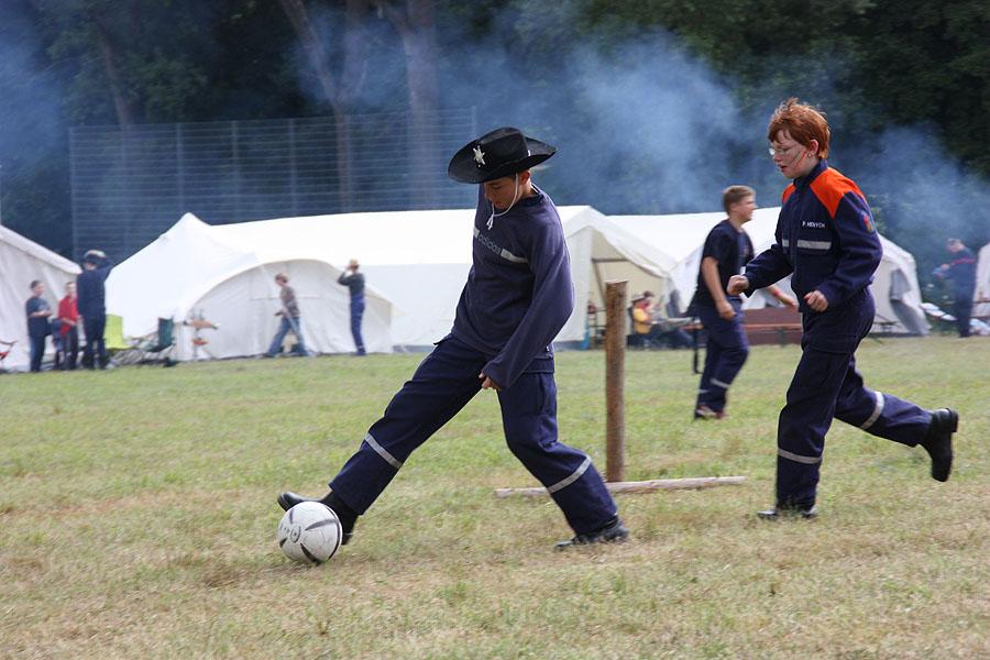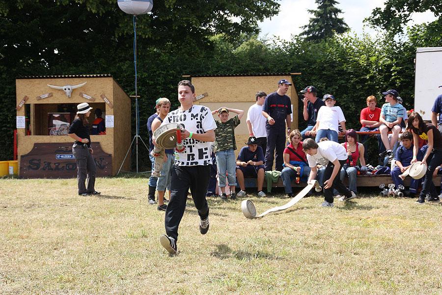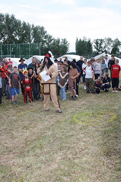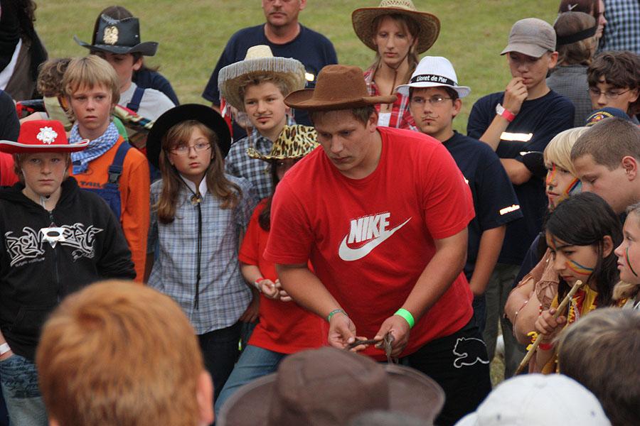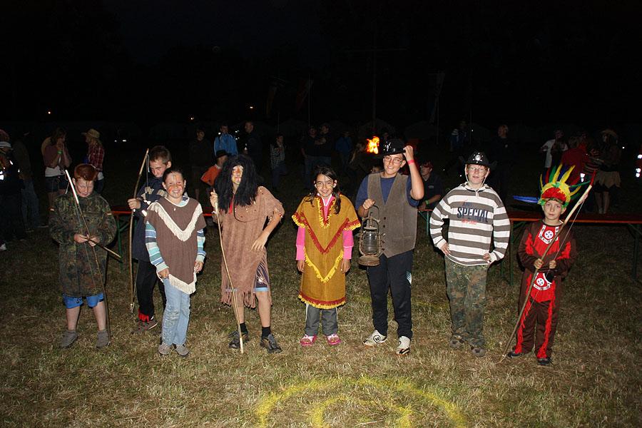 Kreisjugendfeuerwehrwart Nikolaus Klasan eröffnete das Lagerleben am Freitag abend und begrüßte gemeinsam mit Ortsvorsteher Kurt Müller die 26 Jugendfeuerwehren aus dem ganzen Neckar-Odenwald-Kreis. Nach dem Abendessen startete "Wild Wild West" mit dem Einritt der Kreisjugendleitung von vier Pferden vom benachbarten Reiterhof Partsch. Nach drei Wild-West-Spielen, bei denen es galt, Hufeisen zielgenau zu werfen, Büffel zu jagen und in Säcken zu hüpfen, fand die große Kostümprämierung der Jugendfeuerwehr statt. Ein Großteil der Jugendlichen war in einfallsreichen Kostümen angetreten.