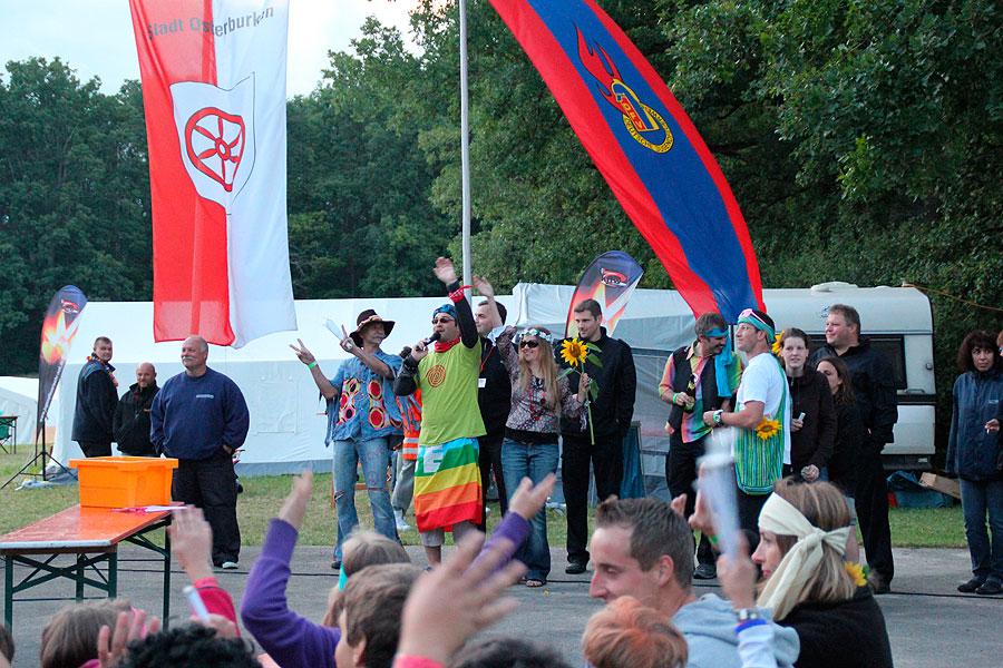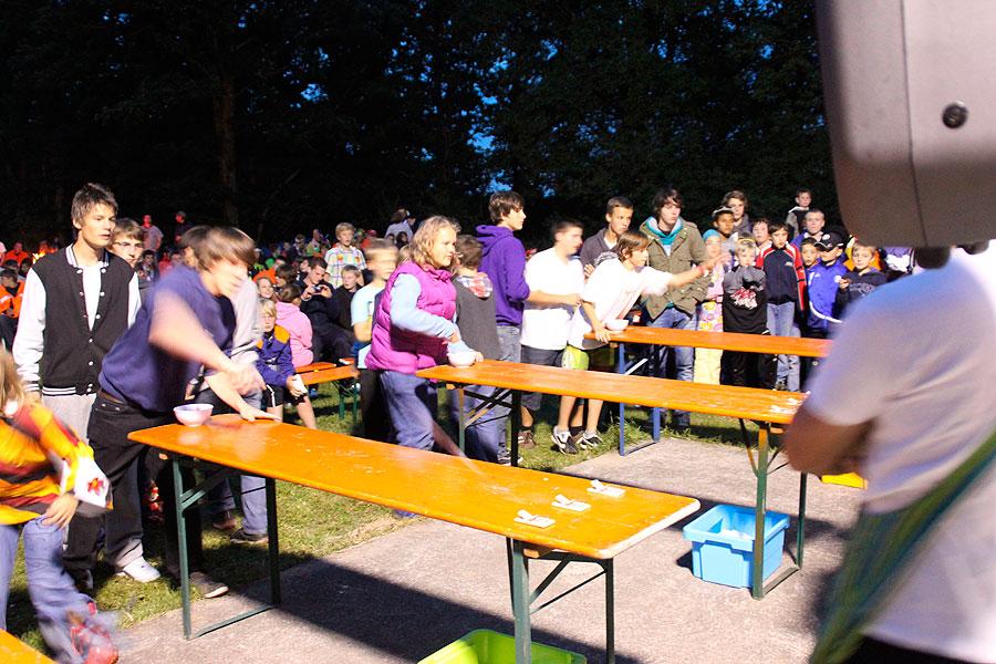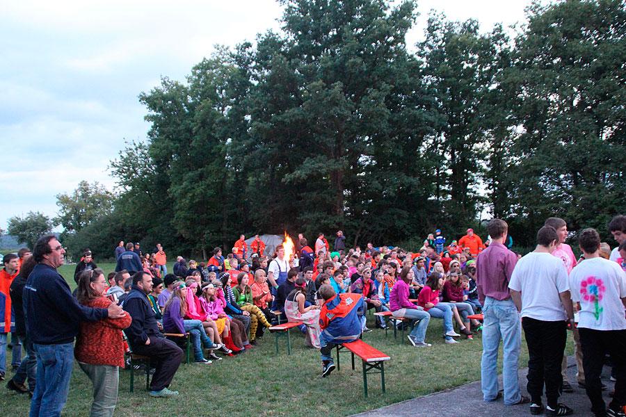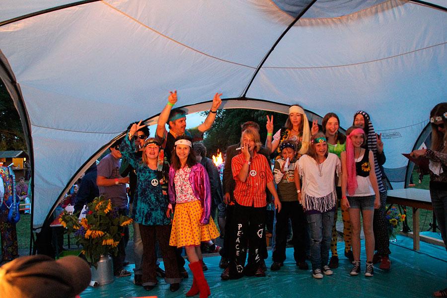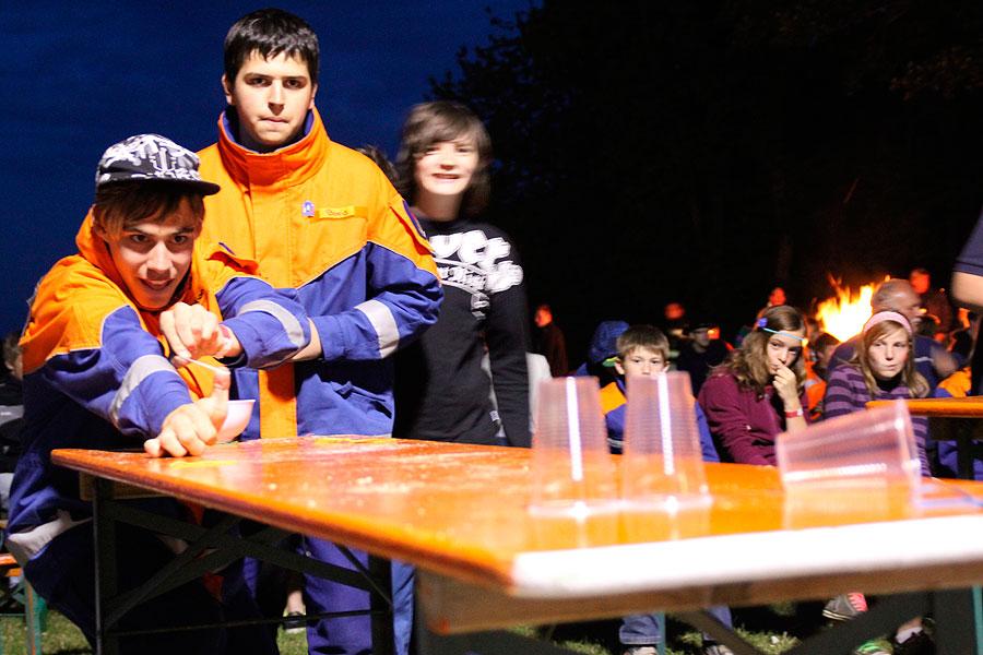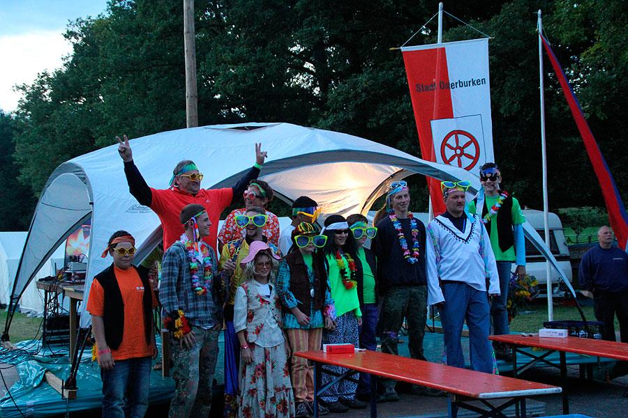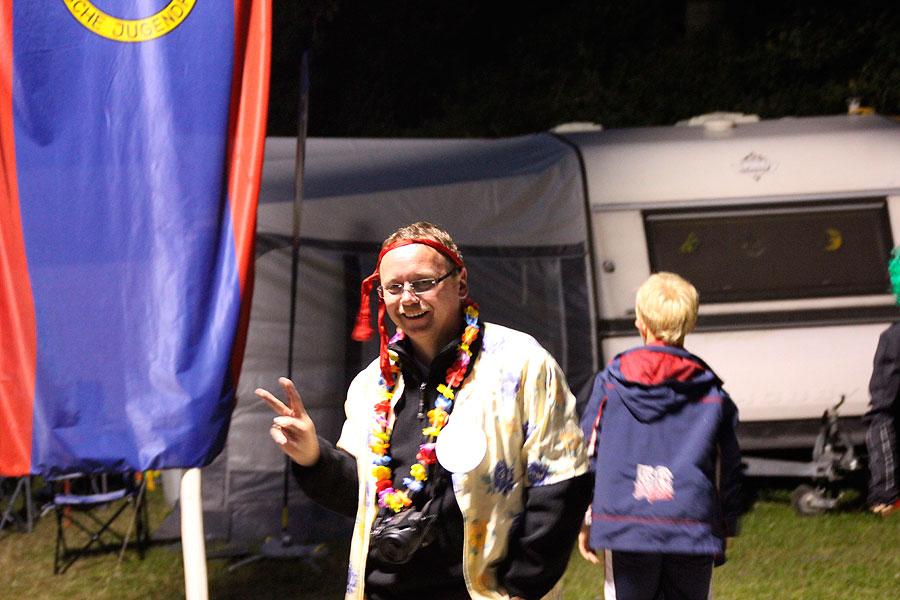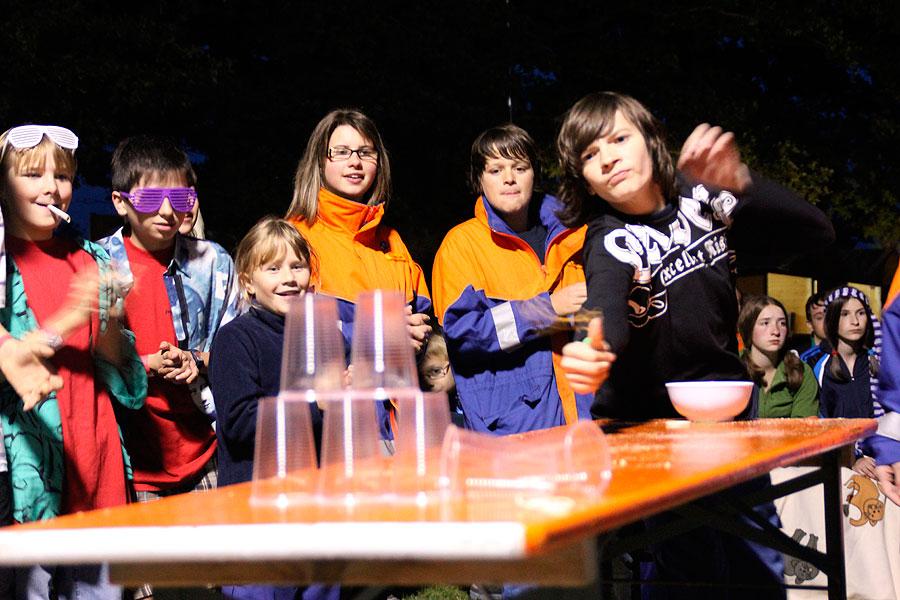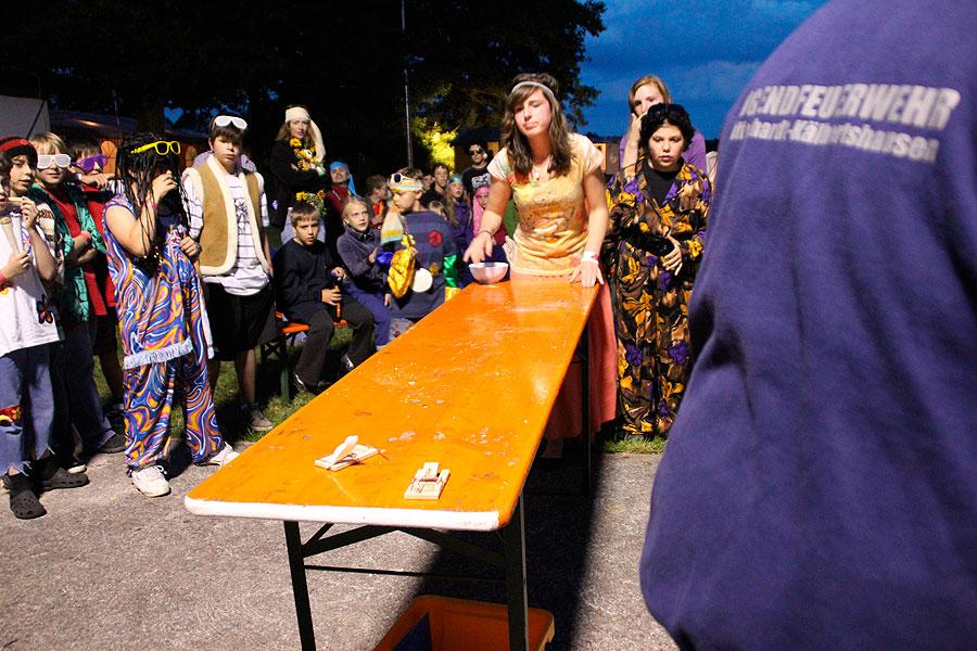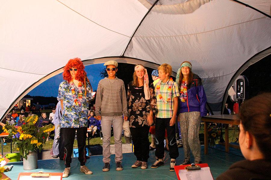 Bevor die Jugendlichen den Abend am Lagerfeuer beendeten, zeigten alle Jugendgruppen ihre meist selbstgebastelten Verkleidungen rund um das selbstgewählte Zeltlager-Motto "Die wilden Siebziger" und bewältigten in fünf Spielen beinahe unlösbare Aufgaben innerhalb einer kurzen Minute.