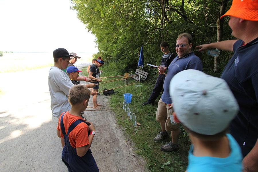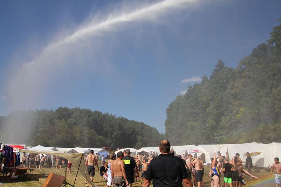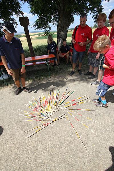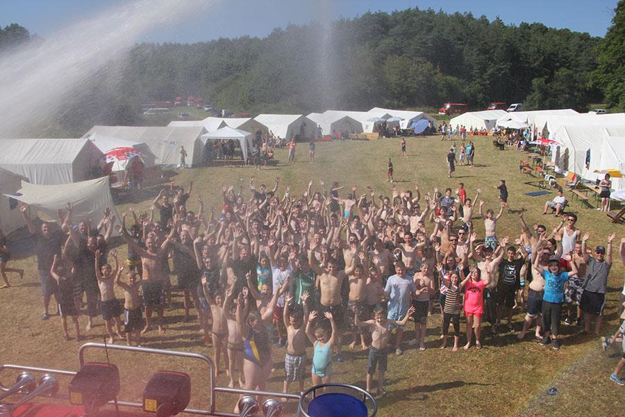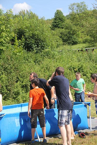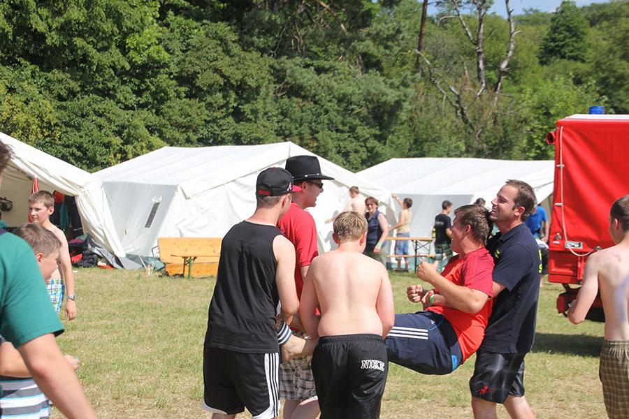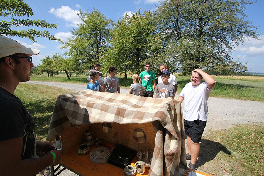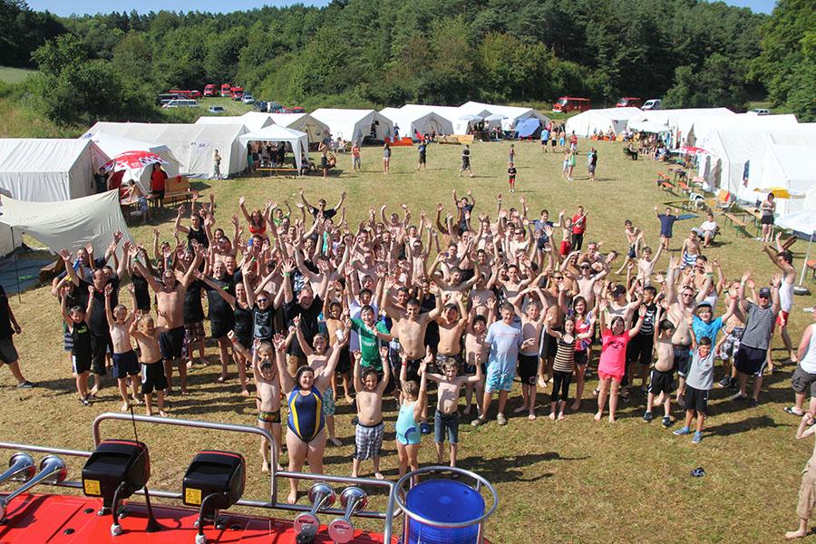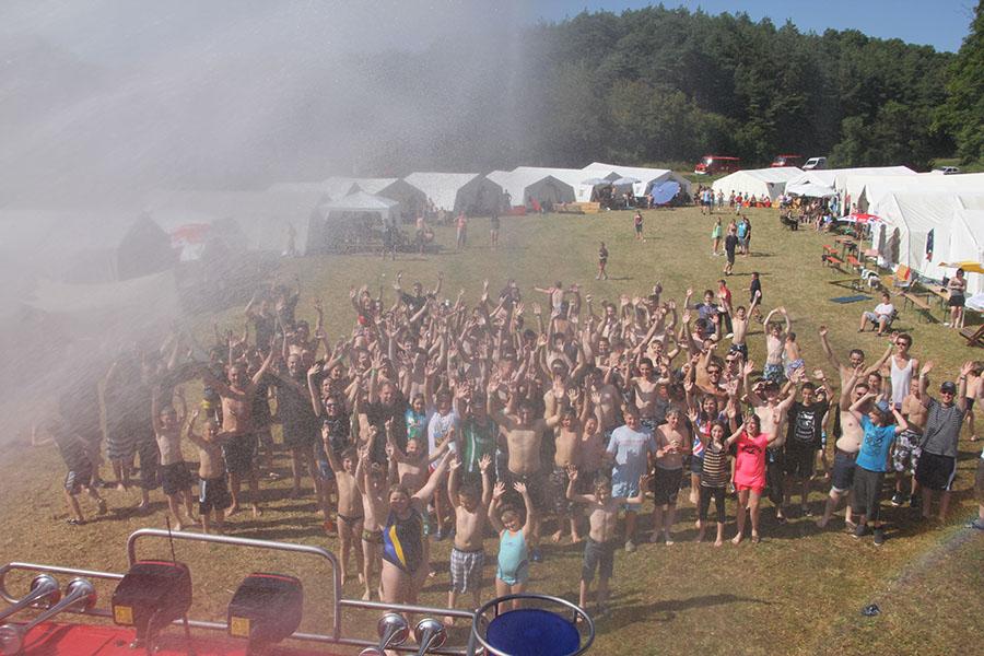 Am Samstag startete nach dem Frühstück die Erlebniswanderung rund um Hettingen mit verschiedenen feuerwehrtechnischen und allgemeinen Spielen: Flaschenangeln, Geräte ertasten, Ringe werfen, Ballwurf durch Reifen, Knoten, Schlauchkegeln, Schlösser öffnen, Riesen-Mikado und Wassertransport mit einem Schwamm. Die Hitze am Nachmittag machte eine Anpassung des Programms nötig. Die geplanten Turniere wichen einer nässeren Angelegenheit: mit zwei Füllungen des Tanklöschfahrzeugs der Feuerwehr Buchen konnten sich die Teilnehmer abkühlen.