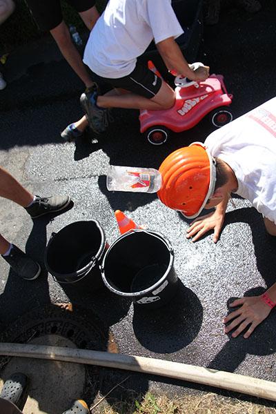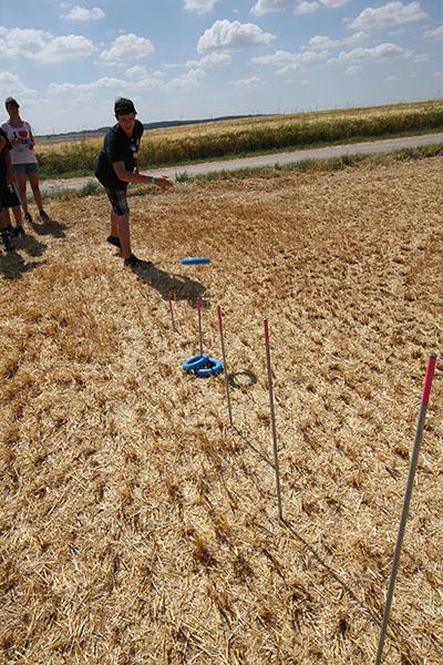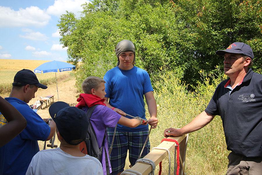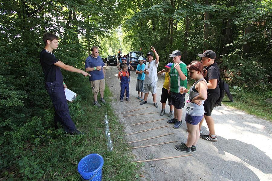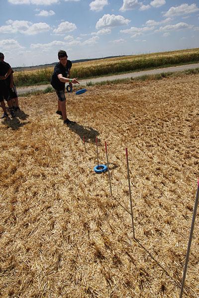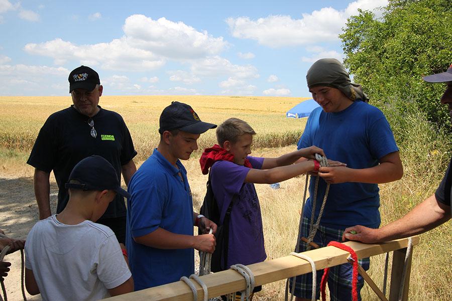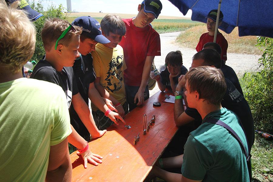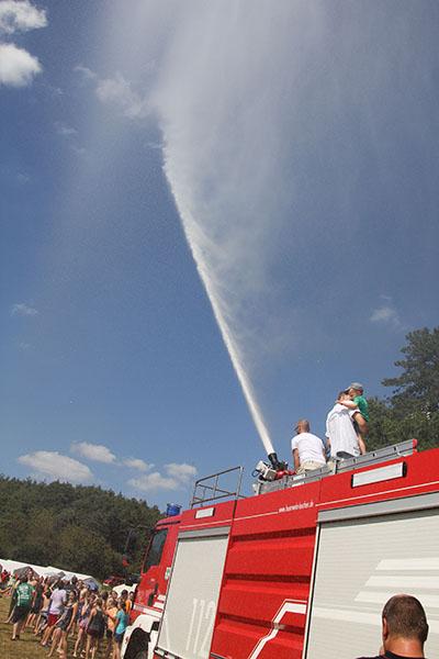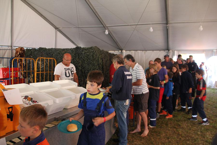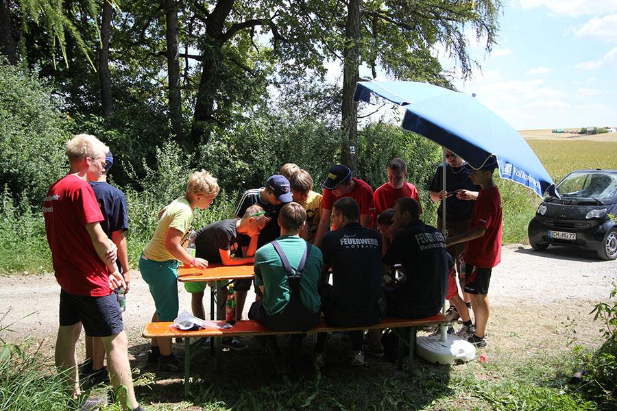 Am Samstag startete nach dem Frühstück die Erlebniswanderung rund um Hettingen mit verschiedenen feuerwehrtechnischen und allgemeinen Spielen: Flaschenangeln, Geräte ertasten, Ringe werfen, Ballwurf durch Reifen, Knoten, Schlauchkegeln, Schlösser öffnen, Riesen-Mikado und Wassertransport mit einem Schwamm. Die Hitze am Nachmittag machte eine Anpassung des Programms nötig. Die geplanten Turniere wichen einer nässeren Angelegenheit: mit zwei Füllungen des Tanklöschfahrzeugs der Feuerwehr Buchen konnten sich die Teilnehmer abkühlen.