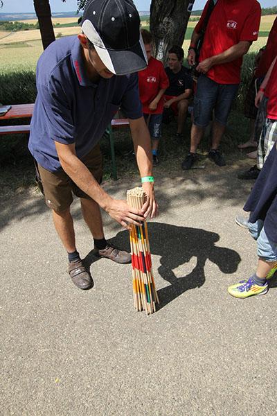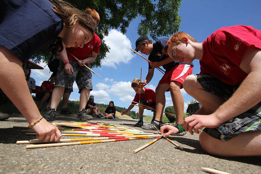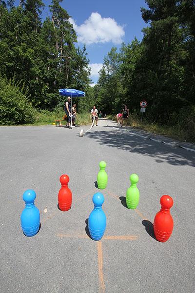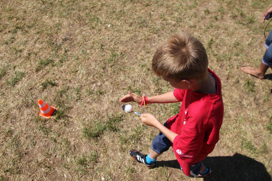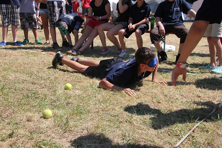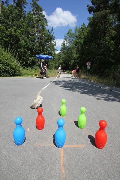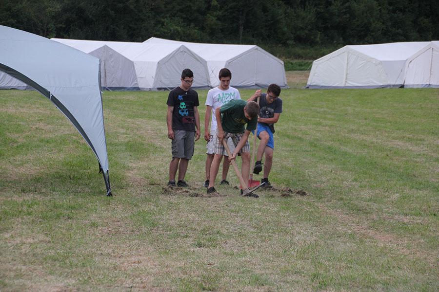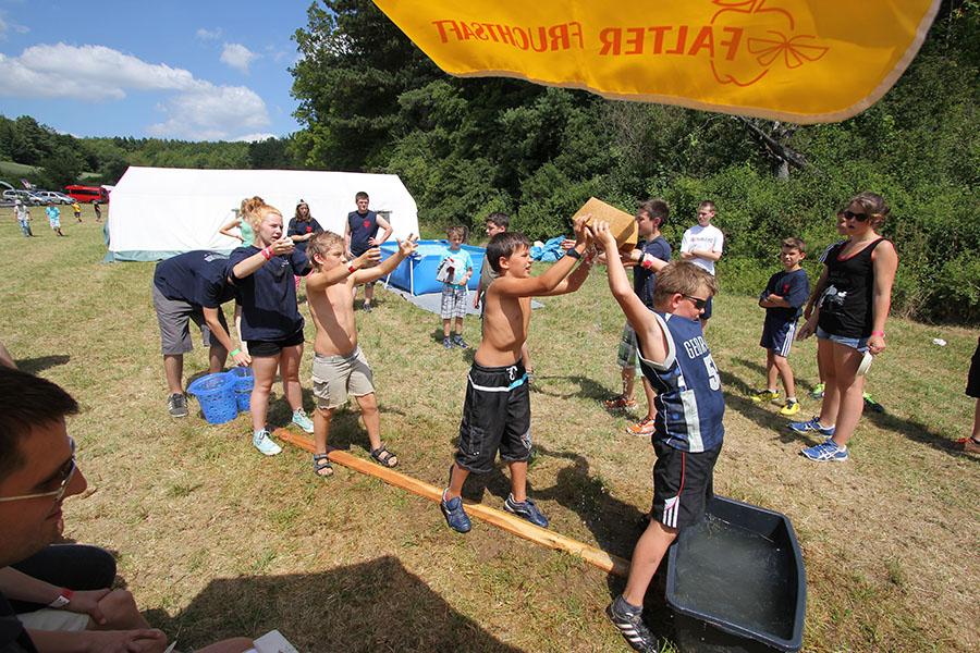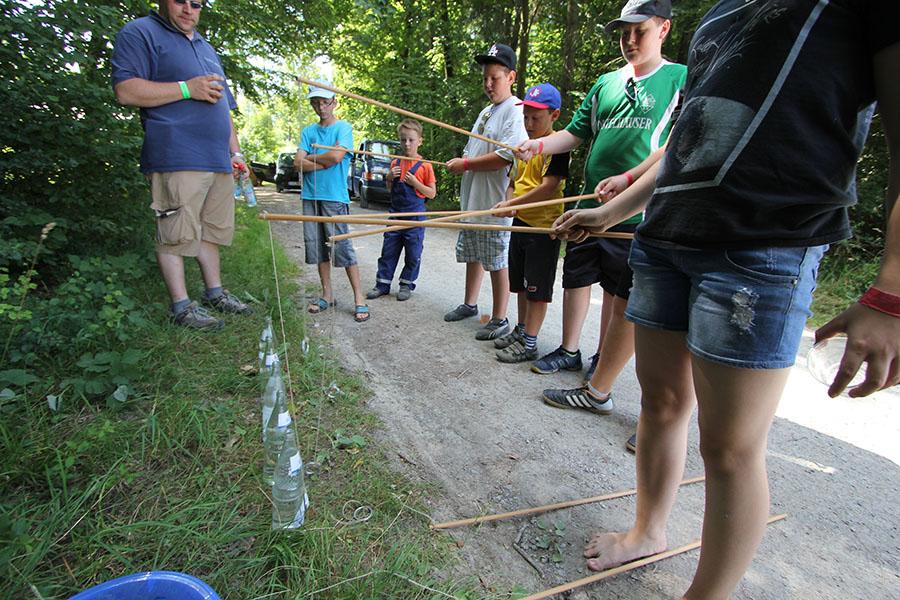 Der Sonntag gehörte - nur unterbrochen durch das Mittagessen - der Lagerolympiade, bei der die Jugendlichen an sieben Spielstationen ihr Können unter Beweis stellen mussten. Dazu musste Wasser in Gummistiefeln transportiert, Armaturen zusammen gepuzzelt, Riesen-Jenga gespielt, Tischtennis-Bälle gesucht, mit Eiern auf Löffeln gelaufen, Wasser in Helmen mit einem Bobbycar transportiert und mit einem "A" gelaufen werden.