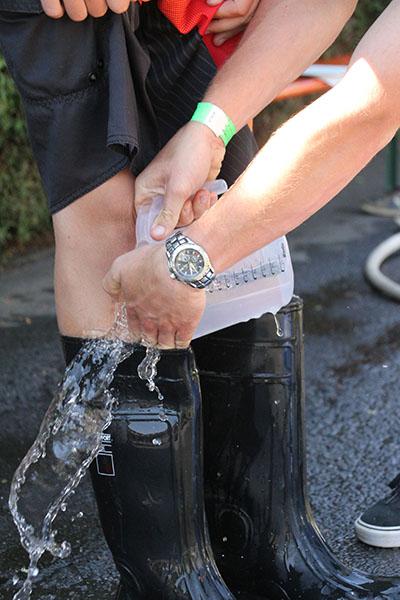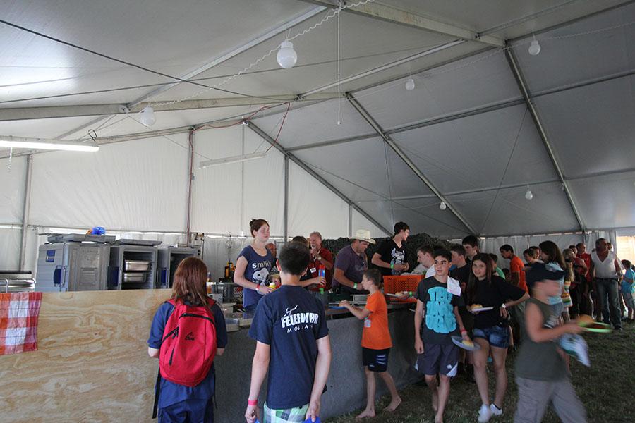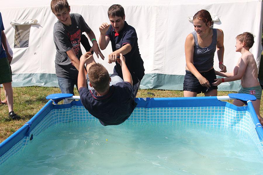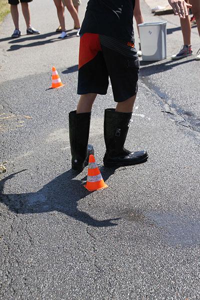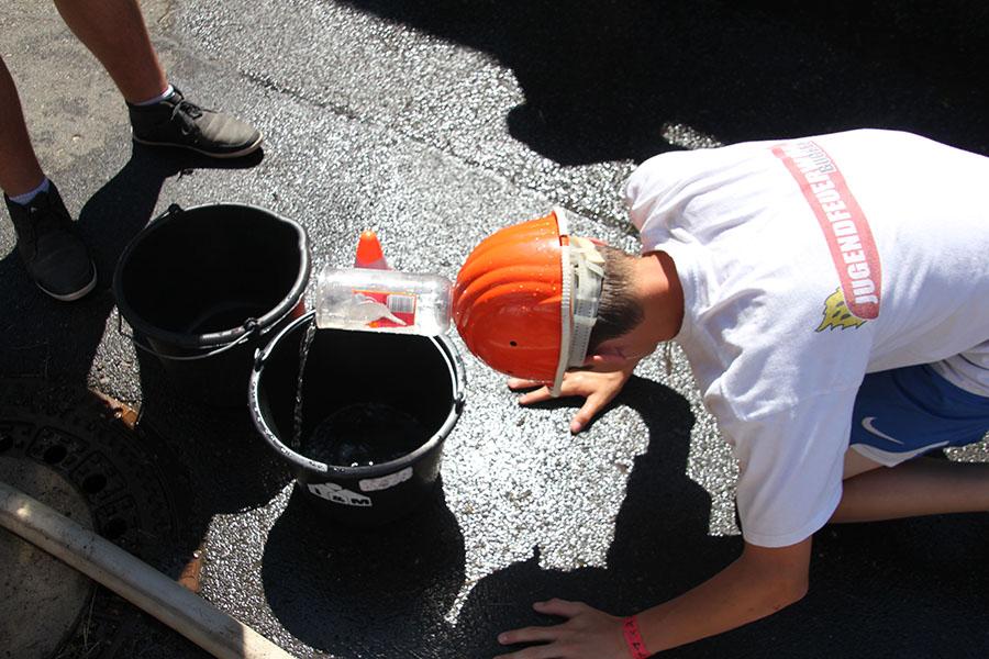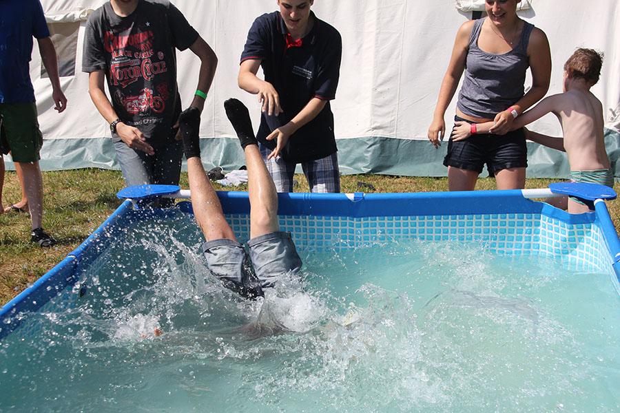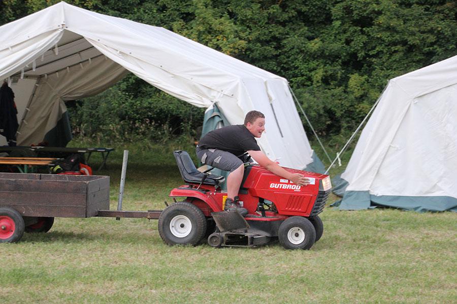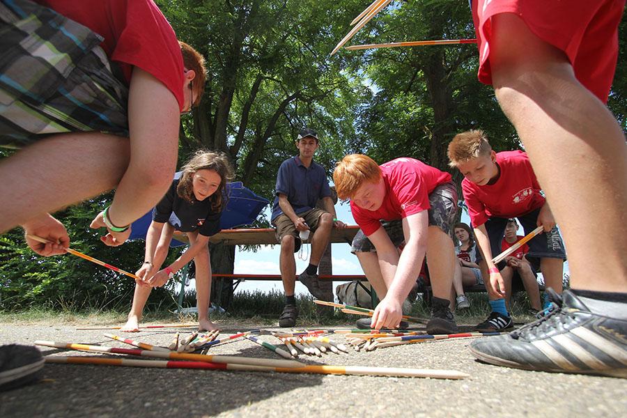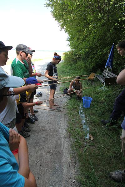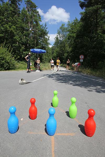 Der Sonntag gehörte - nur unterbrochen durch das Mittagessen - der Lagerolympiade, bei der die Jugendlichen an sieben Spielstationen ihr Können unter Beweis stellen mussten. Dazu musste Wasser in Gummistiefeln transportiert, Armaturen zusammen gepuzzelt, Riesen-Jenga gespielt, Tischtennis-Bälle gesucht, mit Eiern auf Löffeln gelaufen, Wasser in Helmen mit einem Bobbycar transportiert und mit einem "A" gelaufen werden.