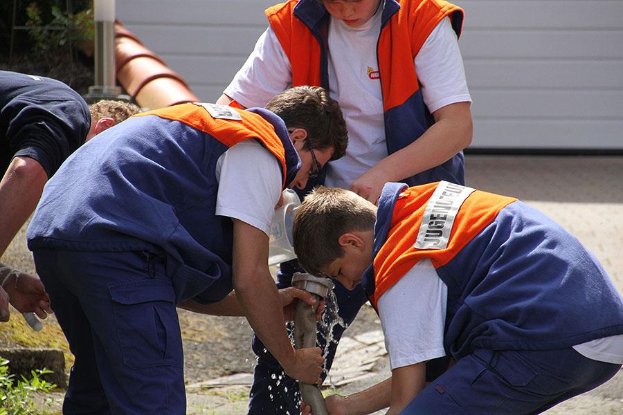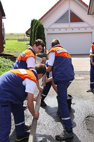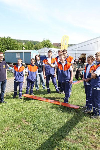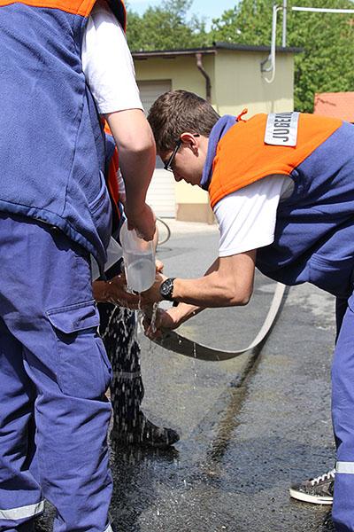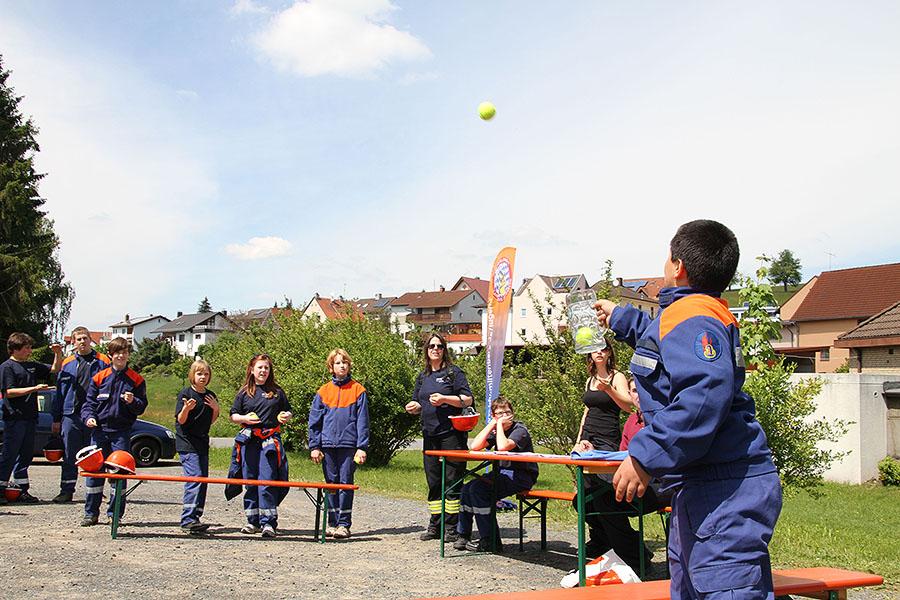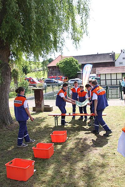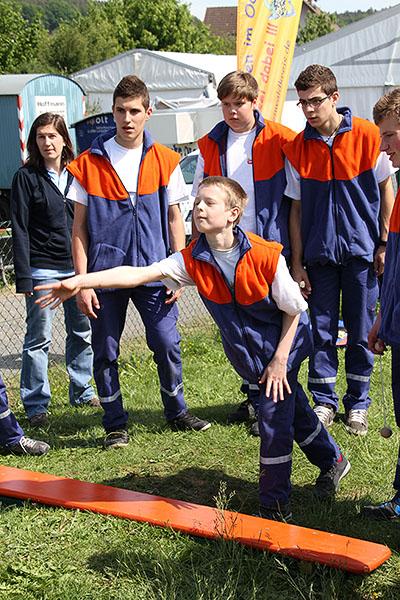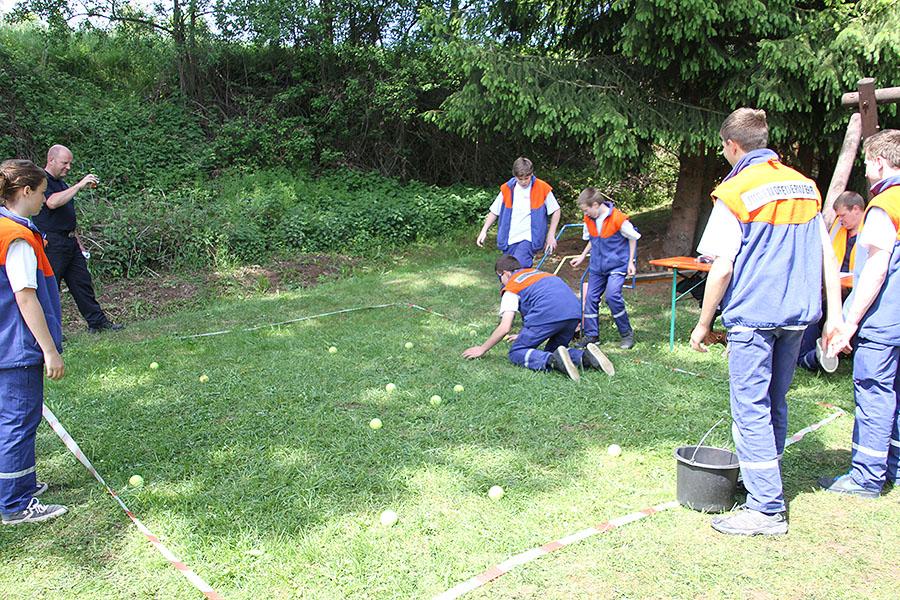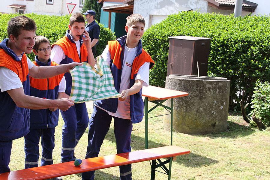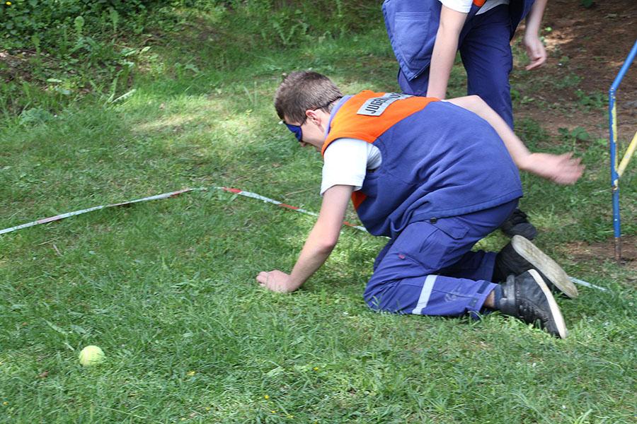 Vorher galt es allerdings bei strahlendem Sonnenschein und sommerlichen Temperaturen, die neun Spiele zu meistern: Ertasten von Armaturen, Zurodnen von Flaggen von 16 Staaten der Europäischen Union, Tennisballfangen in einem Maßkrug, Wassertransport durch einen C-Schlauch, Balltransport auf einer Trage durch einen Parcours, Tennisbälle mit verbundenen Augen finden, mittels eines Tuches Bälle in Kisten werfen, Leitergolf und Volleyball mit Wasserbomben. Als Zusatzaufgabe lernten die Jugendlichen den Ort Breitenbrunn in Form von zehn Fragen näher kennen und konnten so zusätzliche Punkte sammeln.