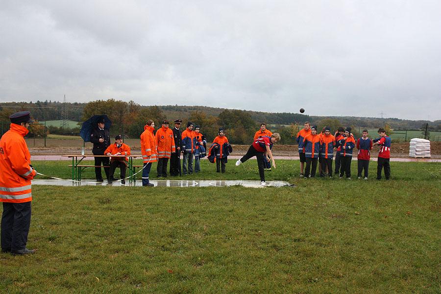 Unter dichten Regenwolken, gingen die Mädchen und Jungen zwischen 15 und 18 Jahren ans Werk. Nach den anfänglichen Regenschauern legte sich der Regen, dafür kam kalter Wind am höchsten Punkt in Osterburken, den Sportanlagen des GTO, aus. Bei den unterschiedlichen Aufgaben zeigten die Jugendlichen gute Leistungen. Um im Kugelstoßen gemeinsam 55 m zu erreichen mussten sich alle Gruppenmitglieder anstrengen und die 5-kg-Kugel (Jungen) bzw. die 4-kg-Kugel (Mädchen) ohne überzutreten soweit wie möglich in den Kugelstoß-Sektor befördern.