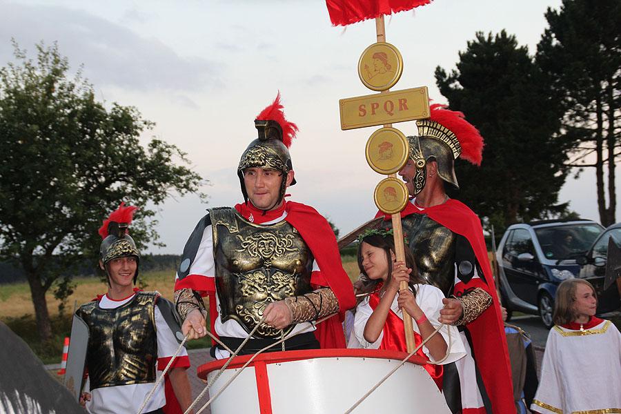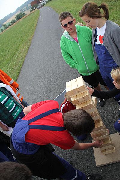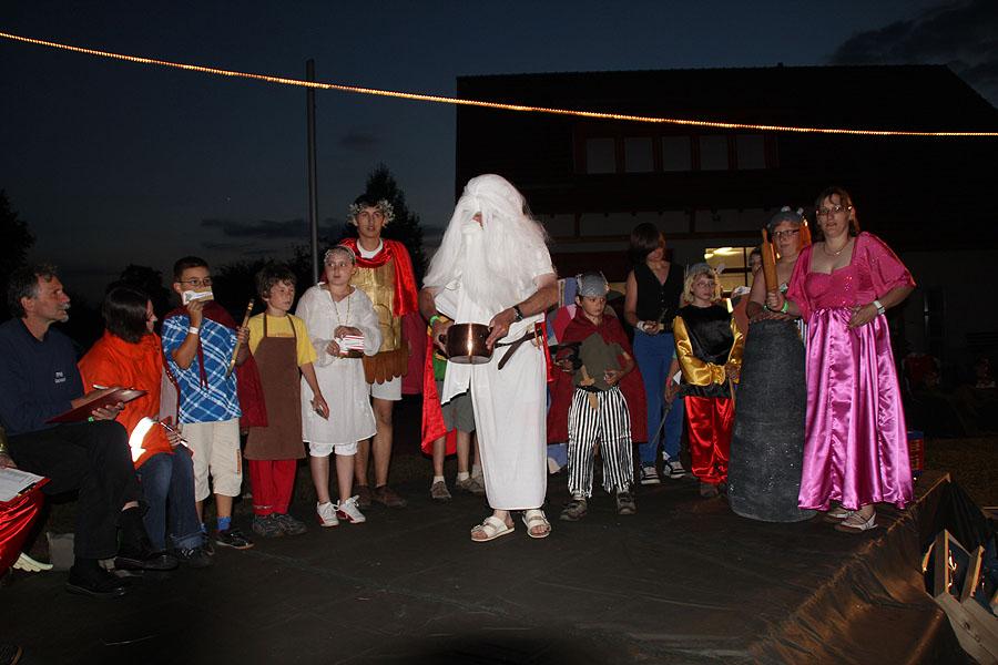 Bevor die Jugendlichen den Abend am Lagerfeuer beendeten, zeigten alle Jugendgruppen bei den "Gladiatoren-Wettkämpfen" ihre meist selbstgebastelten Verkleidungen rund um das Zeltlager-Motto "Römer und Gallier" und bewältigten in fünf Spielen beinahe unlösbare Aufgaben innerhalb einer kurzen Minute.