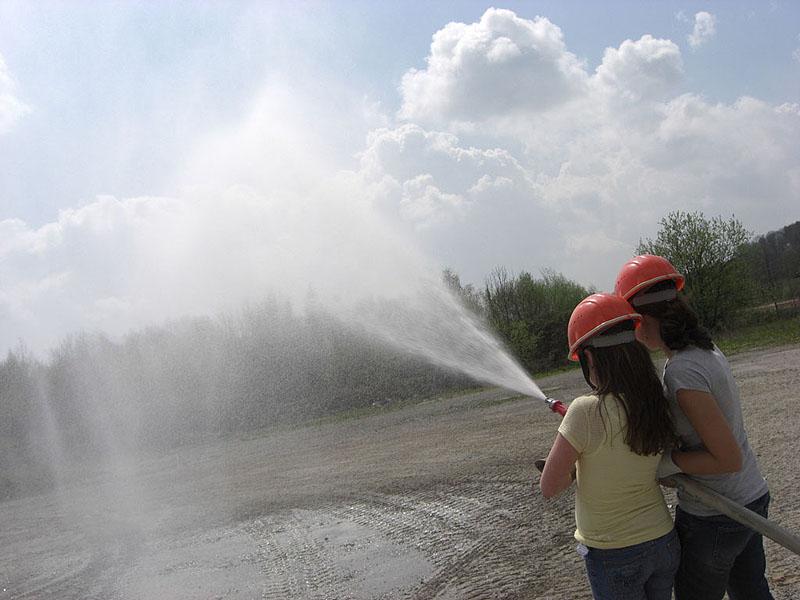 Unter Anleitung wurde dann von den Mädchen ein Löschangriff aufgebaut. Danach konnten nun die Vorführung von Staubexplosion, Flüssigkeitsbrand etc. gestartet werden. Das anschließende Spritzen und der Einsatz eines Schaumrohres wurde zum krönenden Abschluss des Tages. Um 15:00 Uhr war der Girls’ Day dann zu Ende. Die Mädchen bescheinigten den Betreuern durch ein kurzes Feedback vor der Verabschiedung, dass das Konzept „Feuerwehr erleben!“ aufgegangen ist.