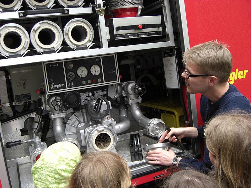 Die Mädchen staunten nicht schlecht was alles in so einem Feuerwehrauto zu finden ist. Spreitzer, Schere, Tragkraftspritze – alles neue Begriffe für die Mädchen, die ihnen von den Feuerwehrleuten aus Schwarzach erklärt wurden. Außerdem wurde auch noch die Schutzkleidung eines Feuerwehrmannes im Einsatz vorgestellt.