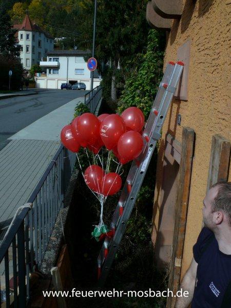 Die zweite Gruppe übte die Rettung einer verschütteten Person. Neben kleinen Bauspriesen wurde auch die Stabilisierung mittels Holzkeilen demonstriert. Um einen weiteren Bezug zum Lehrplan der Realschule (Auftrieb) zu erhalten wurde versucht den Verschütteten (ein kleiner Grisu) mit Hilfe von gasgefüllten Luftballons zu retten. Mit ca. 15 Ballons gelang die Rettung, für eine echte Person wären einige mehr notwendigJ.