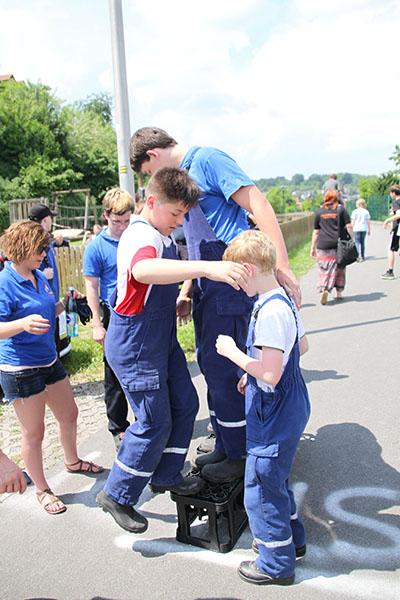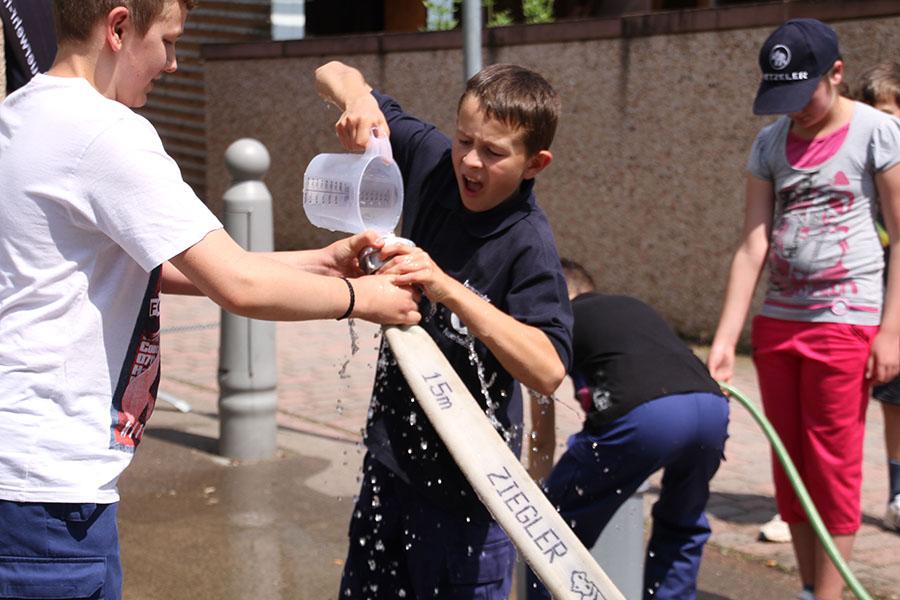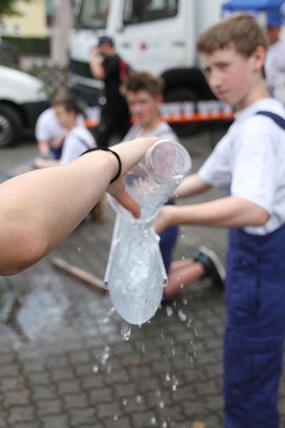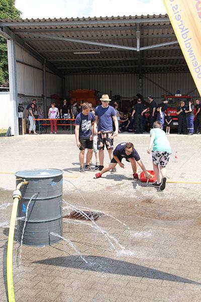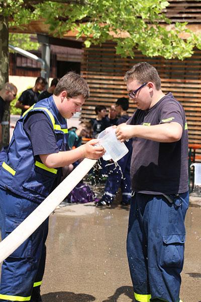 Vorher galt es allerdings bei strahlendem Sonnenschein und sommerlichen Temperaturen neun Spiele zu meistern: Autoreifen durch ein Ziel rollen, Fass abdichten, Kleiderbügel werfen, Kistenrennen, Wassertransport mit dem Schlauch, Armaturenpuzzle, Rinnenspiel, Schlauchflechten und Ringe werfen. Bei der anschließenden Siegerehrung erhielt die Jugendfeuerwehr Mömlingen zum 150. Geburtstag eine riesige Geburtstagskarte auf der alle Teilnehmer unterschrieben hatten. Die Jugendwartin Birgit Babilon wurde mit der Ehrennadel der Jugendfeuerwehr Bayern ausgezeichnet und Peter Nies erhielt von den drei Kreisjugendfeuerwehren eine Ehrung für sein langjähriges Engagement bei der Ausrichtung der Dreiländertreffens und des Spiel ohne Grenzen über Grenzen.
