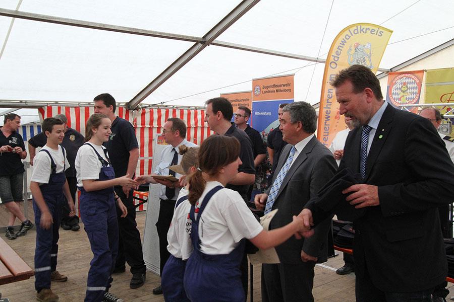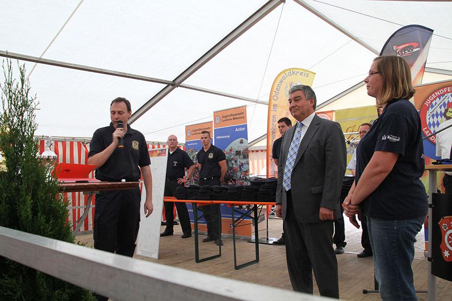 Der Kreisjugendfeuerwehrwart des Landkreises Miltenberg, Wolfgang Schmitt, begrüßte unter den Ehrengästen aus den drei Landkreisen auch Landrat Dr. Achim Brötel, der als Vertreter der Landräte den Jugendlichen viel Spaß und Erfolg bei den Spiele wünschte. Brötel hoffte außerdem, dass der Pokal vielleicht am Abend wieder in den Neckar-Odenwald-Kreis fahren dürfe.