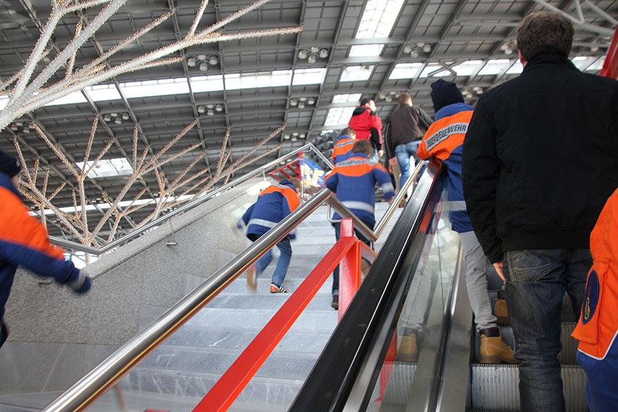 Nach einem ersten Rundgang durch den Flughafen und einen Besuch auf der Besucherterrasse ging's für die Jugendlichen zur Personalkontrolle in Terminal 4. Die Kontrolle förderte keine gefährlichen Gegenstände oder Flüssigkeiten zutage, so dass die 25-köpfige Gruppe mit einem Bus über das Vorfeld zur Feuerwache gefahren werden konnte.