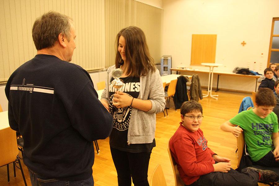 Der stellvertretende Stadtbrandmeister Friedbert Rösch überreichte Jana Grimm den Wanderpokal für außergewöhnliche Leistungen in der Jugendfeuerwehr und bedankte sich bei den Jugendlichen für ihr Engagement. Bevor der Abend mit einigen Spielen endete, bedankte sich Jugendgruppenleiter Arno Noe bei den Jugendlichen und seinen Unterstützern Mathias Wegner, Josua Fischer, Eric Schilling, Fabian Wittemann, Nikolaus Klasan und Matthias Grimm für die Arbeit im vergangenen Jahr. Die Jugendlichen wollten der Dankesrunde ebenfalls nicht nachstehen und überreichten den Jugendgruppenleitern ein kleines Dankeschön.