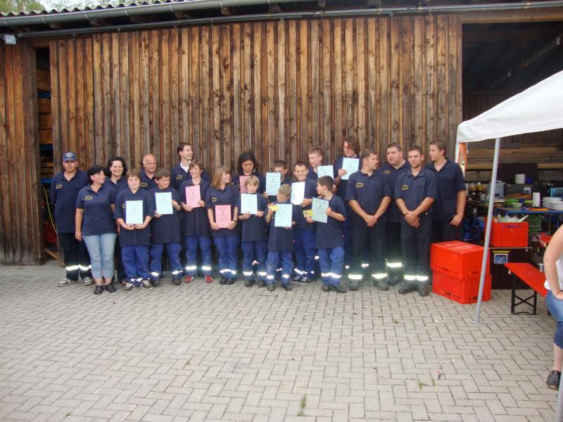 Zunächst stand die Übergabe der „Jugendflamme“ mit der Urkunde an. Wir hatten alle die Aufgaben hervorragend geschafft. Auch unser Bürgermeister Norman Link und Kommandant Dieter Hafner sprachen noch einige Worte an uns. Danach wurde noch kurz ein Gruppenbild gemacht und dann ging es an die „Sau“. Nach dem gemeinsamen Essen war der Abend noch lange nicht vorbei. Als es dunkel wurde führten wir unseren Eltern die gelernten Lagerfeuerlieder vor. Alle mussten viel Lachen über die eigenartigen Lieder. So ließen wir den Abend ausklingen.