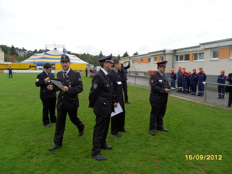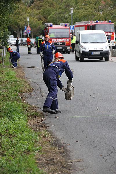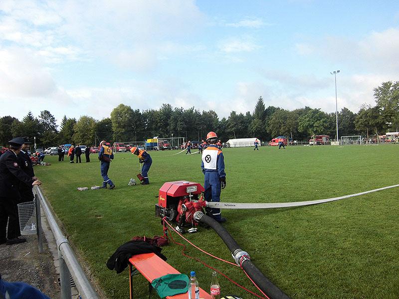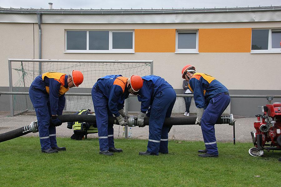 Rund 15 Minuten fühlte sich jede Gruppe wie in der Schule und musste Fragen zu allerlei verschiedenen Themen, wie zum Beispiel Politik, Feuerwehr, Allgemeinbildung und aktuelle Themen, beantworten. Die Königsdisziplin stellt der Löschangriff nach der aktuellen Feuerwehrdienstvorschrift dar. Möglichst ohne Fehler gilt es dabei eine Wasserversorung aufzubauen und von einem offenen Gewässer Wasser zu entnehmen und dieses mittels Verteiler und Schläuchen von drei Stellen an die angenommene Brandstelle zu bringen.