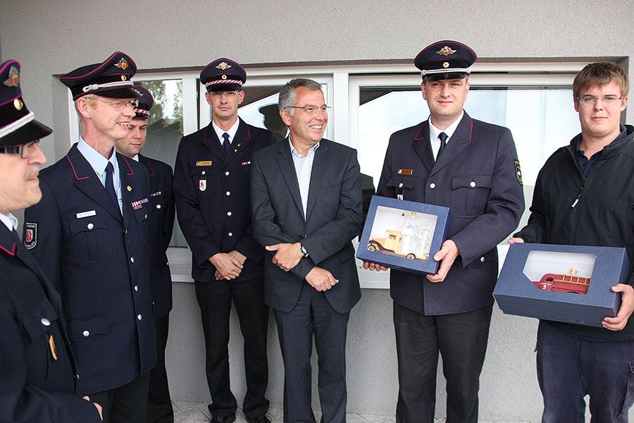 Vor der Siegerehrung bedankte sich Kreisjugendwart Gregor Wipfler bei den Jugendlichen für ihre Teilnahme und der Feuerwehr Sinsheim für die Vorbereitung der Abnahme. Landrat Stefan Dallinger freut sich über die stattliche Anzahl der Jugendlichen, die mit dem Ablegen der Jugendleistungsspange den ersten Schritt für das Amt des Landrats geschafft hätten. Er selbst habe vor vielen Jahren bei der Jugendfeuerwehr die Leistungsspange abgelegt. Regionalvertreter Nikolaus Klasan verabschiedete die beiden Abnahmeberechtigten in den wohlverdienten "Unruhestand". Nach 19 Jahren (Ralf Tiemann) und 30 Jahren (Wolfgang Eberle) im Dienste der Deutschen Jugendfeuerwehr haben sich beide das Präsent redlich verdient.