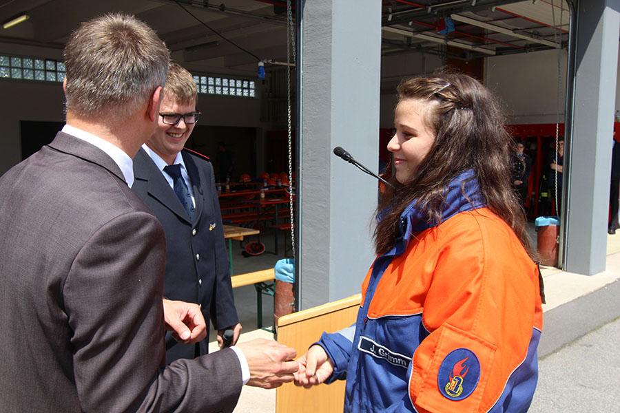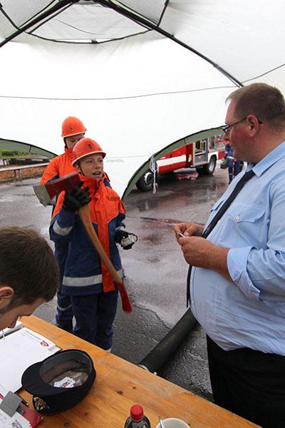 Bei der Verleihung der Abzeichen konnte Kreisjugendfeuerwehrwart Pierre Herre den Jugendlichen durchweg gute Leistungen attestieren und Bürgermeister Rippberger forderte die Jugendlichen auf, der Jugendfeuerwehr die Treue zu halten, da die Jugend der Nachwuchs der Einsatzabteilungen sei und "Eure Gemeinde sehr froh über Euer Engament ist", so Rippberger. Kreisjugendwart Herre bedankte sich bei der ausrichtenden Feuerwehr Mudau und versprach für die nächste Abnahme, besseres Wetter zu bestellen.