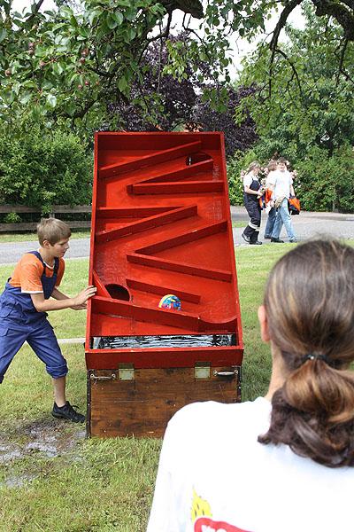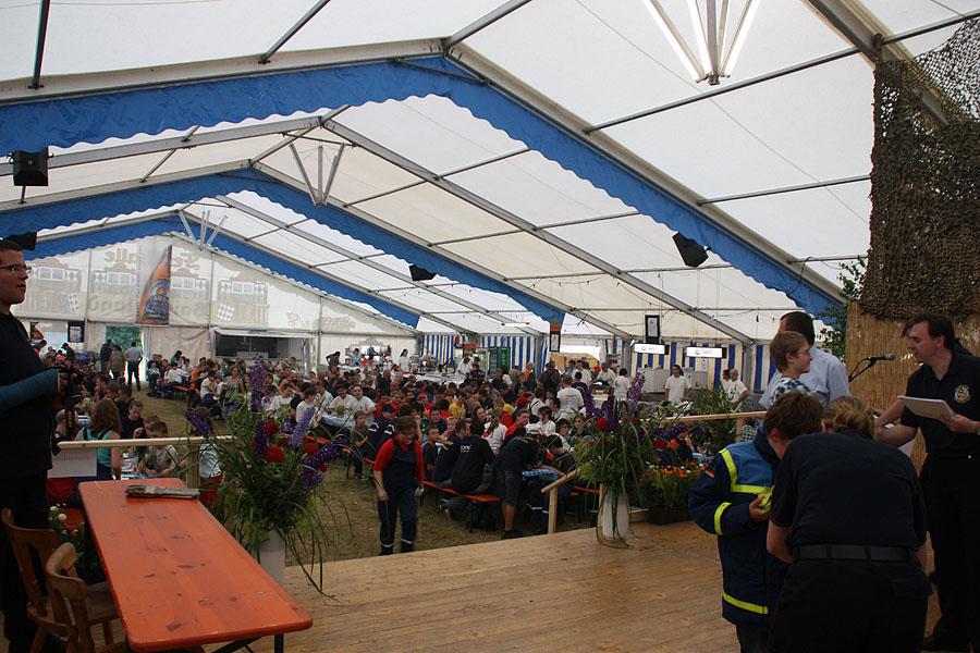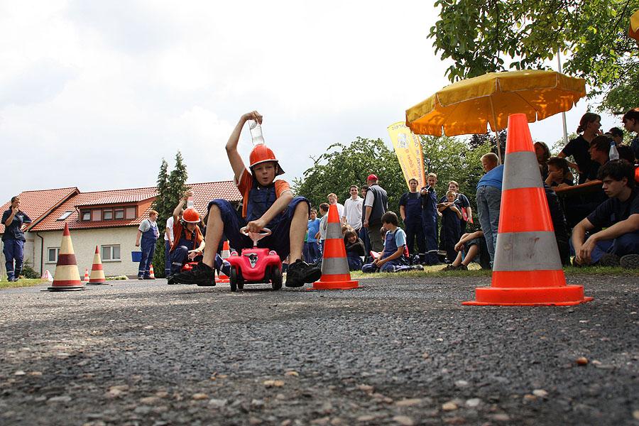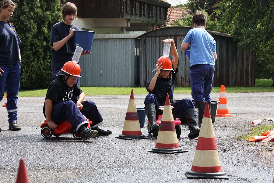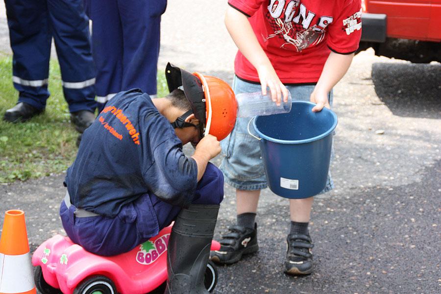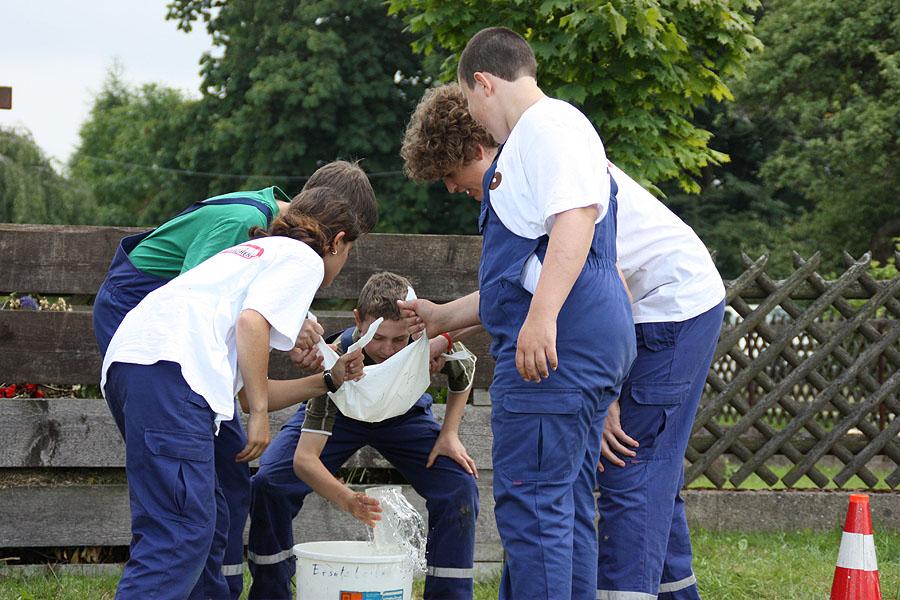 Bei dem Rundweg durch Preunschen galt es, neun anspruchsvolle Aufgaben zu erfüllen und mit möglichst vielen Punkten auf den Festplatz zurück zu kommen. Beim "Champagner-Lauf" mussten die Teilnehmer möglichst viel Wasser mit einem Stück Plane durch einen Parcours transportieren. Die Merkfähigkeit war beim "Gegenstände merken" äußerst hilfreich, da es galt so viele Feuerwehrutensilien wie möglich aus dem Kopf zu benennen, die nach 15 Sekunden mit einer Decke abgedeckt wurden. Mit zwei Bobby-Cars mussten die Mädchen und Jungen Wasser durch einen Slalom-Parcours transportieren, das in ein Gefäß auf dem Helm gefüllt wurde.