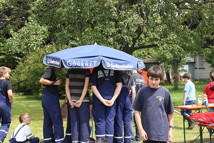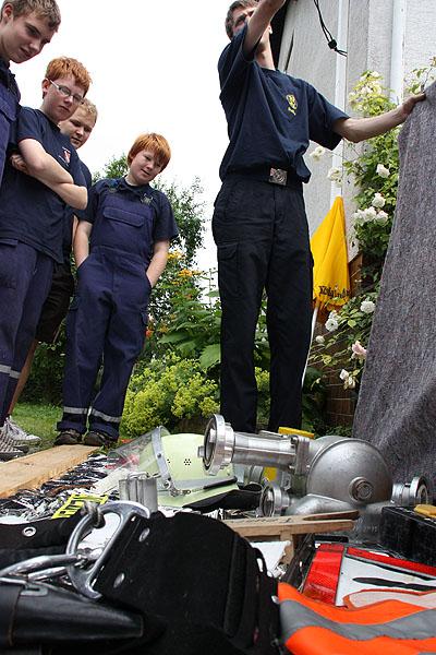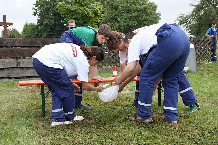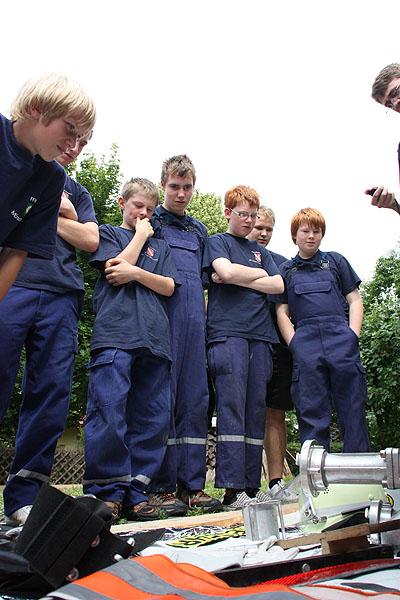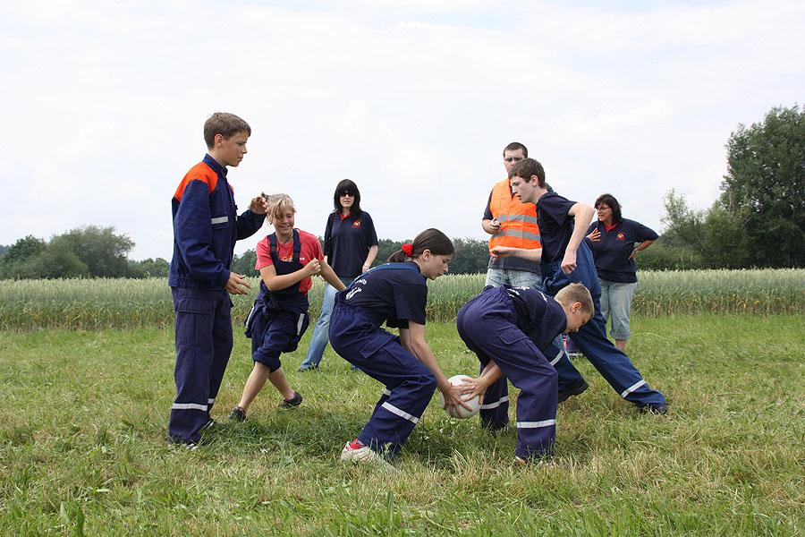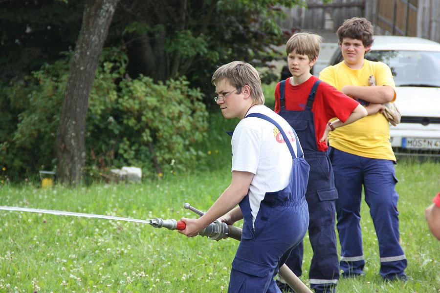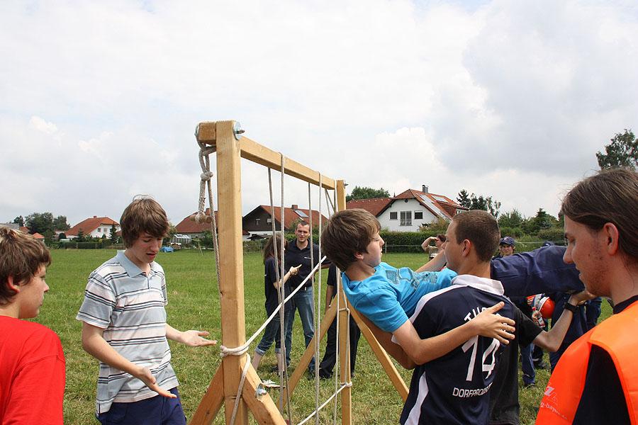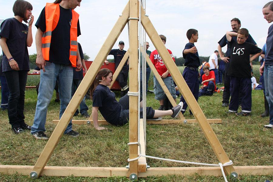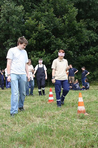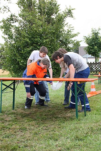 Beim Wasserflipper konnten die Jugendlichen ihr Können mit dem Feuerwehrschlauch zeigen. Am Spinnennetz war kluges Planen und Gewandheit Trumpf; fünf Jugendliche mussten durch ein Spinnennetz mit engen Maschen steigen, klettern oder gehoben werden, wobei jedes Loch im Netz nur einmal benutzt werden konnte. Beim "Durchgebe-Rennen" mussten die Jugendlichen einen Ball mal über dem Kopf mal durch die Beine nach hinten weitergeben und dabei eine Strecke von 20 Metern überwinden. Auf Gras-Skiern musste eine Kiste umrundet und bei der "Blindenstrecke" ein Parcours nur mit Anleitung durch eine zweite Person überwunden werden.