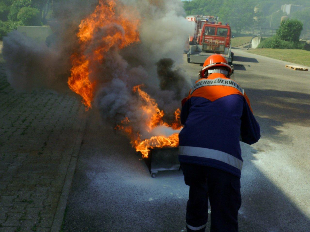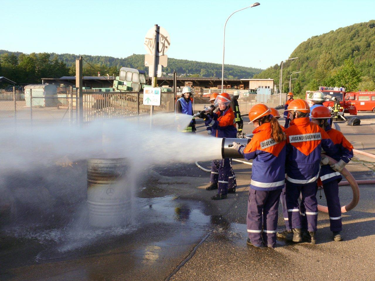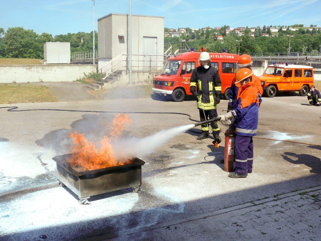 Nach dem verdienten Frühstück stand Ausbildung auf dem Plan. In der Kläranlage Obrigheim, ging es darum den korrekten Umgang mit Feuerlöschern zu trainieren. Während die ersten Versuche nur teilweise von Erfolg gekrönt waren, wurde es von Zeit zu Zeit besser. Immer sicherer beherrschten die Kids den Umgang mit Pulver bzw. CO²-Feuerlöschern.