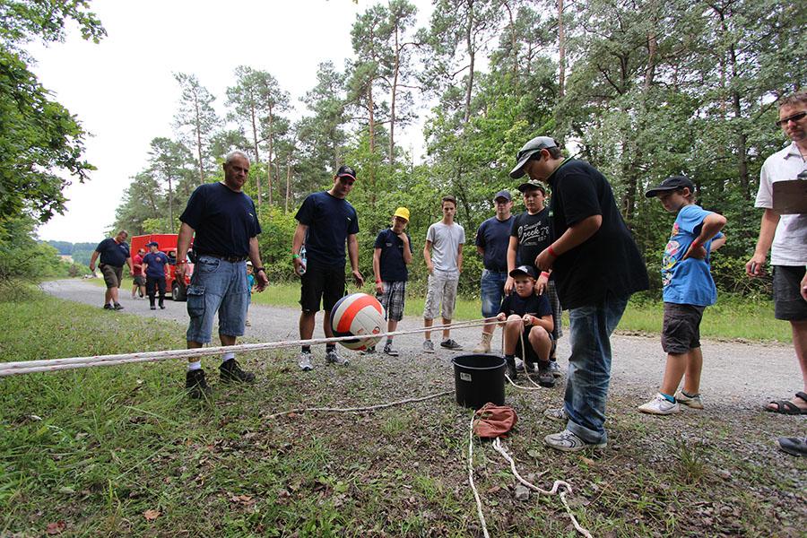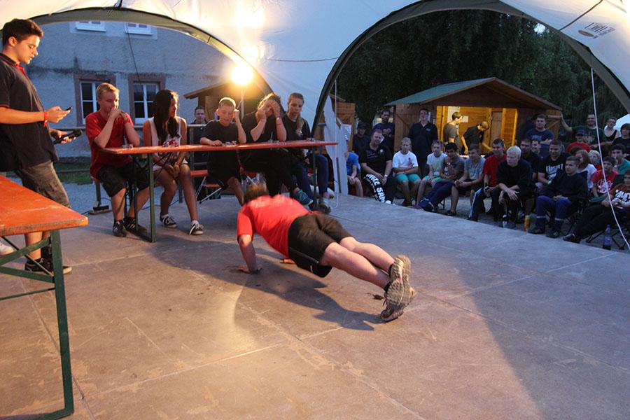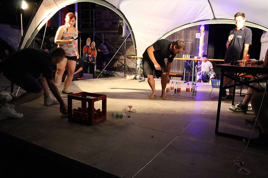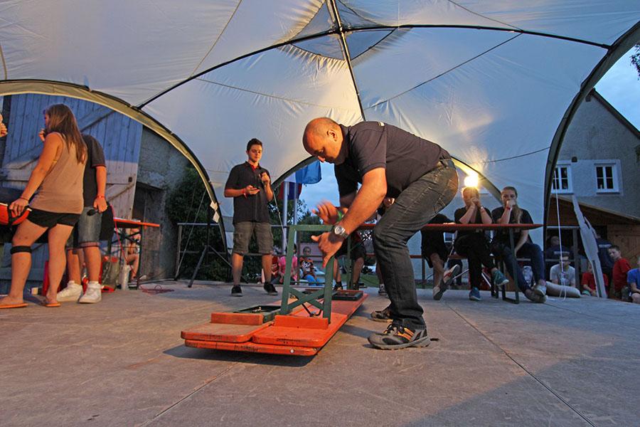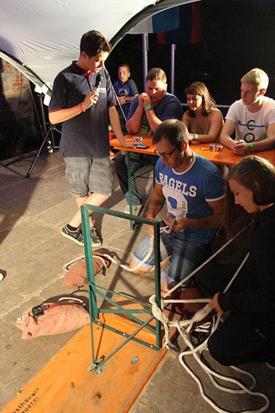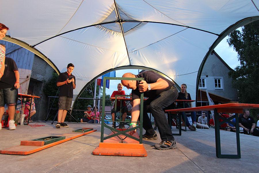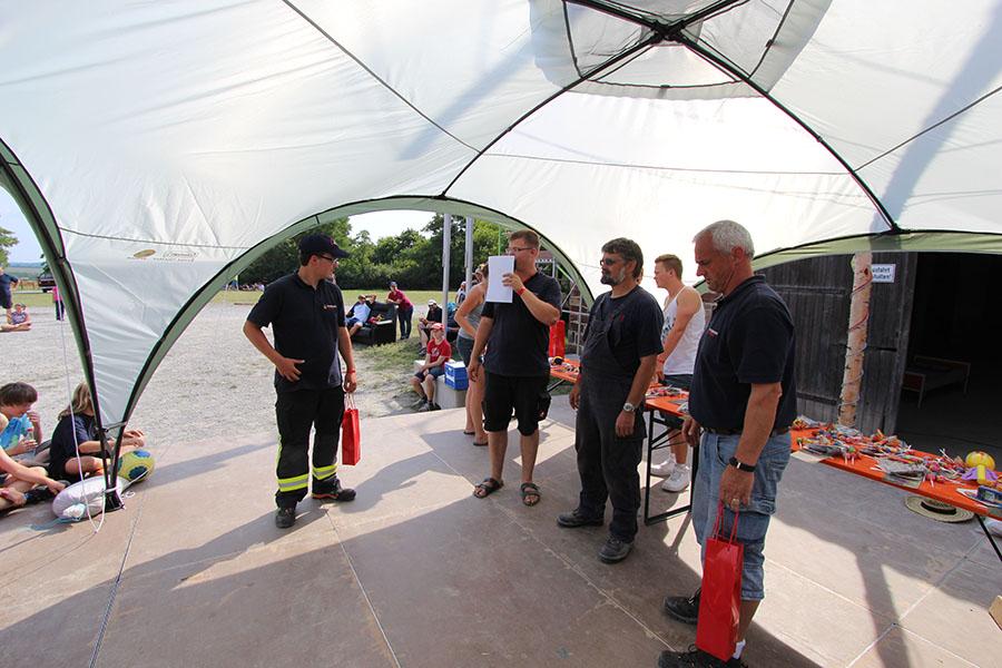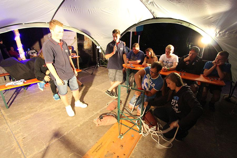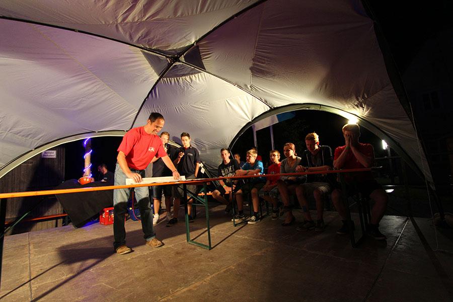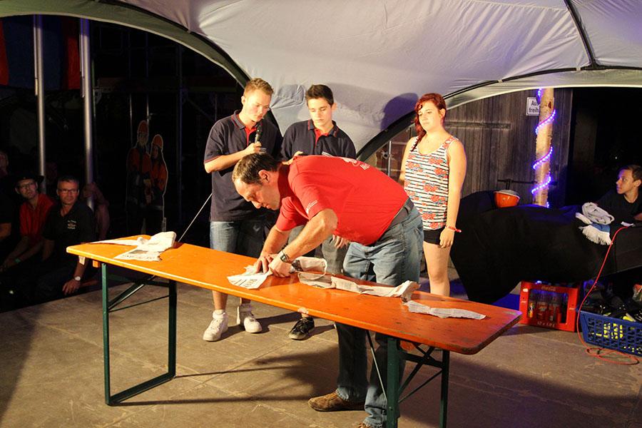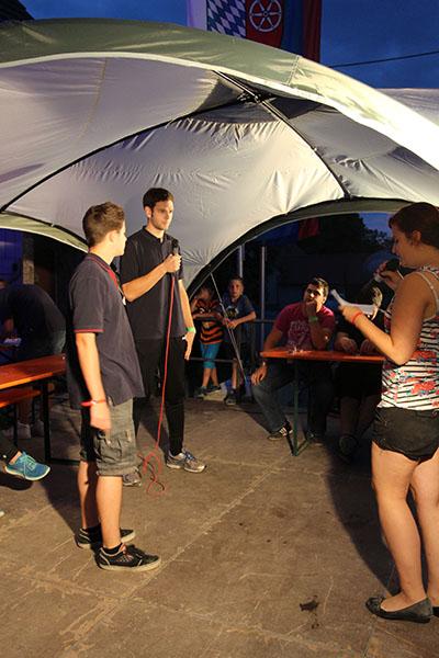 Anschließend übernahmen die Jugendsprecher der Feuerwehren das Ruder und unterhielten die Zeltlager-Teilnehmer mit „Mein Betreuer kann“, einer Abwandlung der Fernseh-Show „Mein Mann kann“. Nach insgesamt 16 knackigen Spielen konnte der Betreuer der Jugendfeuerwehr Donebach-Mörschenhardt ganz knapp das Finale für sich entscheiden.