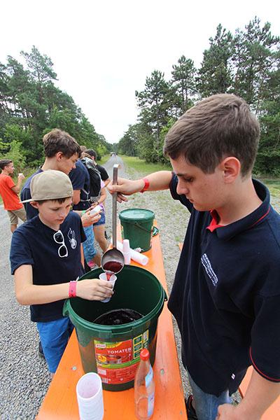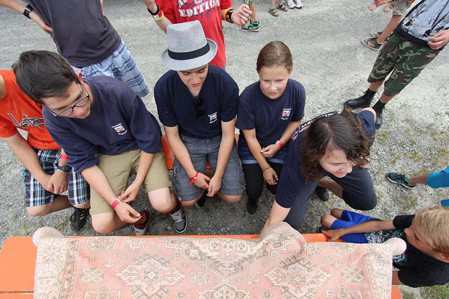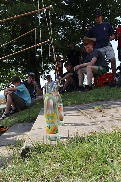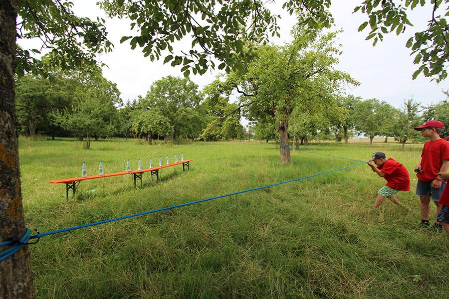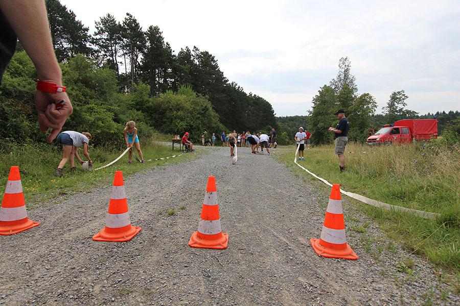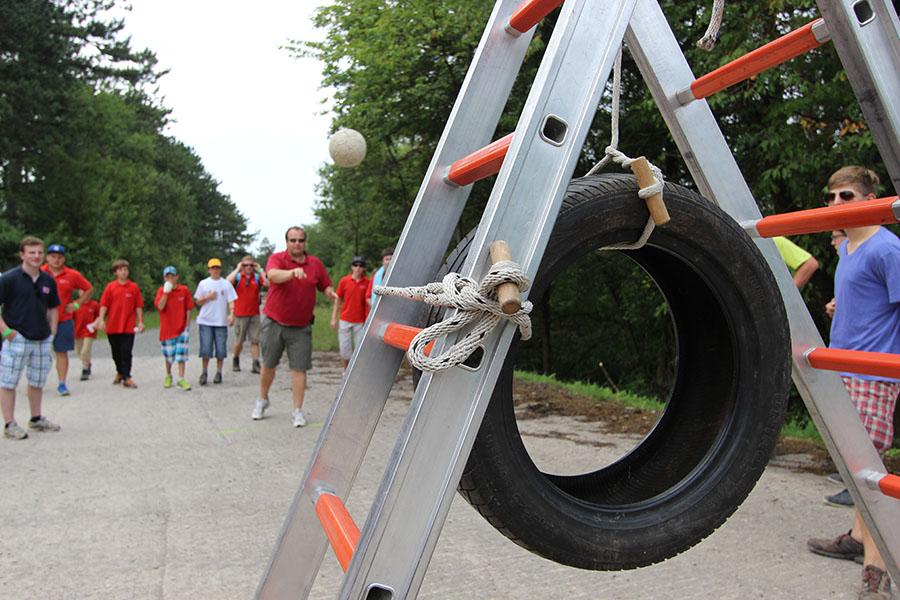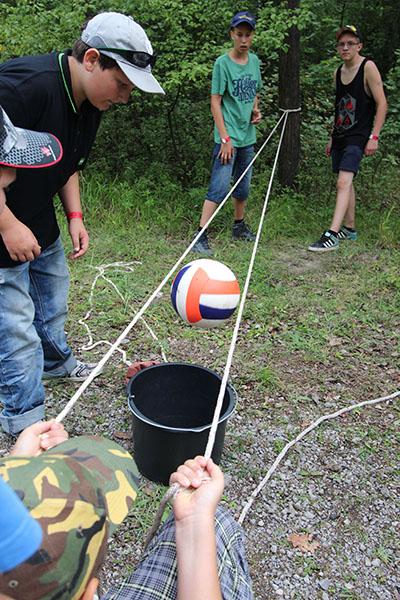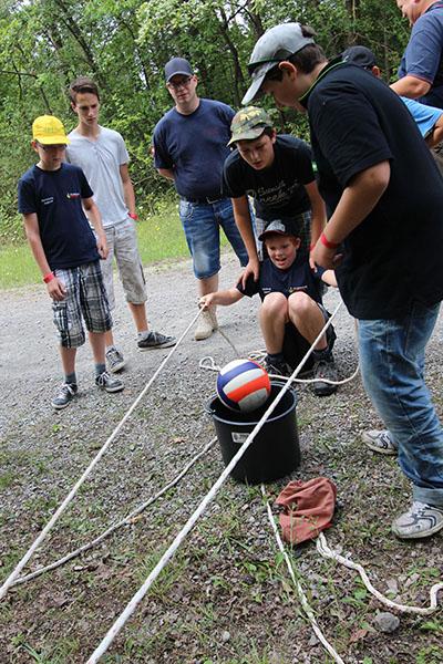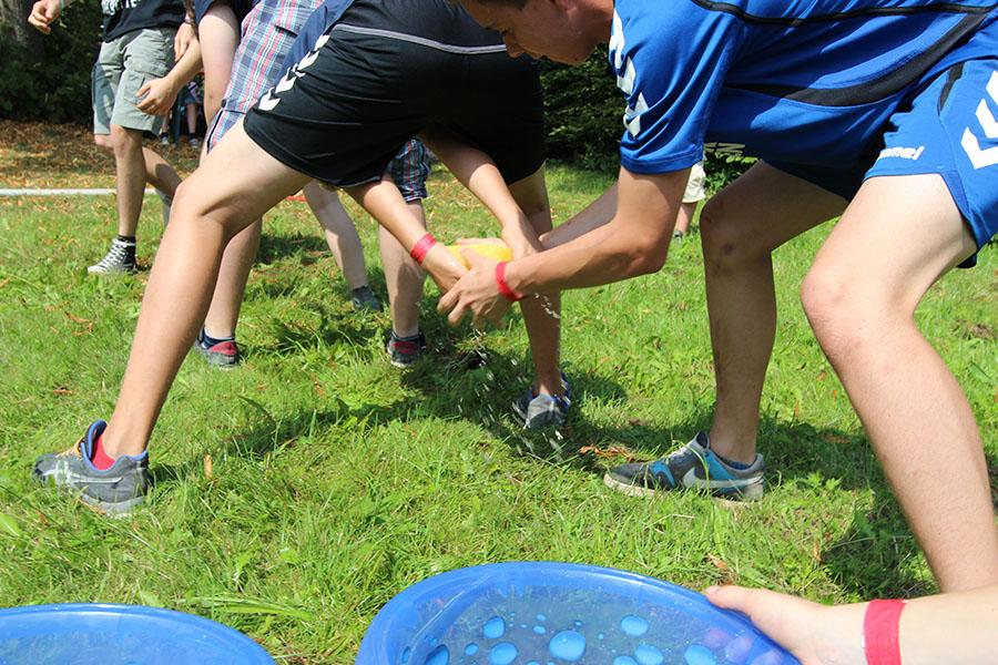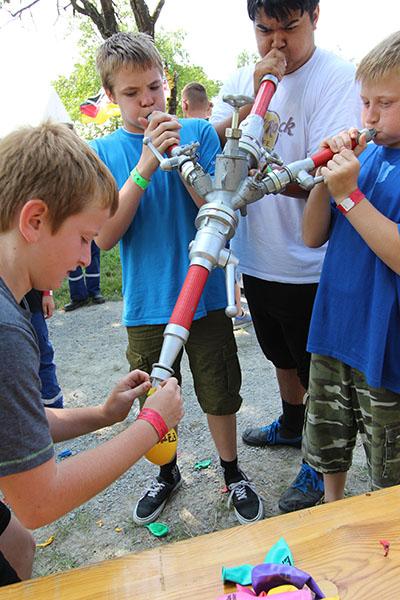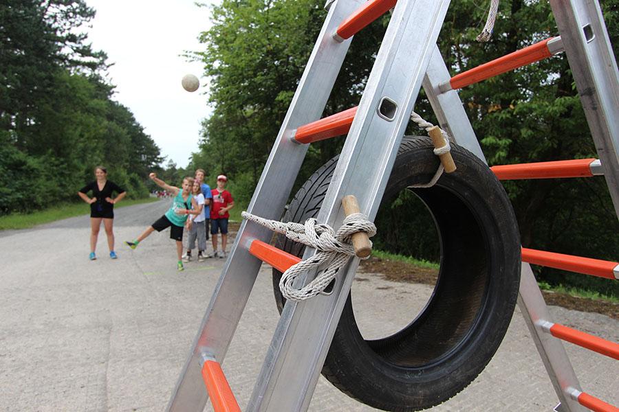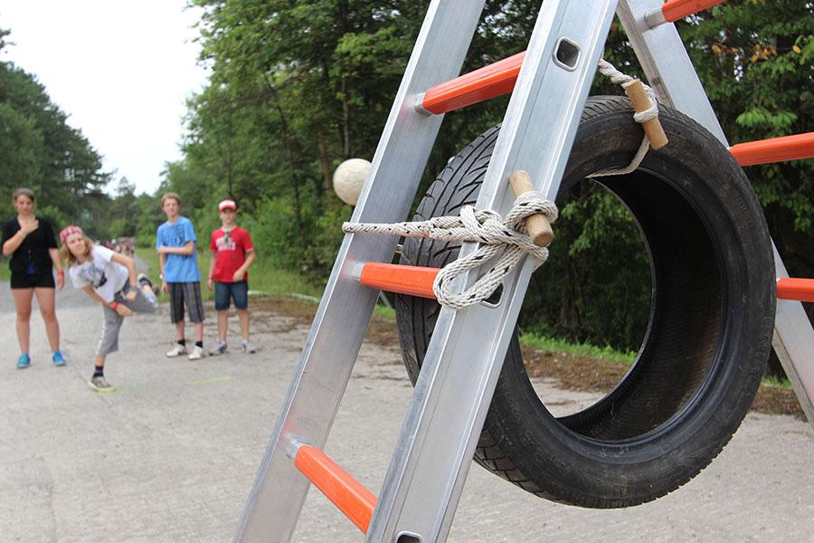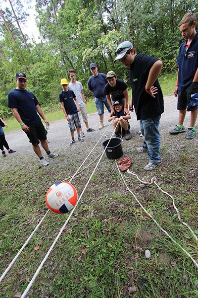 Der Sonntag gehörte - nur unterbrochen durch das Mittagessen - der Lagerolympiade, bei der die Jugendlichen an insgesamt neun Spielstationen ihr Können unter Beweis stellen mussten. Dazu musste Wasser durch Dachrinnen und mit Schwämmen transportiert werden, Armaturen zusammen gepuzzelt, Tennis-Bälle gesucht, mit einem "A" gelaufen, Bälle auf einer Krankentrage balanciert, Luftballons durch einen Verteiler aufgeblasen und „Flaschen geangelt“ werden.