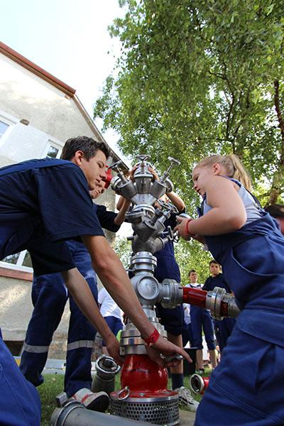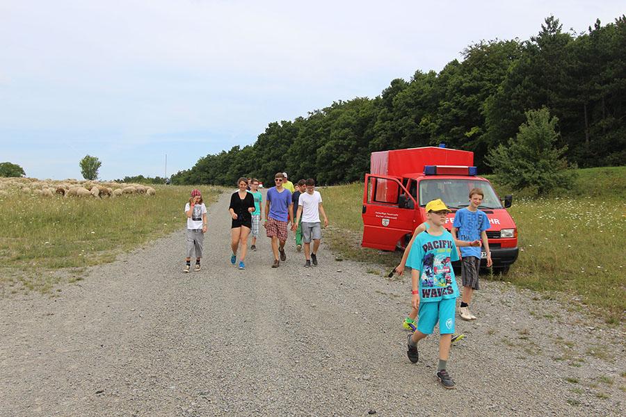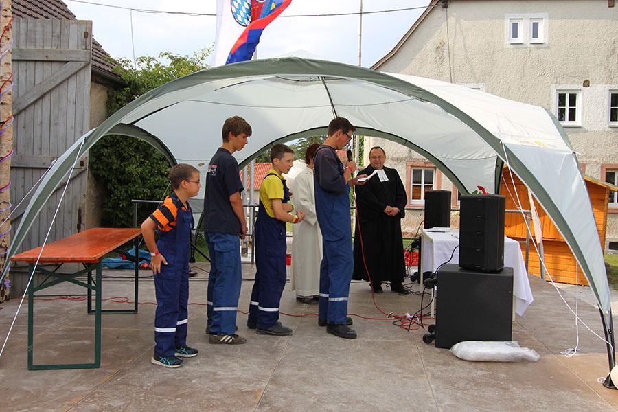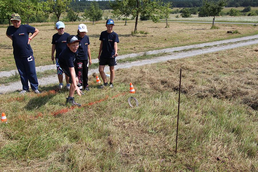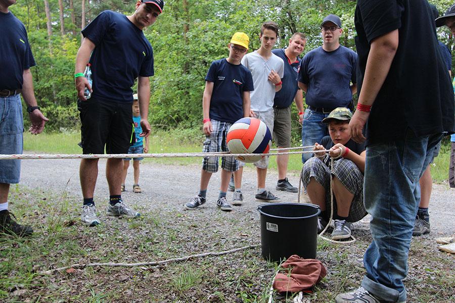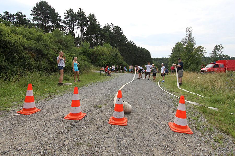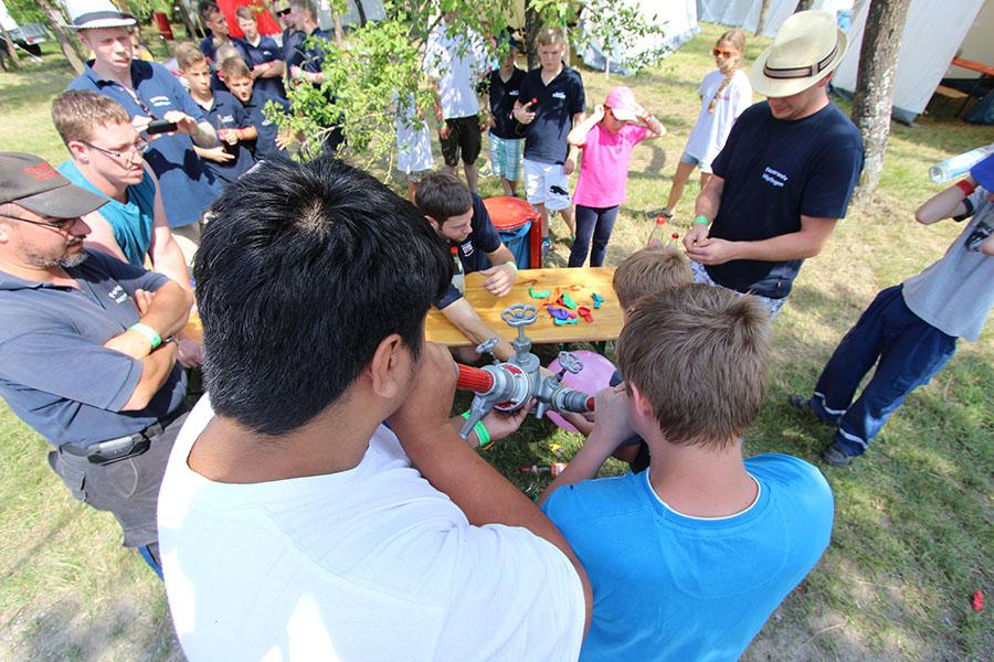 Am Samstag startete nach dem Frühstück die Erlebniswanderung über den Standortübungsplatz mit verschiedenen feuerwehrtechnischen und allgemeinen Spielen: Geräte ertasten, Hufeisen werfen, Ball-Weitergabe, Schlauchkegeln, Ball balancieren, Riesen-Jenga, Ball durch Reifen und Feuerpatschen-Golf. Nach dem Mittagessen und einiger Zeit zur freien Verfügung, feierten Gemeindereferentin Ursula Butterweck und Pfarrer Karl Kreß am Abend mit Begleitung der "Young Musicians" von der Walldürner Höhe einen ökumenischen Wortgottesdienst und beleuchteten dabei das Thema „Drehleiter" und Aufstieg in den Himmel bei den Feuerwehren und Jugendfeuerwehren im Landkreis.