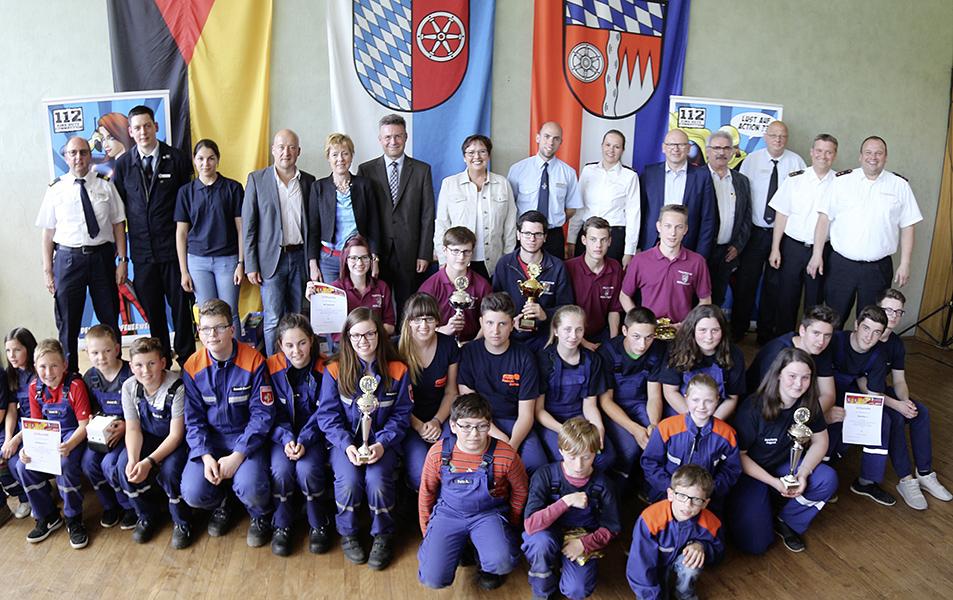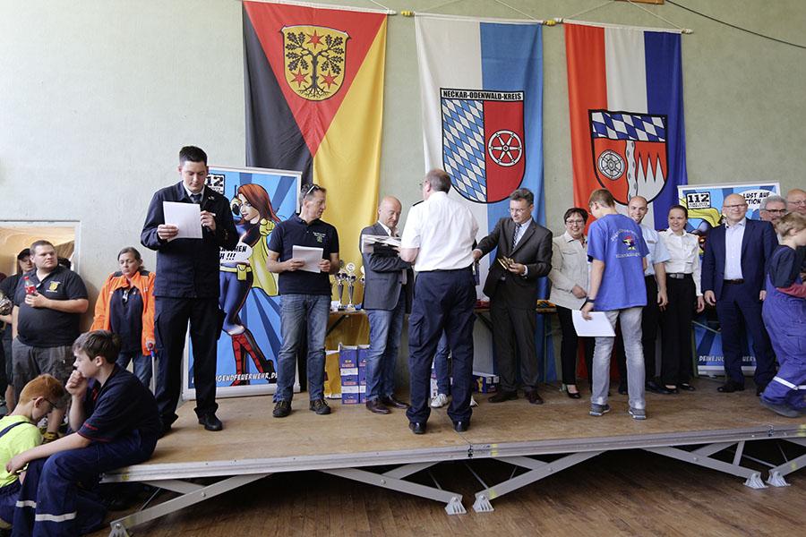 Die Kreisjugendfeuerwehrwarte und die Ehrengäste überreichten den Jugendlichen die Preise und Urkunden für ihre Teilnahme am mittlerweile 27. Spiel ohne Grenzen über Grenzen. Die Pokale gingen an Bürgstadt (Lkr. Miltenberg), Buchen (Neckar-Odenwald-Kreis) und Röllbach I (Lkr. Miltenberg). Die weiteren Platzierungen der Mannschaften aus dem Neckar-Odenwald-Kreis: 4. Walldürn, 5. Auerbach I, 9. Ravenstein-Merchingen, 26. Rosenberg-Hirschlanden, 31. Buchen II, 34. Osterburken, 43. Walldürn-Rippberg, 44. Auerbach II, 45. Merchingen & Hirschlanden.