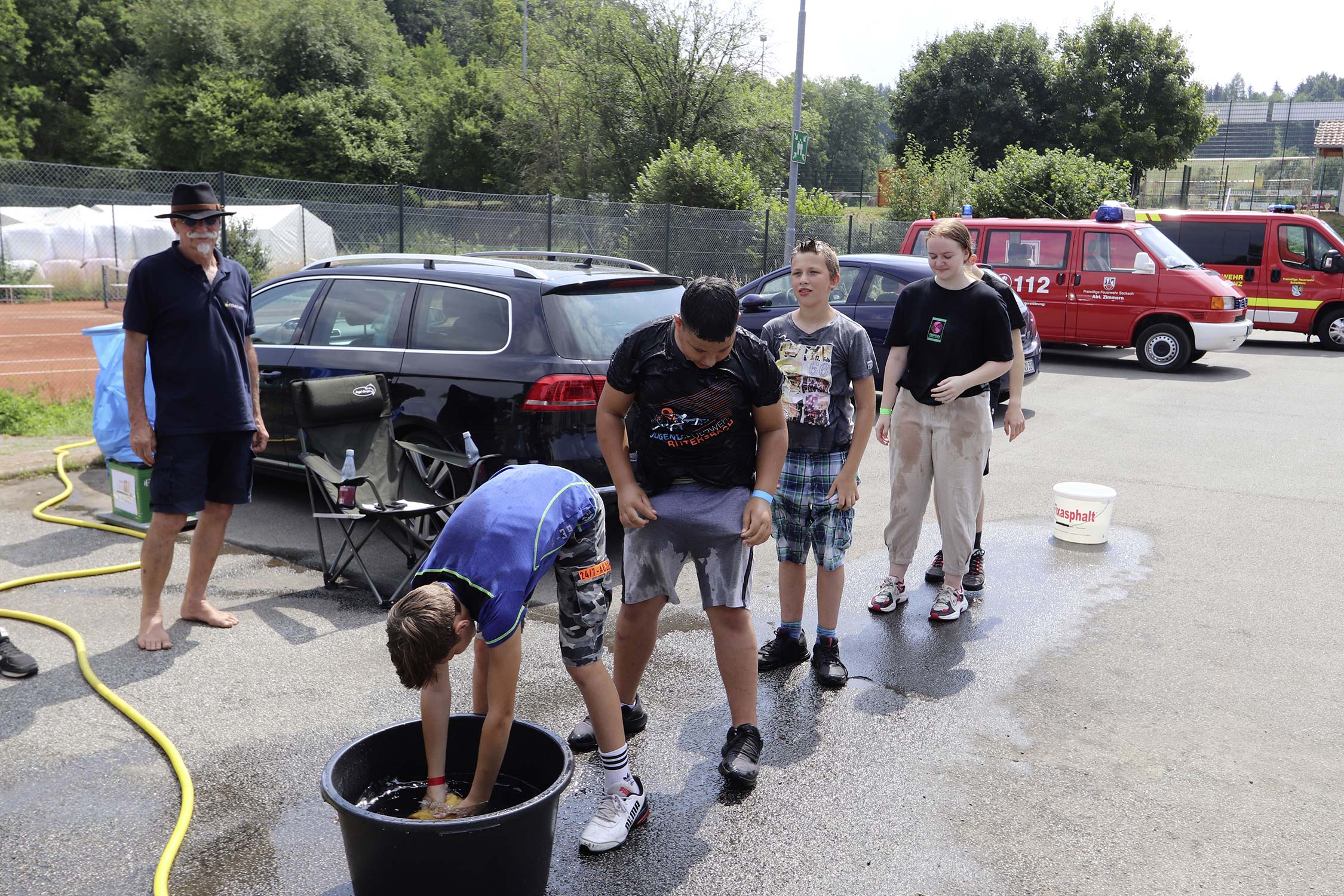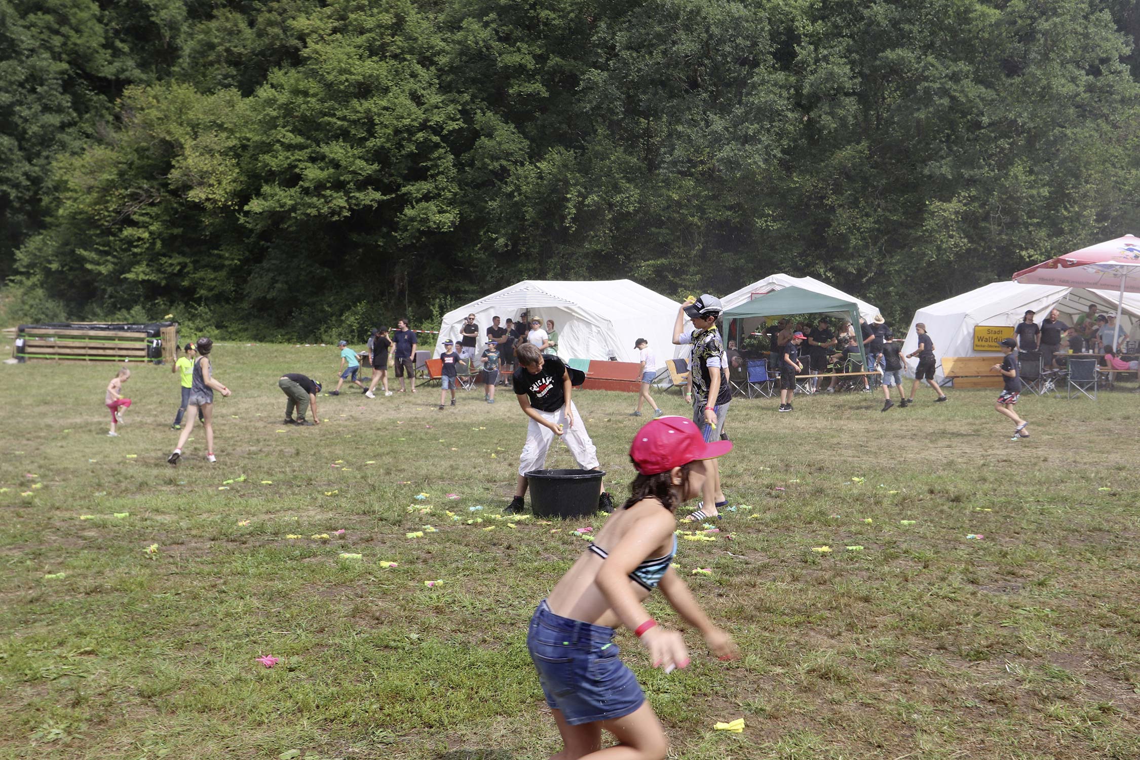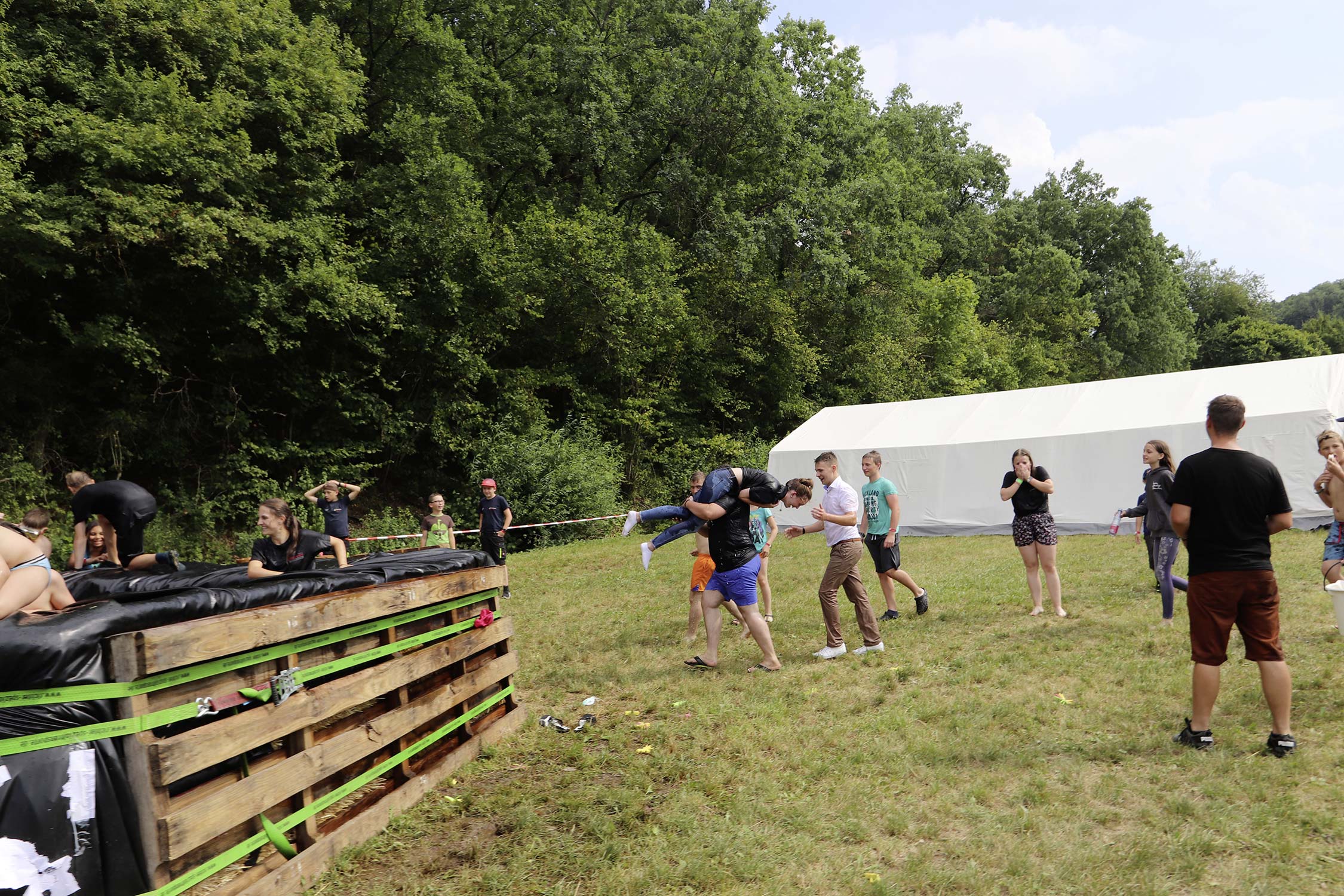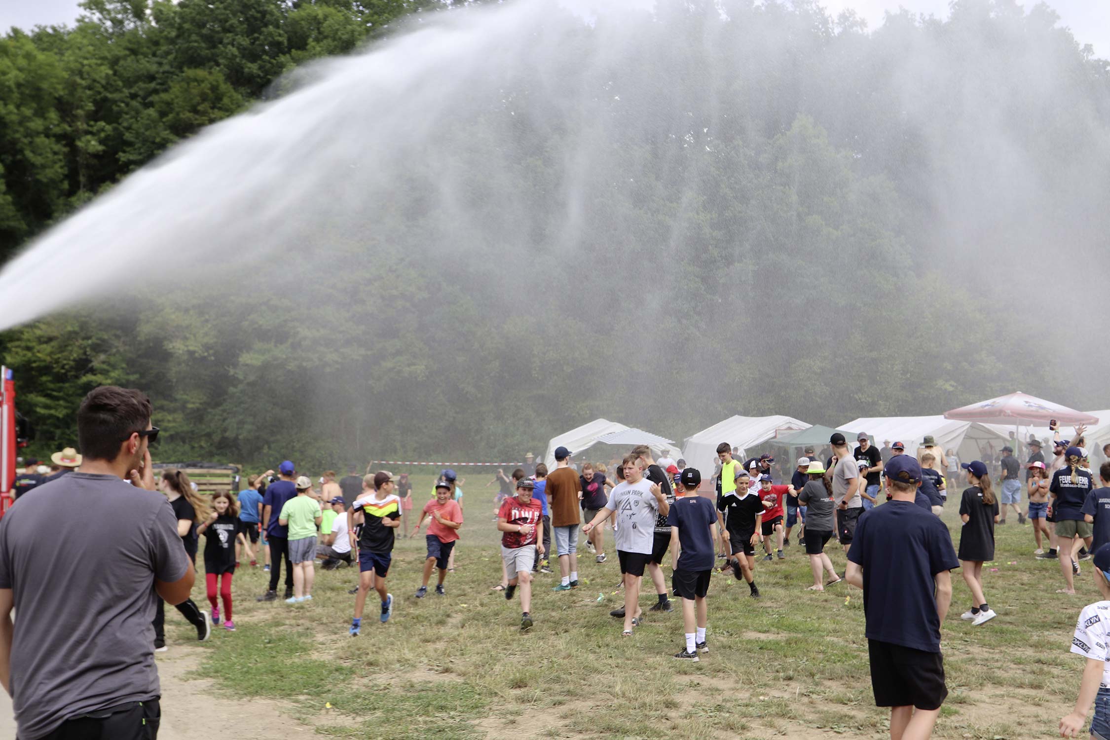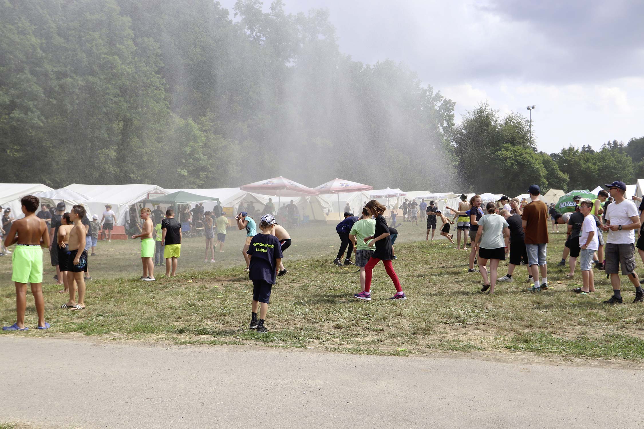 Am Samstag startete nach dem Frühstück die traditionelle Erlebniswanderung rund um Auerbach mit verschiedenen Spielstationen: Wassertransport mit dem Schwamm, Ball über Schnur, Beanbag-Zielwerfen, Eierlaufen, dem Schrauben-und-Muttern-Spiel, Flaschen schießen, Ball in Eimer und Tennisgolf. Nach der Rückkehr und dem Mittagessen stand ein Kooperationsspiel für alle Zeltlager-Teilnehmer auf dem Programm. Das vermeintliche Spiel entpuppte sich schnell als Wasserüberraschung aus dem Tanklöschfahrzeug der Feuerwehr Limbach. Als Dank wurde nicht nur der Moderator des Spiels im Wasserregen oder im Pool, den die Jugendfeuerwehr Auerbach auf dem Platz eingerichtet hatte, pitschnass. Nachhaltige Wasserbomben komplettierten die spaßige Wasserschlacht bei tropischen Temperaturen.