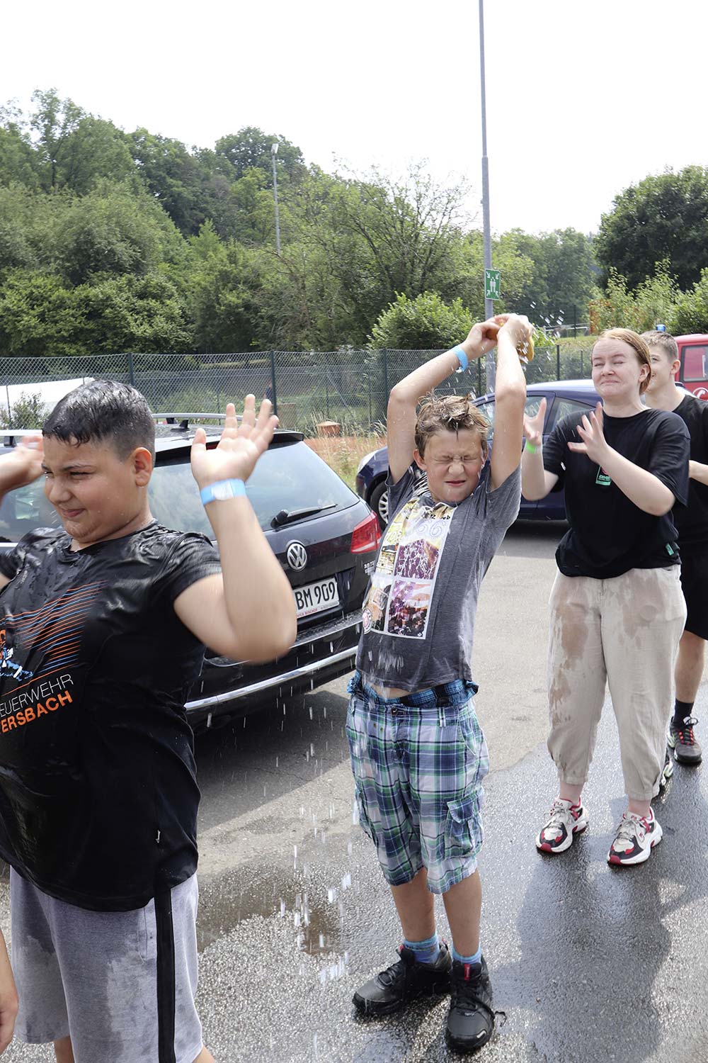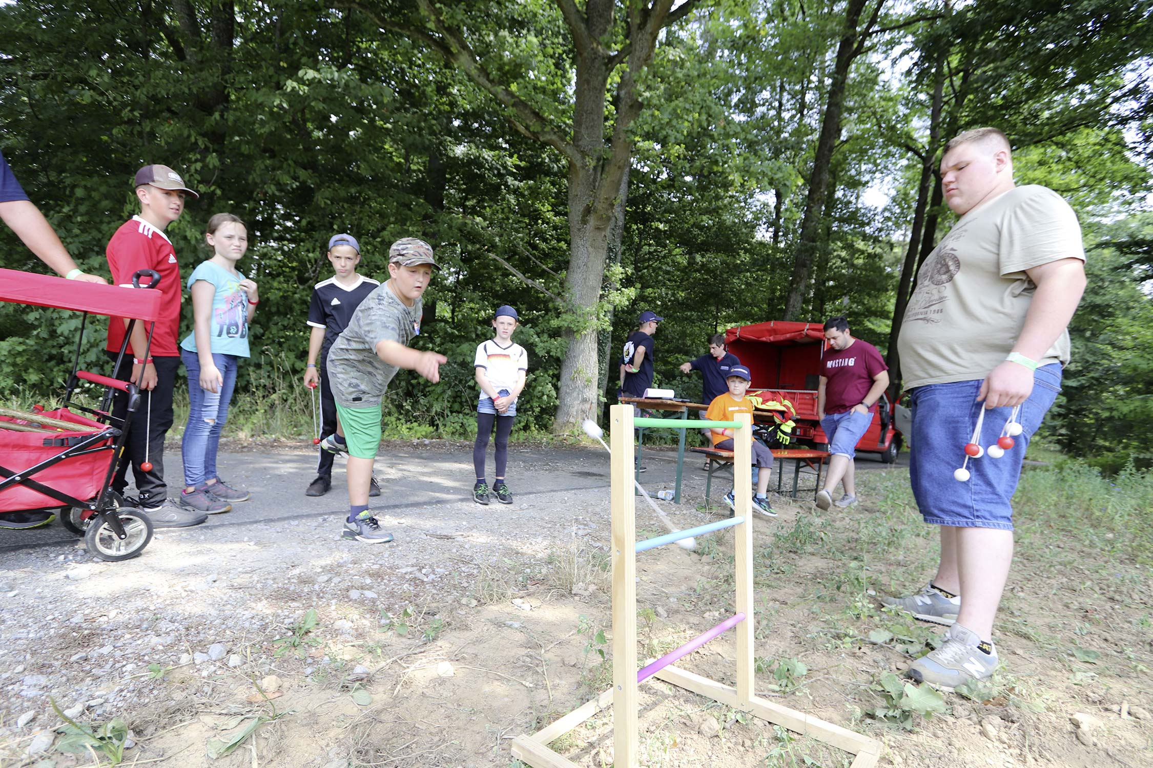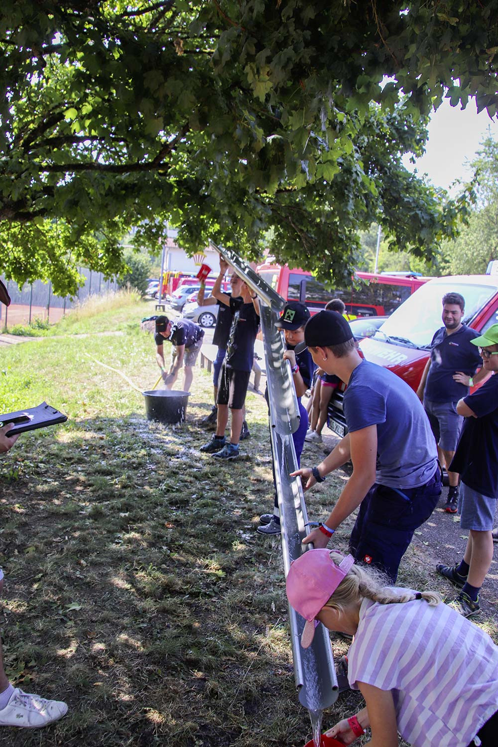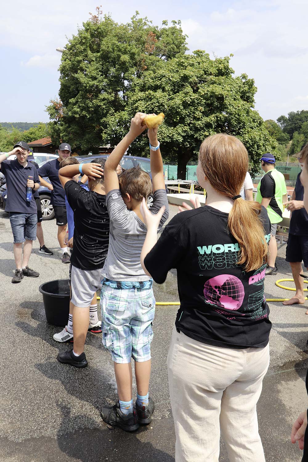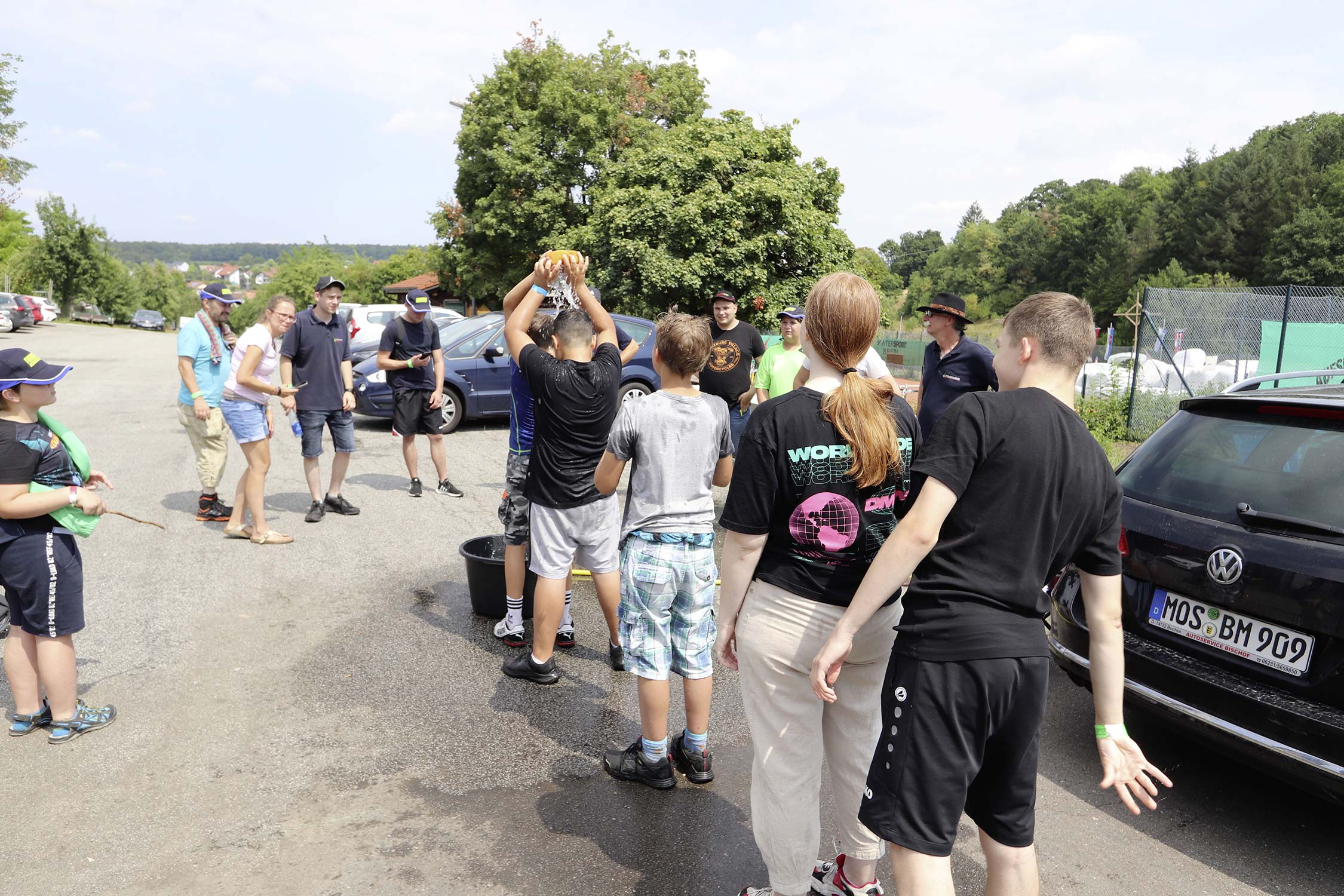Am Samstag startete nach dem Frühstück die traditionelle Erlebniswanderung rund um Auerbach mit verschiedenen Spielstationen: Wassertransport mit dem Schwamm, Ball über Schnur, Beanbag-Zielwerfen, Eierlaufen, dem Schrauben-und-Muttern-Spiel, Flaschen schießen, Ball in Eimer und Tennisgolf. Nach der Rückkehr und dem Mittagessen stand ein Kooperationsspiel für alle Zeltlager-Teilnehmer auf dem Programm. Das vermeintliche Spiel entpuppte sich schnell als Wasserüberraschung aus dem Tanklöschfahrzeug der Feuerwehr Limbach. Als Dank wurde nicht nur der Moderator des Spiels im Wasserregen oder im Pool, den die Jugendfeuerwehr Auerbach auf dem Platz eingerichtet hatte, pitschnass. Nachhaltige Wasserbomben komplettierten die spaßige Wasserschlacht bei tropischen Temperaturen.