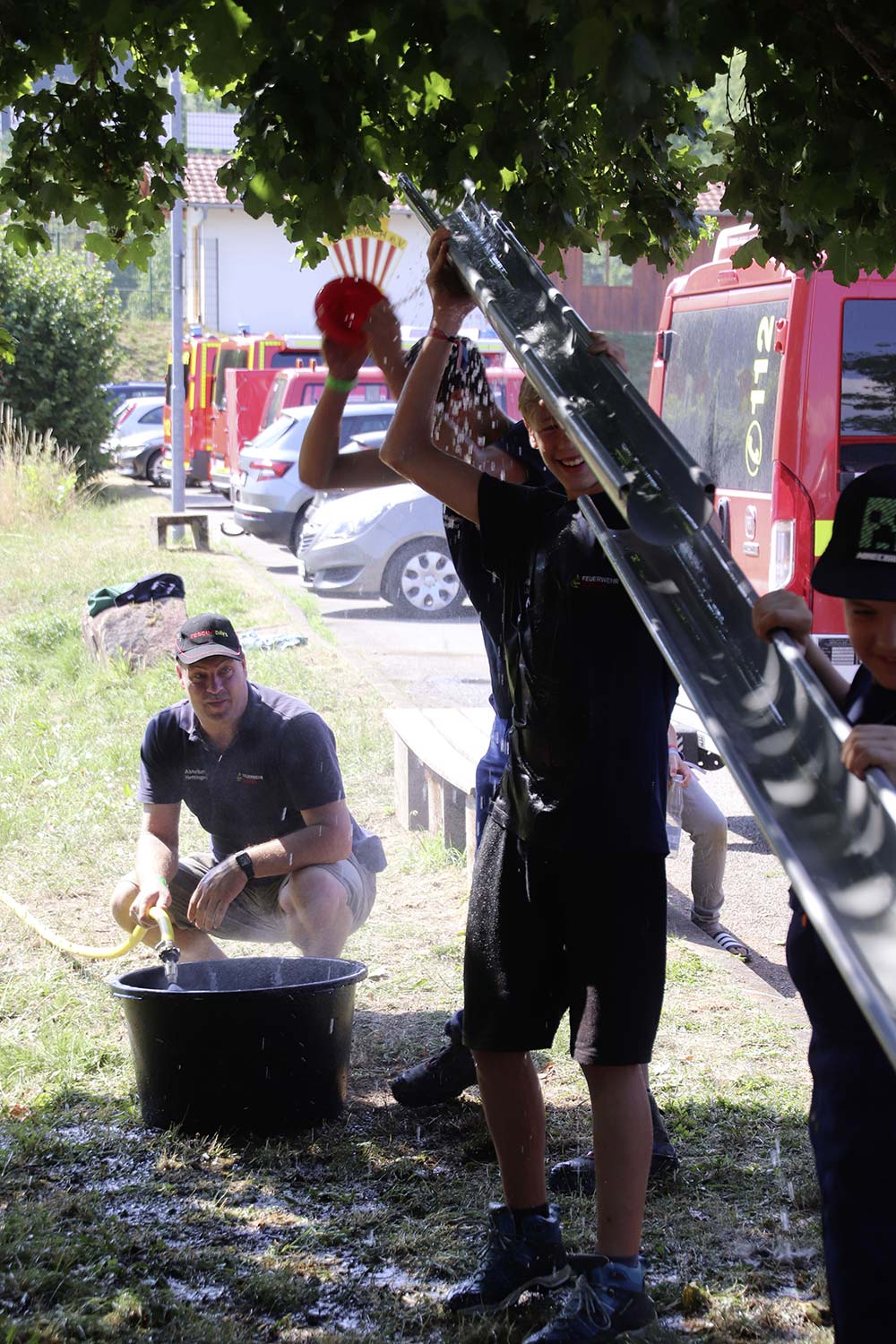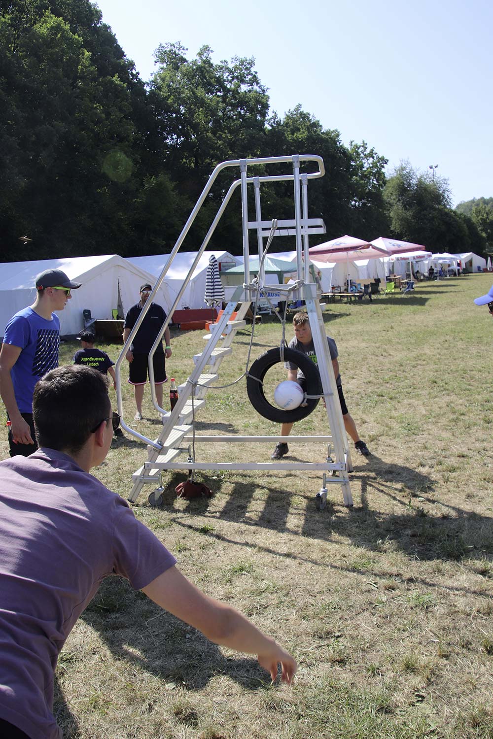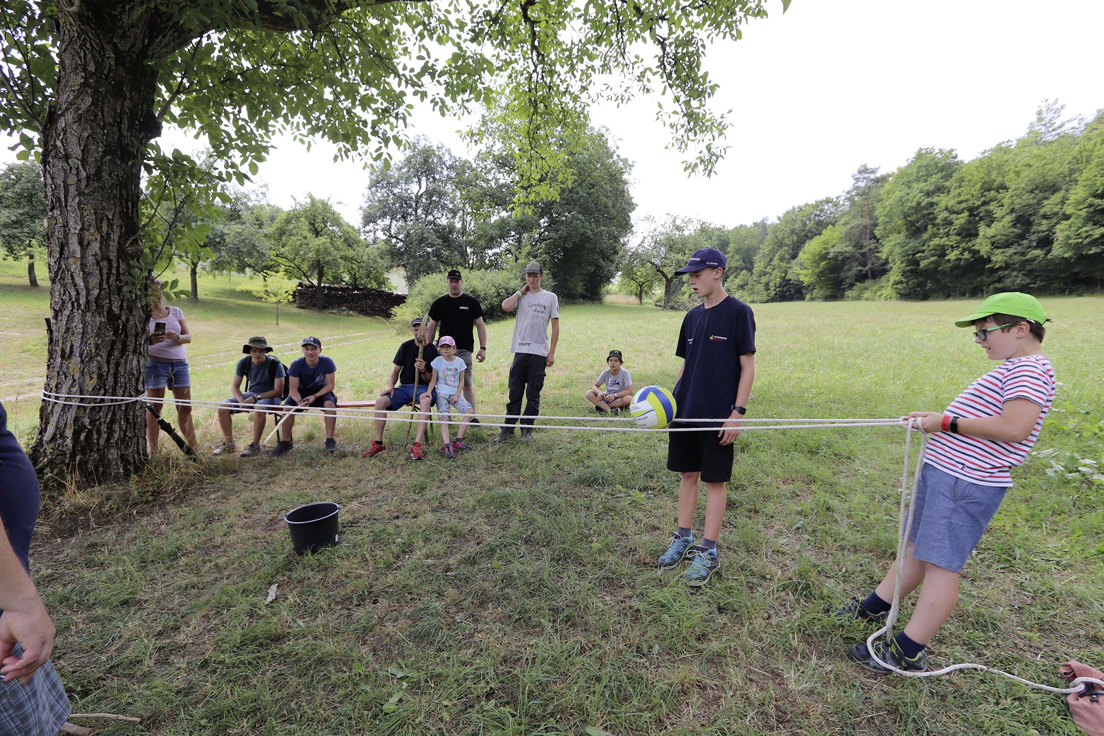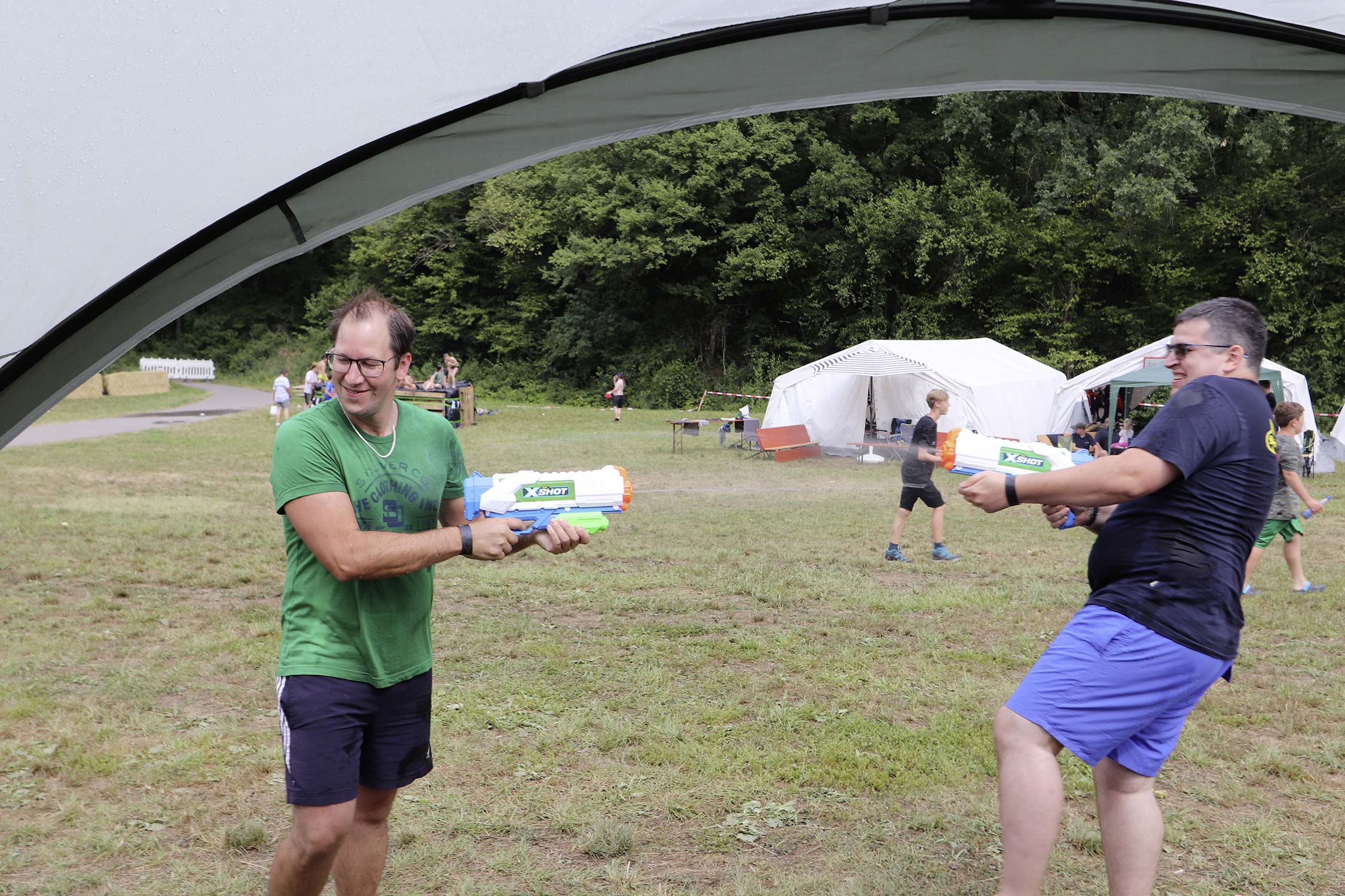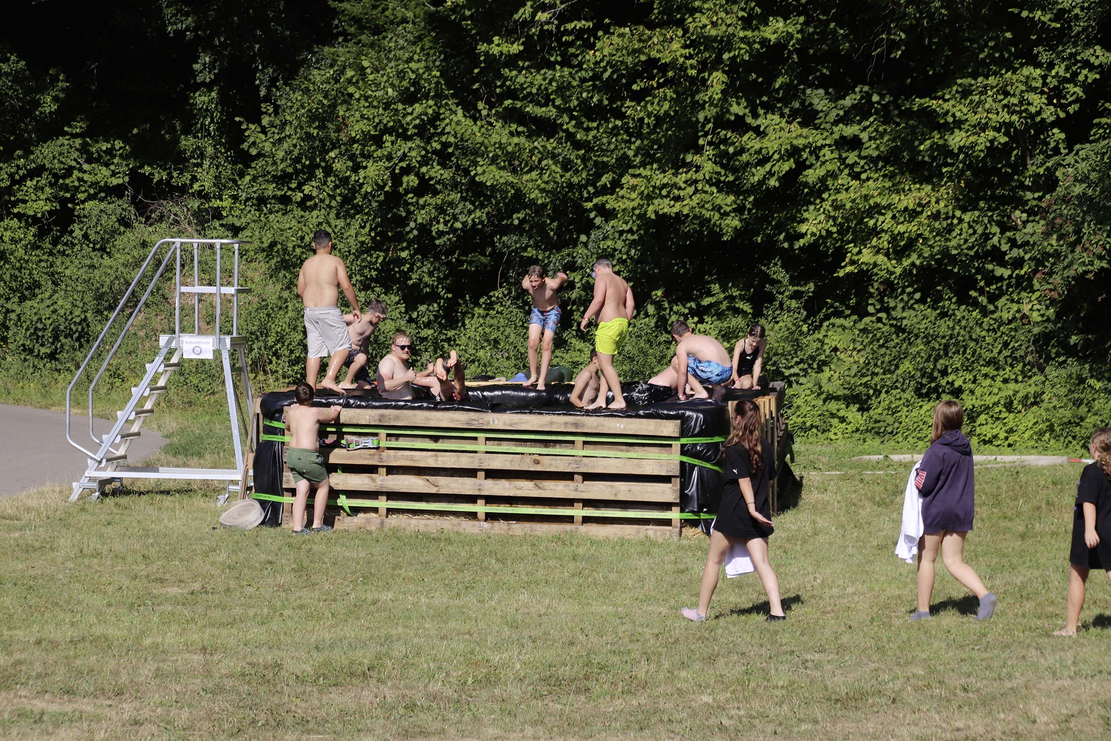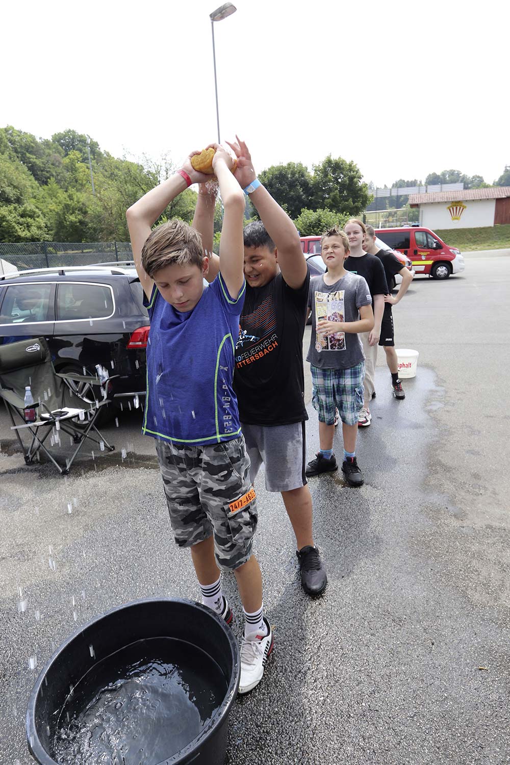 Am Samstag startete nach dem Frühstück die traditionelle Erlebniswanderung rund um Auerbach mit verschiedenen Spielstationen: Wassertransport mit dem Schwamm, Ball über Schnur, Beanbag-Zielwerfen, Eierlaufen, dem Schrauben-und-Muttern-Spiel, Flaschen schießen, Ball in Eimer und Tennisgolf. Nach der Rückkehr und dem Mittagessen stand ein Kooperationsspiel für alle Zeltlager-Teilnehmer auf dem Programm. Das vermeintliche Spiel entpuppte sich schnell als Wasserüberraschung aus dem Tanklöschfahrzeug der Feuerwehr Limbach. Als Dank wurde nicht nur der Moderator des Spiels im Wasserregen oder im Pool, den die Jugendfeuerwehr Auerbach auf dem Platz eingerichtet hatte, pitschnass. Nachhaltige Wasserbomben komplettierten die spaßige Wasserschlacht bei tropischen Temperaturen.