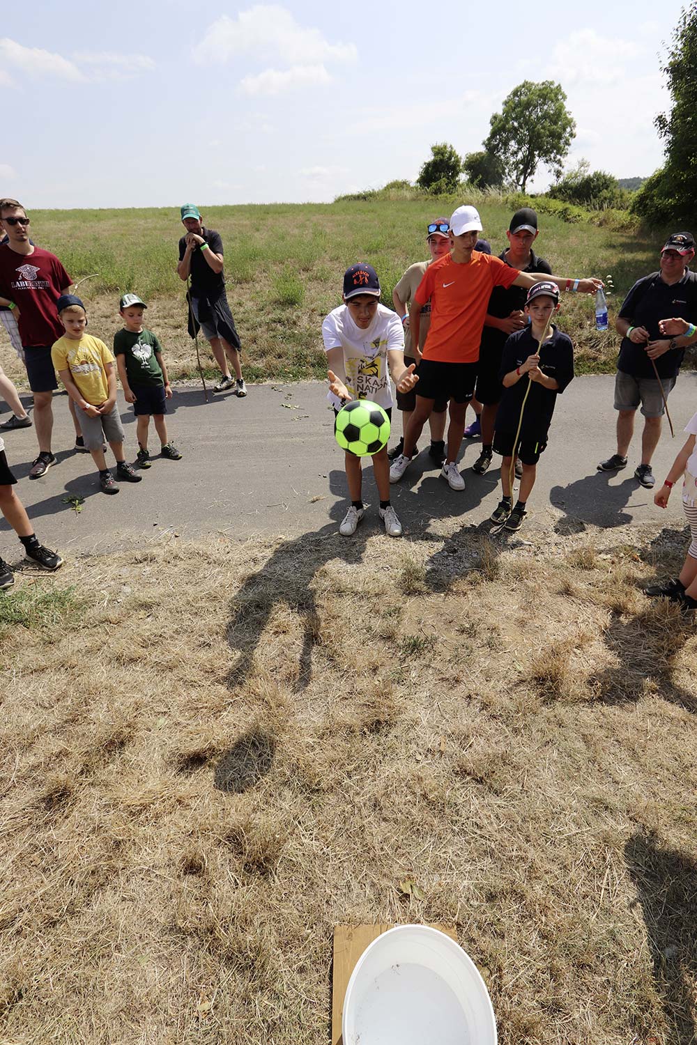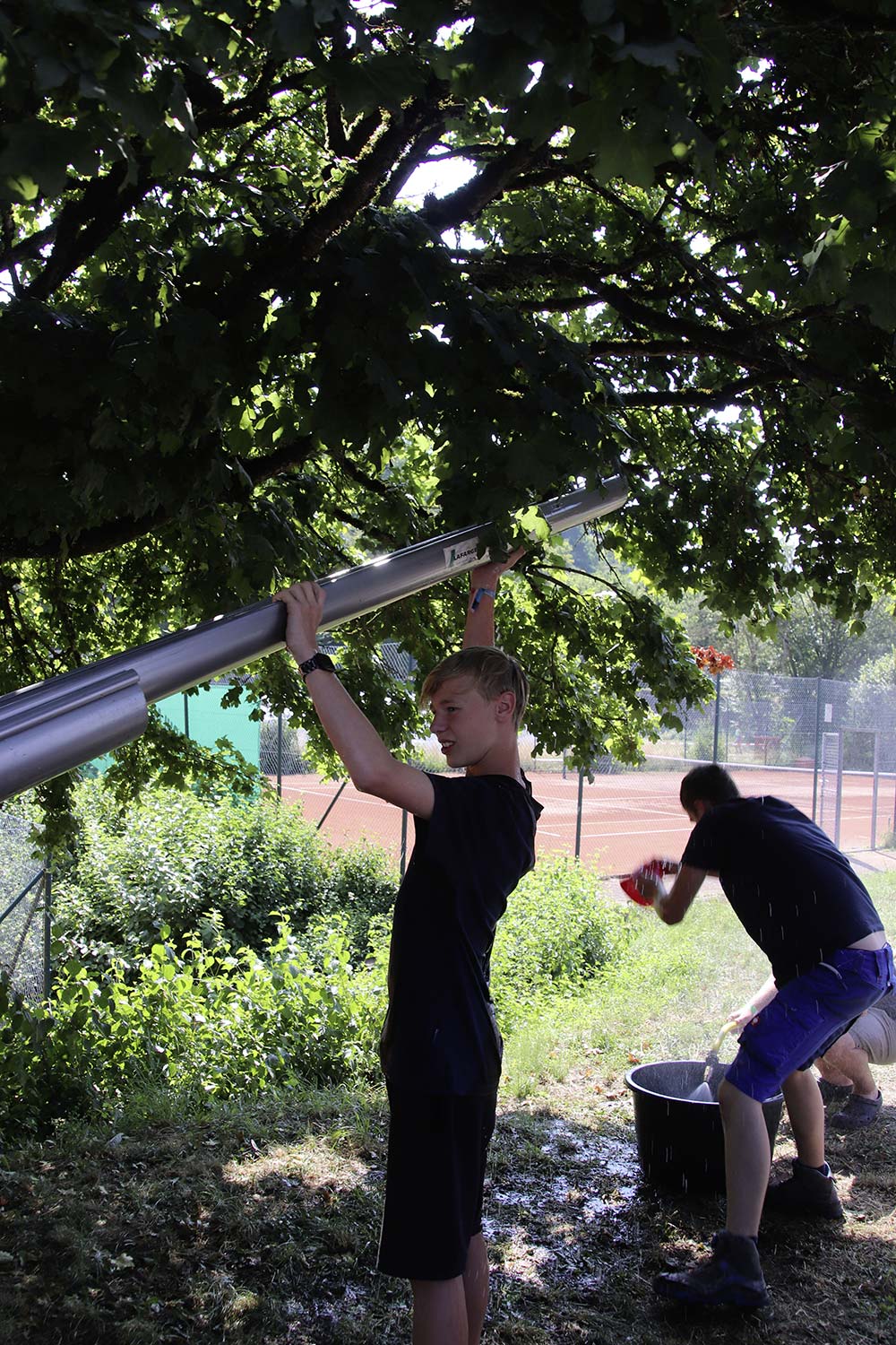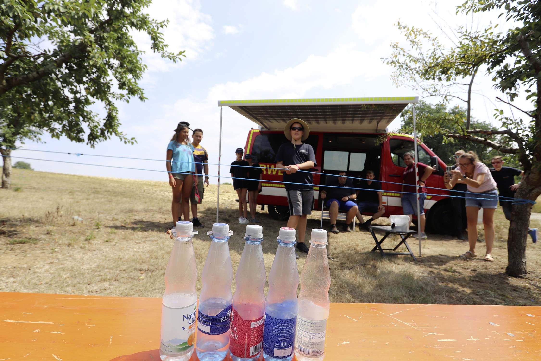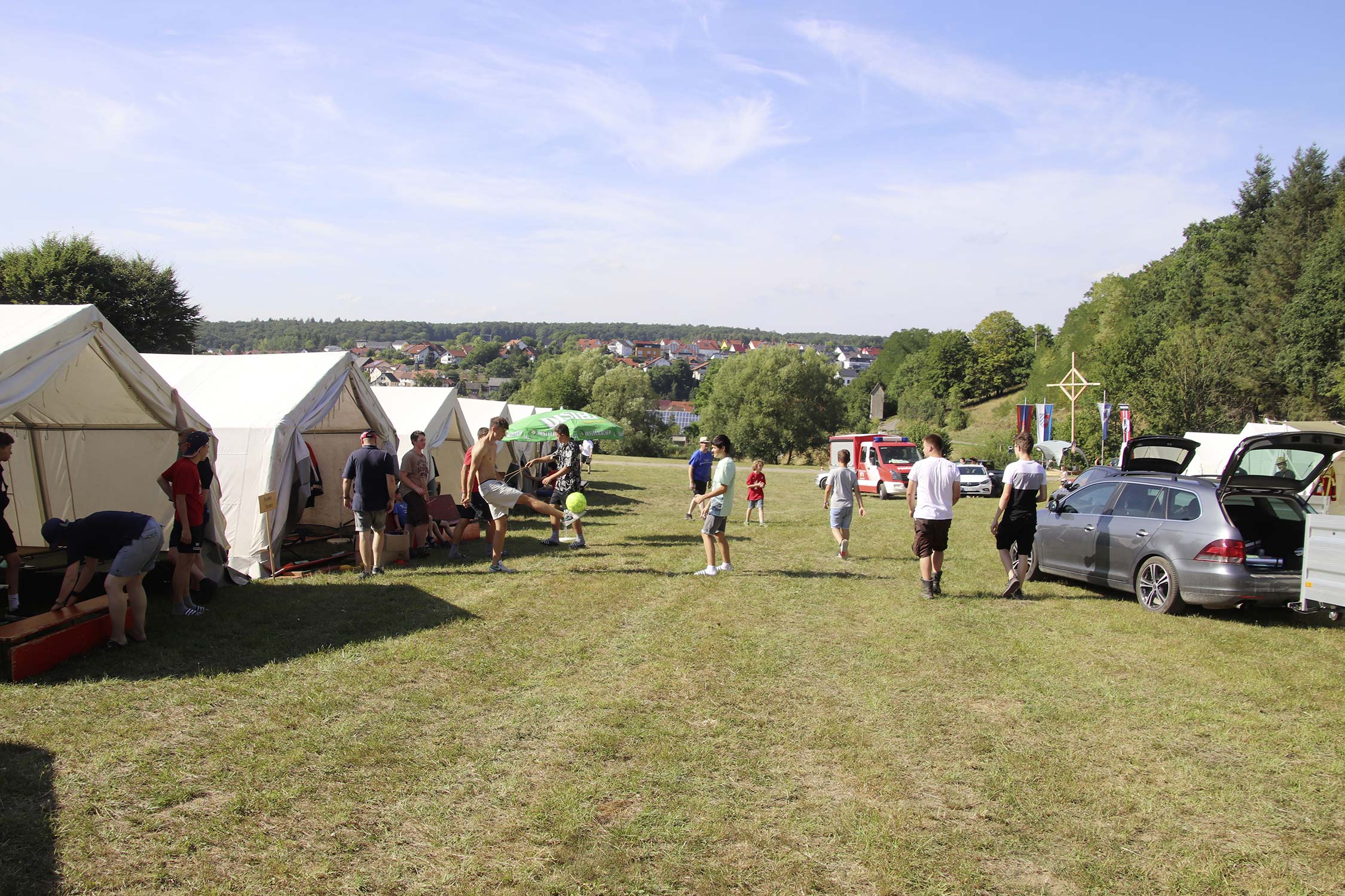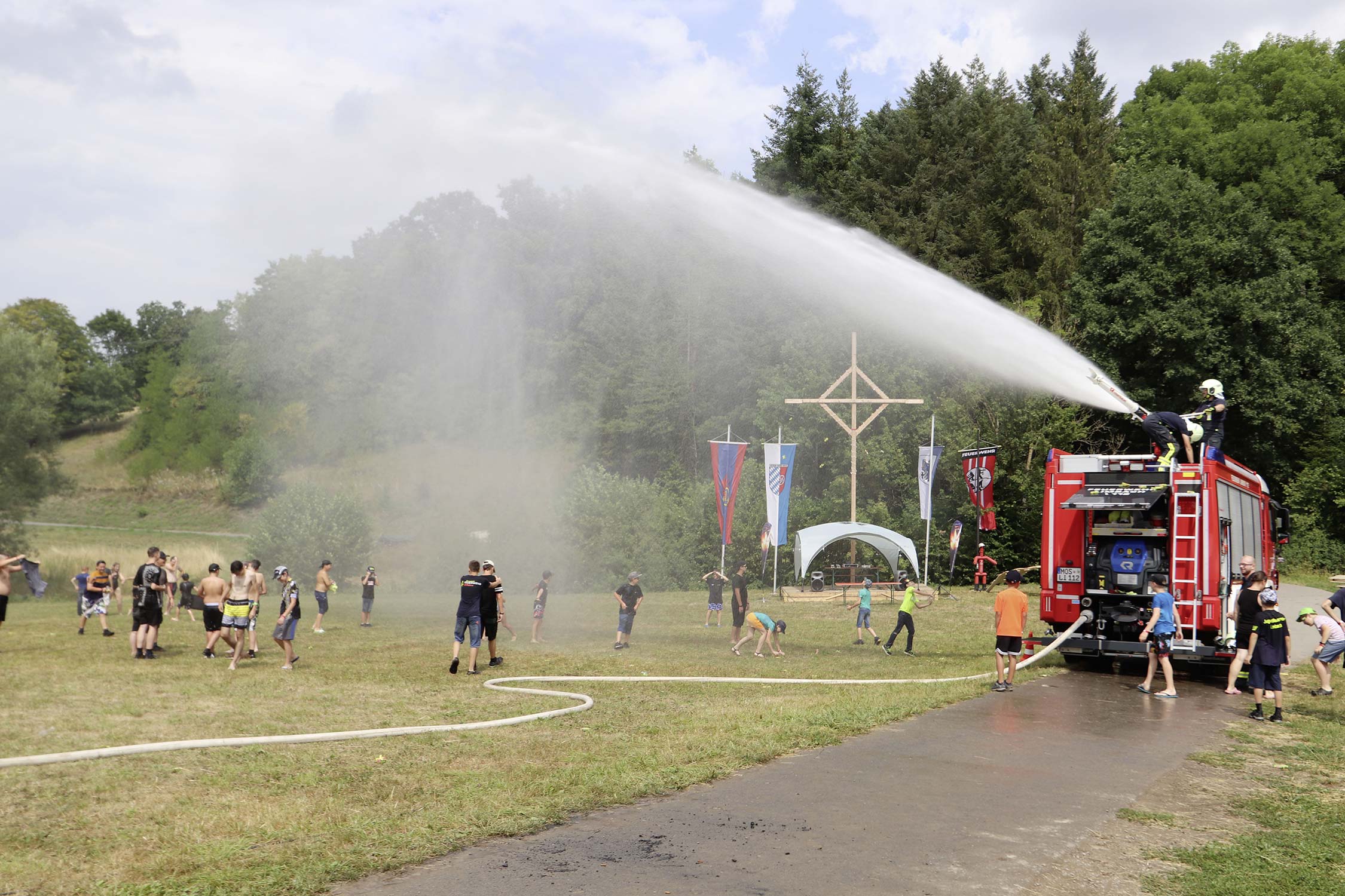 Am Samstag startete nach dem Frühstück die traditionelle Erlebniswanderung rund um Auerbach mit verschiedenen Spielstationen: Wassertransport mit dem Schwamm, Ball über Schnur, Beanbag-Zielwerfen, Eierlaufen, dem Schrauben-und-Muttern-Spiel, Flaschen schießen, Ball in Eimer und Tennisgolf. Nach der Rückkehr und dem Mittagessen stand ein Kooperationsspiel für alle Zeltlager-Teilnehmer auf dem Programm. Das vermeintliche Spiel entpuppte sich schnell als Wasserüberraschung aus dem Tanklöschfahrzeug der Feuerwehr Limbach. Als Dank wurde nicht nur der Moderator des Spiels im Wasserregen oder im Pool, den die Jugendfeuerwehr Auerbach auf dem Platz eingerichtet hatte, pitschnass. Nachhaltige Wasserbomben komplettierten die spaßige Wasserschlacht bei tropischen Temperaturen.