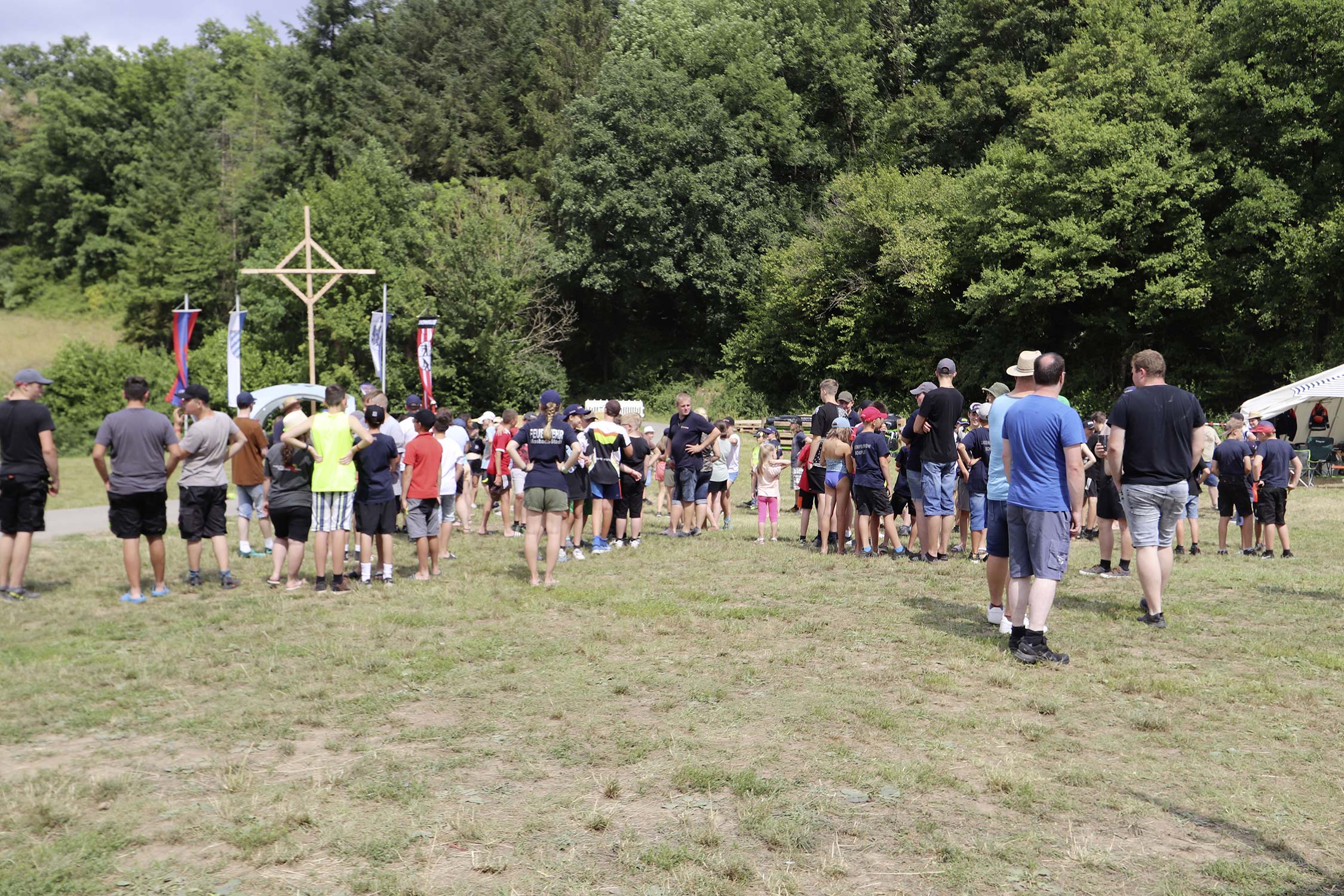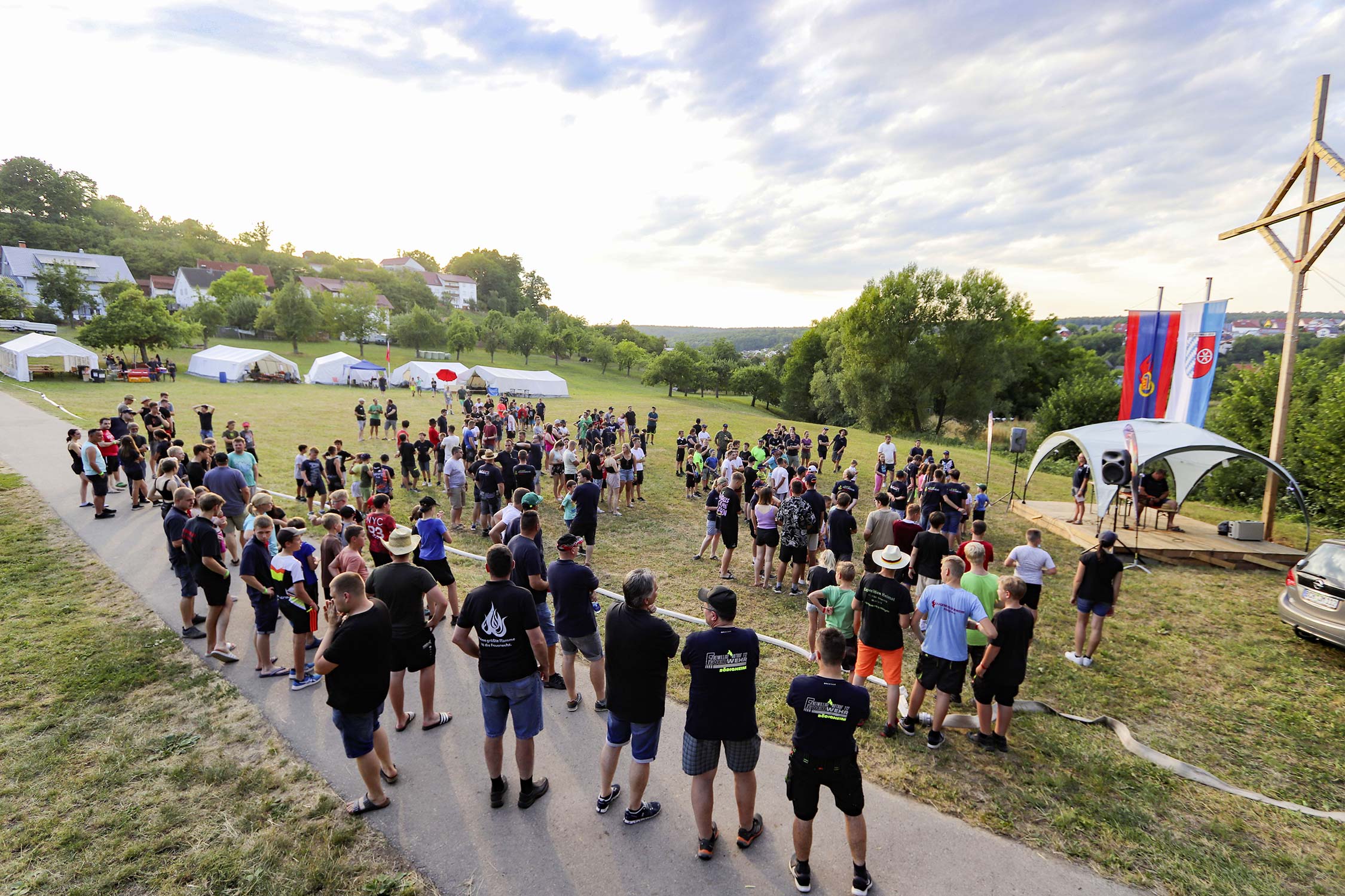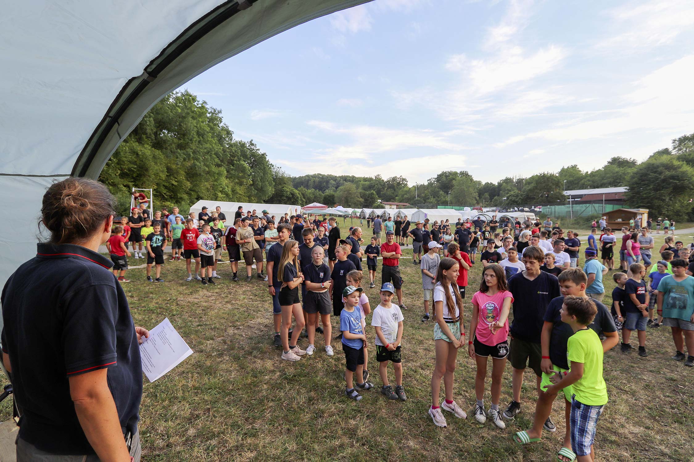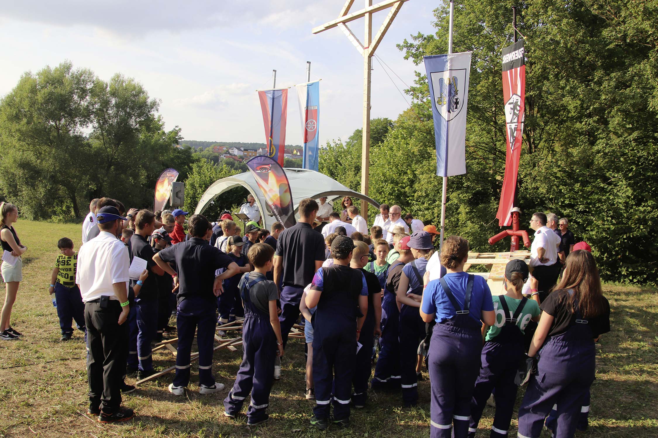 Bereits am Donnerstag reisten die ersten Jugendfeuerwehren zum Zeltaufbau an und lernten den Zeltplatz kennen. Nach der eigentlichen Anreise am Freitag und dem Einrichten der Zelte begrüßten Kreisjugendwartin Pamela Hollerbach und Bürgermeister Marco Eckl die Teilnehmer aus 19 Ortschaften im Neckar-Odenwald-Kreis auf dem Zeltplatz in Auerbach. Direkt bei der Anmeldung erhielten die Teilnehmer einen Trinkbecher – gestiftet vom Kreisjugendring Neckar-Odenwald-Kreis – für kostenfreie Getränke während des Zeltlagers. Bei Einbruch der Dunkelheit starteten die Jugendlichen zu einer Nachtwanderung. Die Kreisjugendsprecher hatten die Wanderung vorbereitet und sich als Auftakt eine Geistergeschichte mit einer weißen Frau, die in den Wäldern rund um Auerbach spukt, ausgedacht.