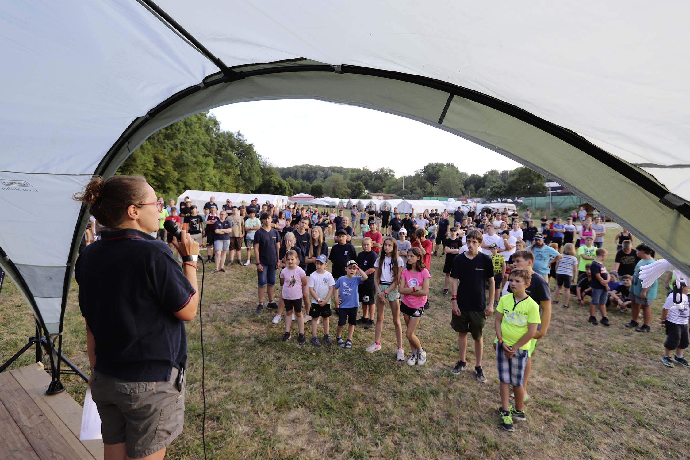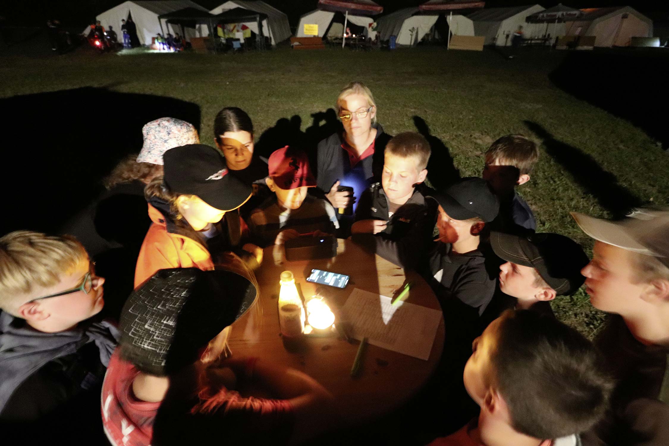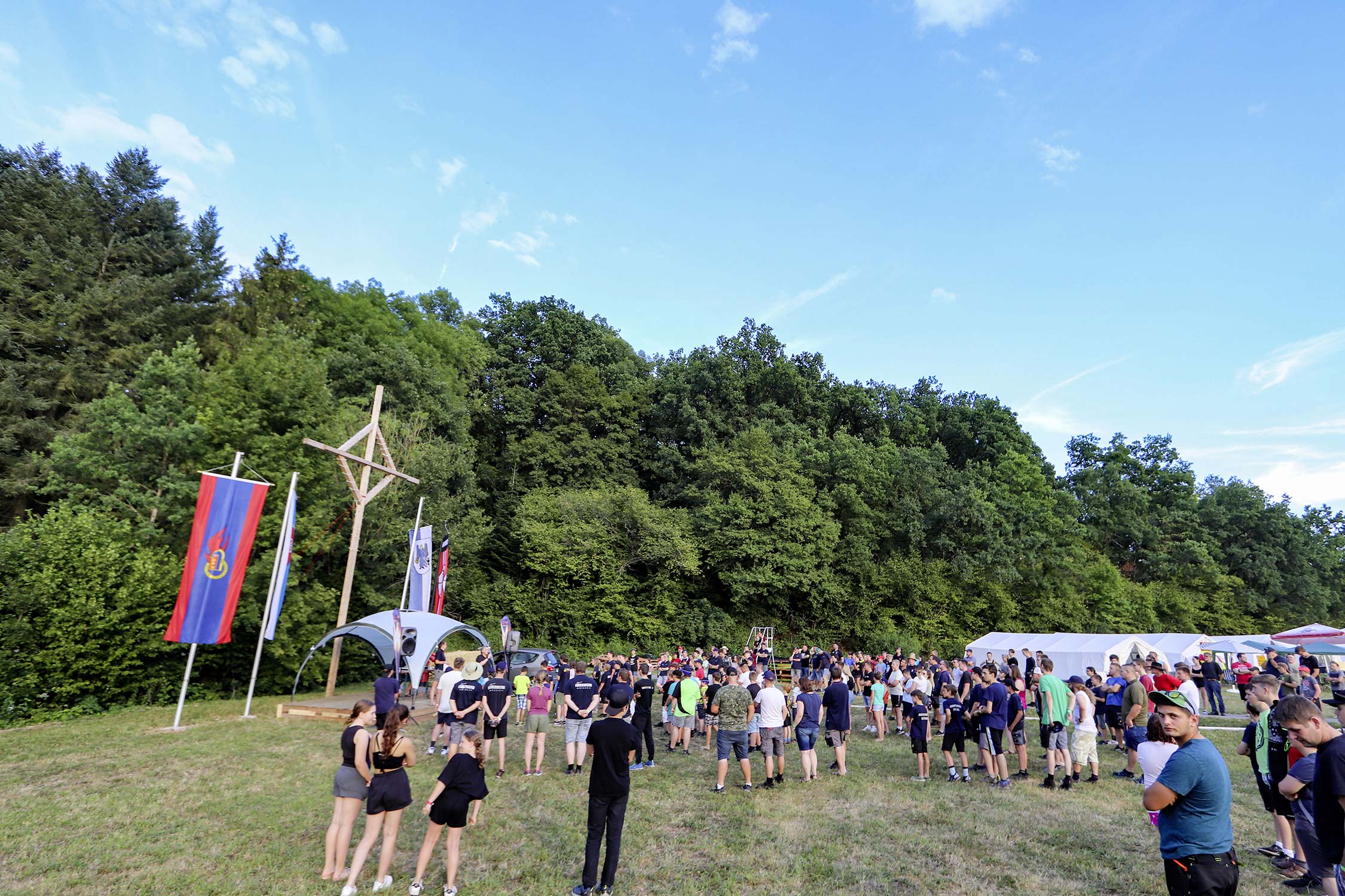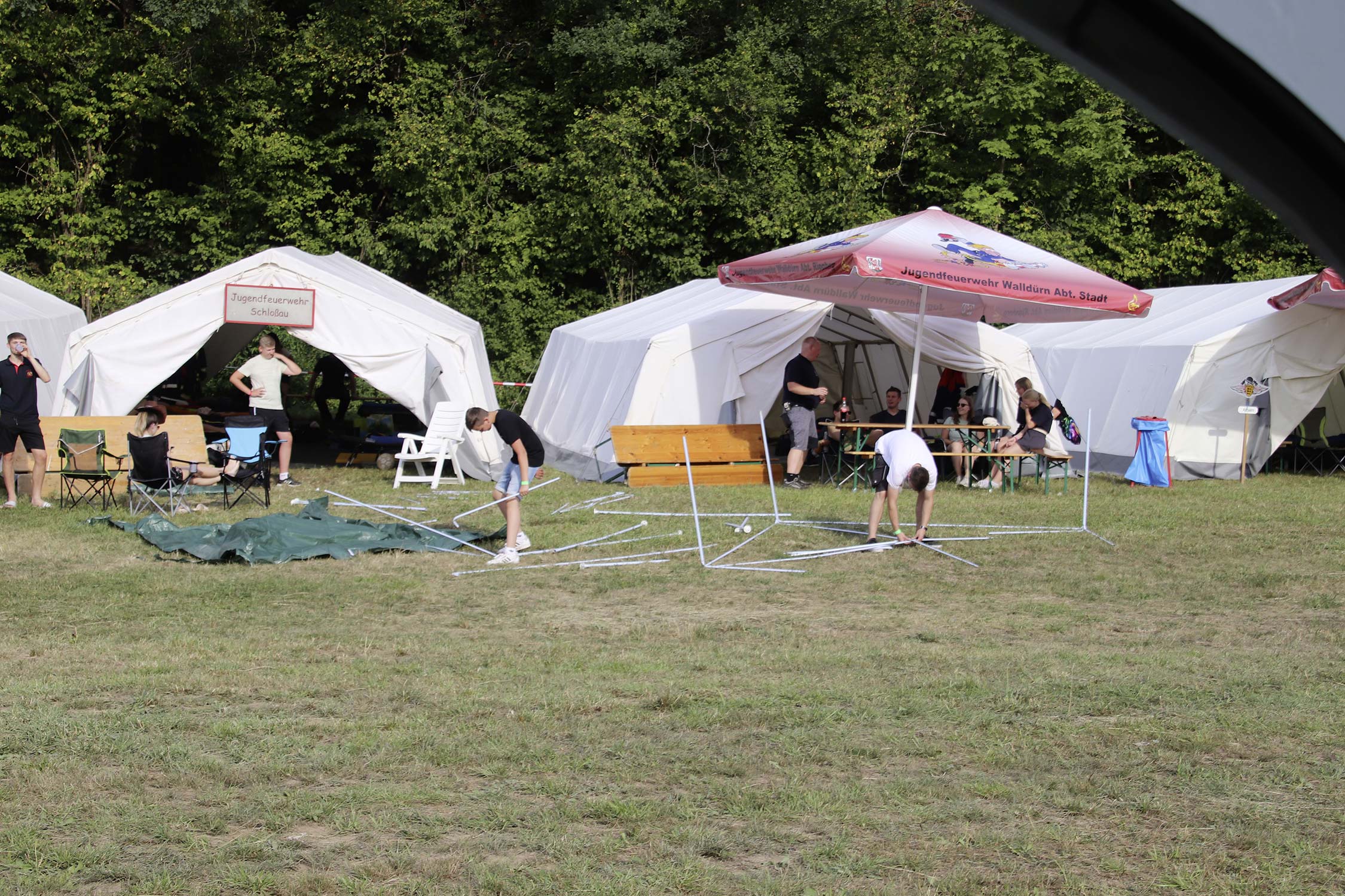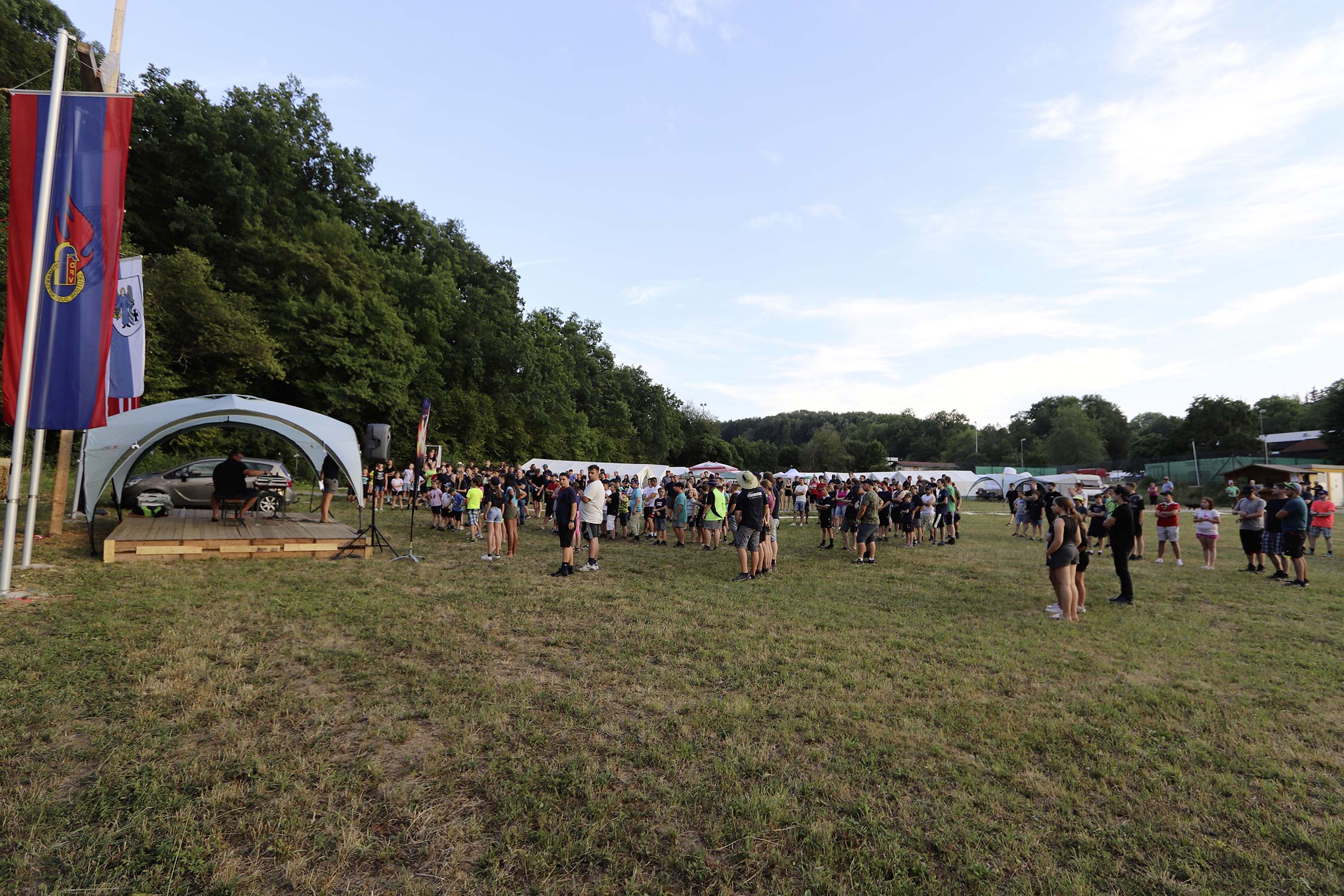 Bereits am Donnerstag reisten die ersten Jugendfeuerwehren zum Zeltaufbau an und lernten den Zeltplatz kennen. Nach der eigentlichen Anreise am Freitag und dem Einrichten der Zelte begrüßten Kreisjugendwartin Pamela Hollerbach und Bürgermeister Marco Eckl die Teilnehmer aus 19 Ortschaften im Neckar-Odenwald-Kreis auf dem Zeltplatz in Auerbach. Direkt bei der Anmeldung erhielten die Teilnehmer einen Trinkbecher – gestiftet vom Kreisjugendring Neckar-Odenwald-Kreis – für kostenfreie Getränke während des Zeltlagers. Bei Einbruch der Dunkelheit starteten die Jugendlichen zu einer Nachtwanderung. Die Kreisjugendsprecher hatten die Wanderung vorbereitet und sich als Auftakt eine Geistergeschichte mit einer weißen Frau, die in den Wäldern rund um Auerbach spukt, ausgedacht.