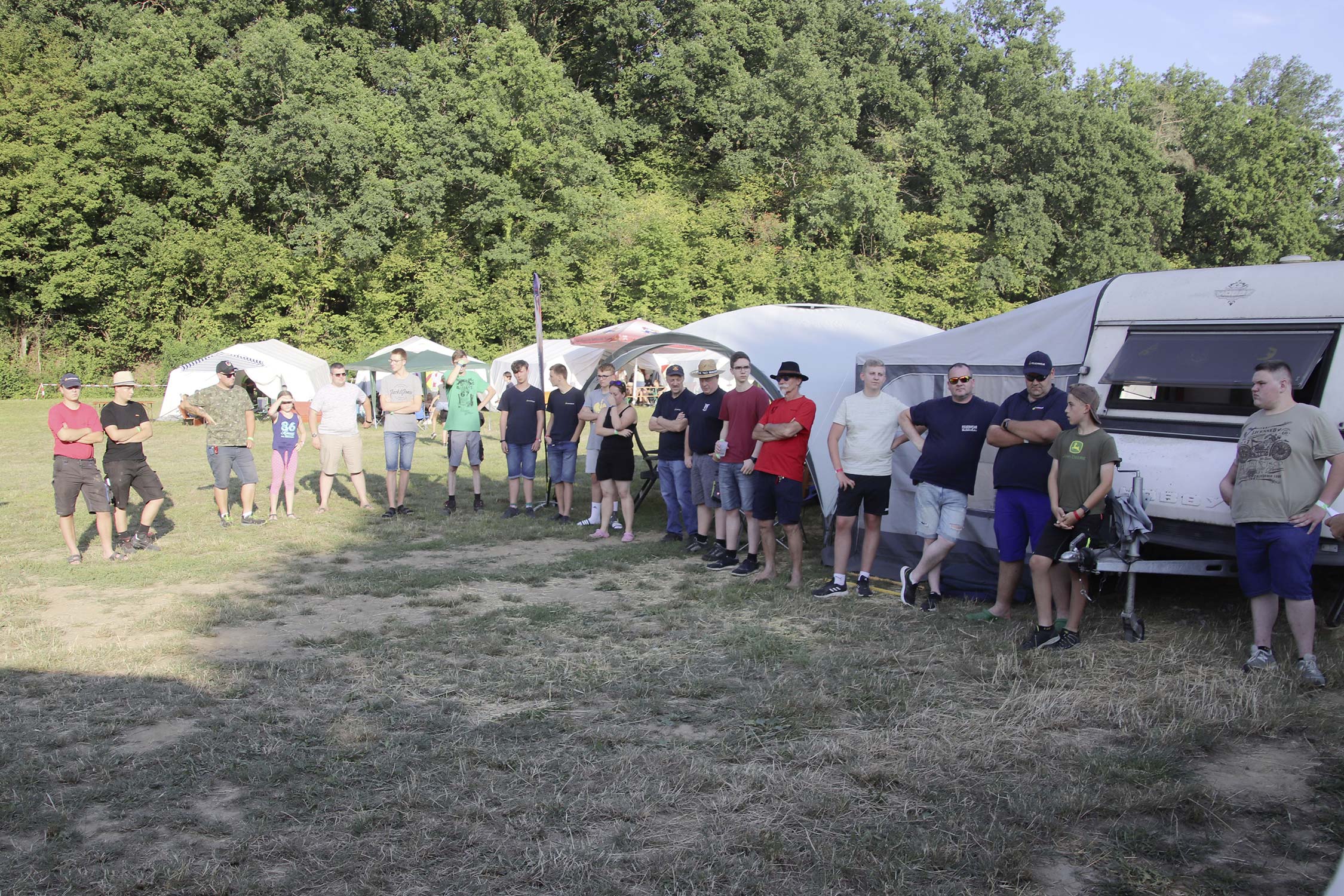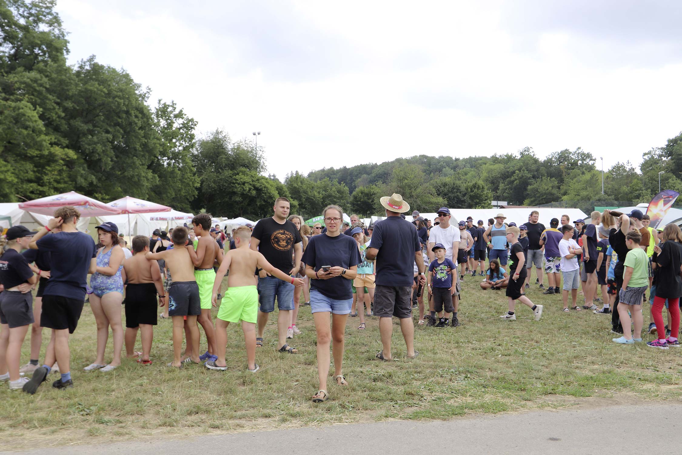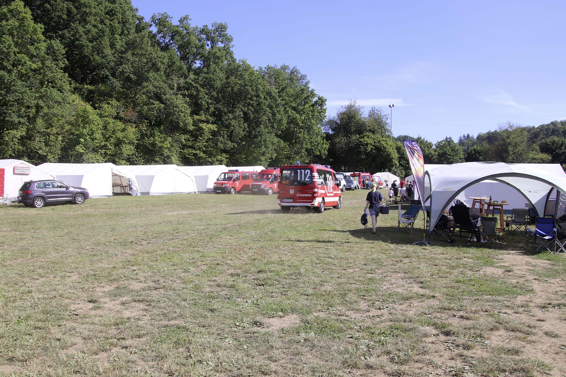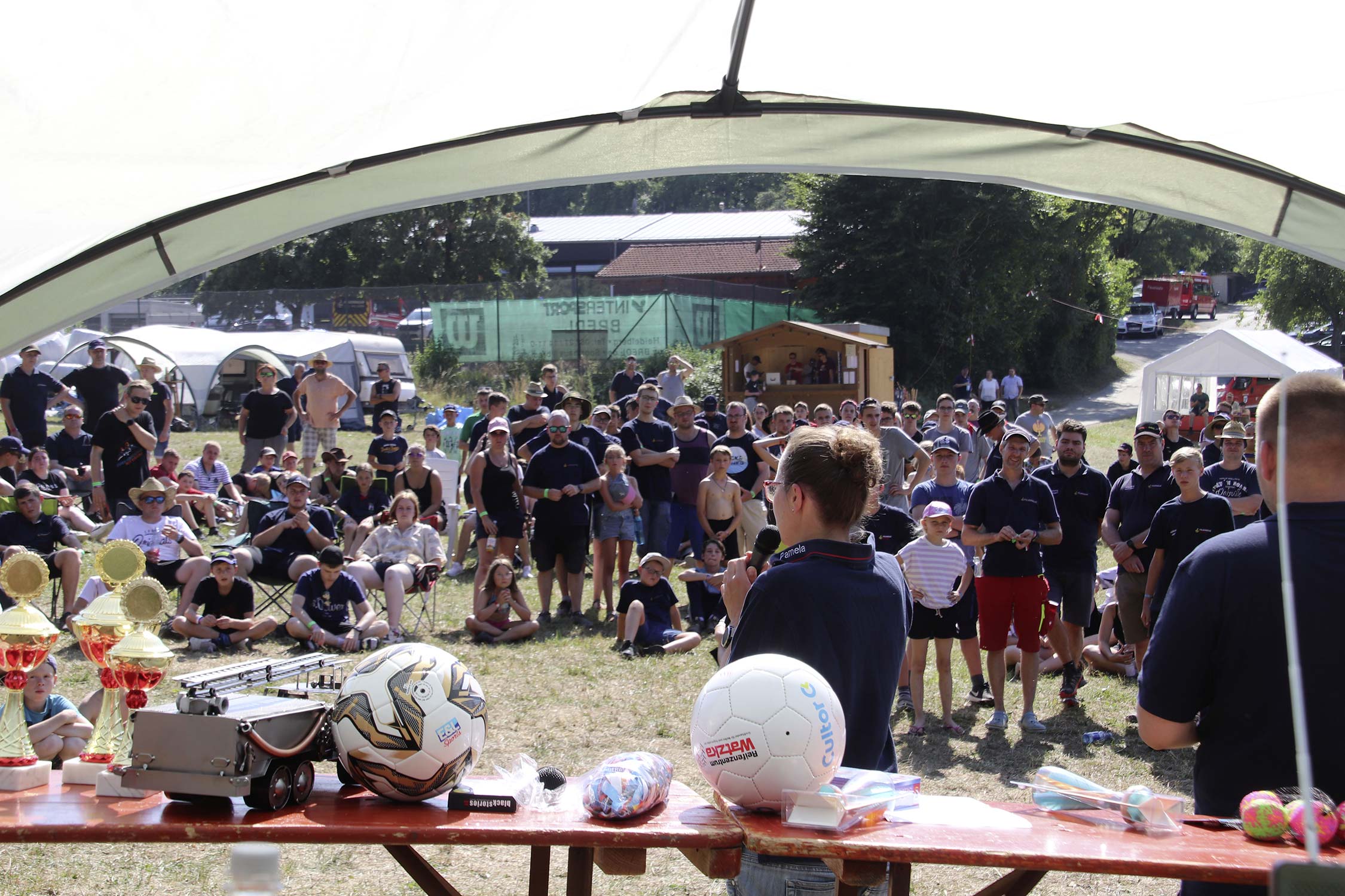 Bereits am Donnerstag reisten die ersten Jugendfeuerwehren zum Zeltaufbau an und lernten den Zeltplatz kennen. Nach der eigentlichen Anreise am Freitag und dem Einrichten der Zelte begrüßten Kreisjugendwartin Pamela Hollerbach und Bürgermeister Marco Eckl die Teilnehmer aus 19 Ortschaften im Neckar-Odenwald-Kreis auf dem Zeltplatz in Auerbach. Direkt bei der Anmeldung erhielten die Teilnehmer einen Trinkbecher – gestiftet vom Kreisjugendring Neckar-Odenwald-Kreis – für kostenfreie Getränke während des Zeltlagers. Bei Einbruch der Dunkelheit starteten die Jugendlichen zu einer Nachtwanderung. Die Kreisjugendsprecher hatten die Wanderung vorbereitet und sich als Auftakt eine Geistergeschichte mit einer weißen Frau, die in den Wäldern rund um Auerbach spukt, ausgedacht.