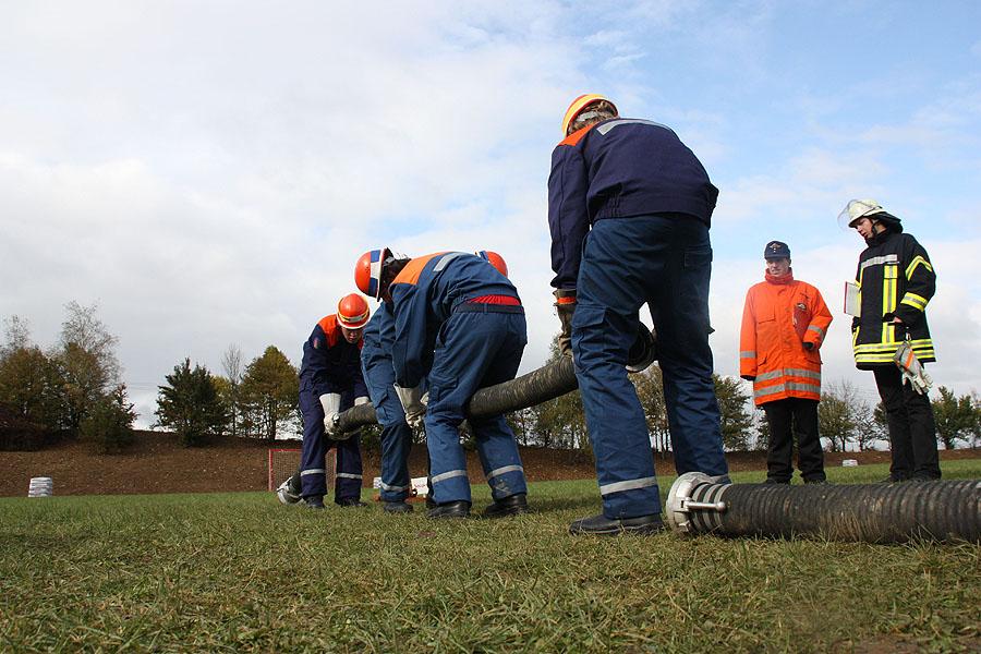 Rund 15 Minuten fühlte sich jede Gruppe wie in der Schule und musste Fragen zu allerlei verschiedenen Themen, wie zum Beispiel Politik, Feuerwehr, Allgemeinbildung und aktuelle Themen, beantworten. Die Königsdisziplin stellt der Löschangriff nach der aktuellen Feuerwehrdienstvorschrift dar. Möglichst ohne Fehler gilt es dabei eine Wasserversorung aufzubauen und von einem offenen Gewässer Wasser zu entnehmen und dieses mittels Verteiler und Schläuchen von drei Stellen an die angenommene Brandstelle zu bringen.