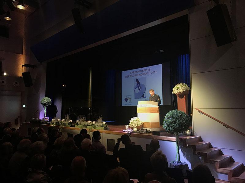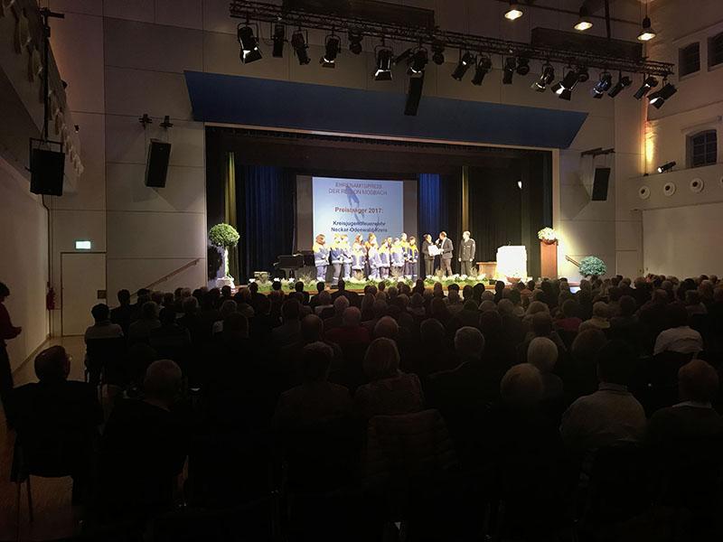 Laudator Kreisbrandmeister Jörg Kirschenlohr würdigte die Arbeit der Jugendfeuerwehren im Landkreis und zeigte den Anwesenden einen kleinen Teil der rund 900 Jugendlichen, die im Landkreis "ganz bei der Sache sind und für die Feuerwehr 'brennen'". Kreisjugendfeuerwehrwartin Pamela Hollerbach, die die Preisskulptur entgegennahm, sagte, was für alle an diesem Abend Geehrte galt: "Wir sind stolz auf sie (Anmerkung der Redaktion: unsere Jugendlichen)!". Die Jugendlichen aus Mosbach, Rittersbach und Buchen, die stellvertetend für alle Jugendfeuerwehren zur Preisverleihung mitgekommen waren, brachten zum einen Farbe auf die Bühne und zum anderen das Publikum mit ihren Aussagen im Interview mit dem Moderator mehrfach zum Lachen.