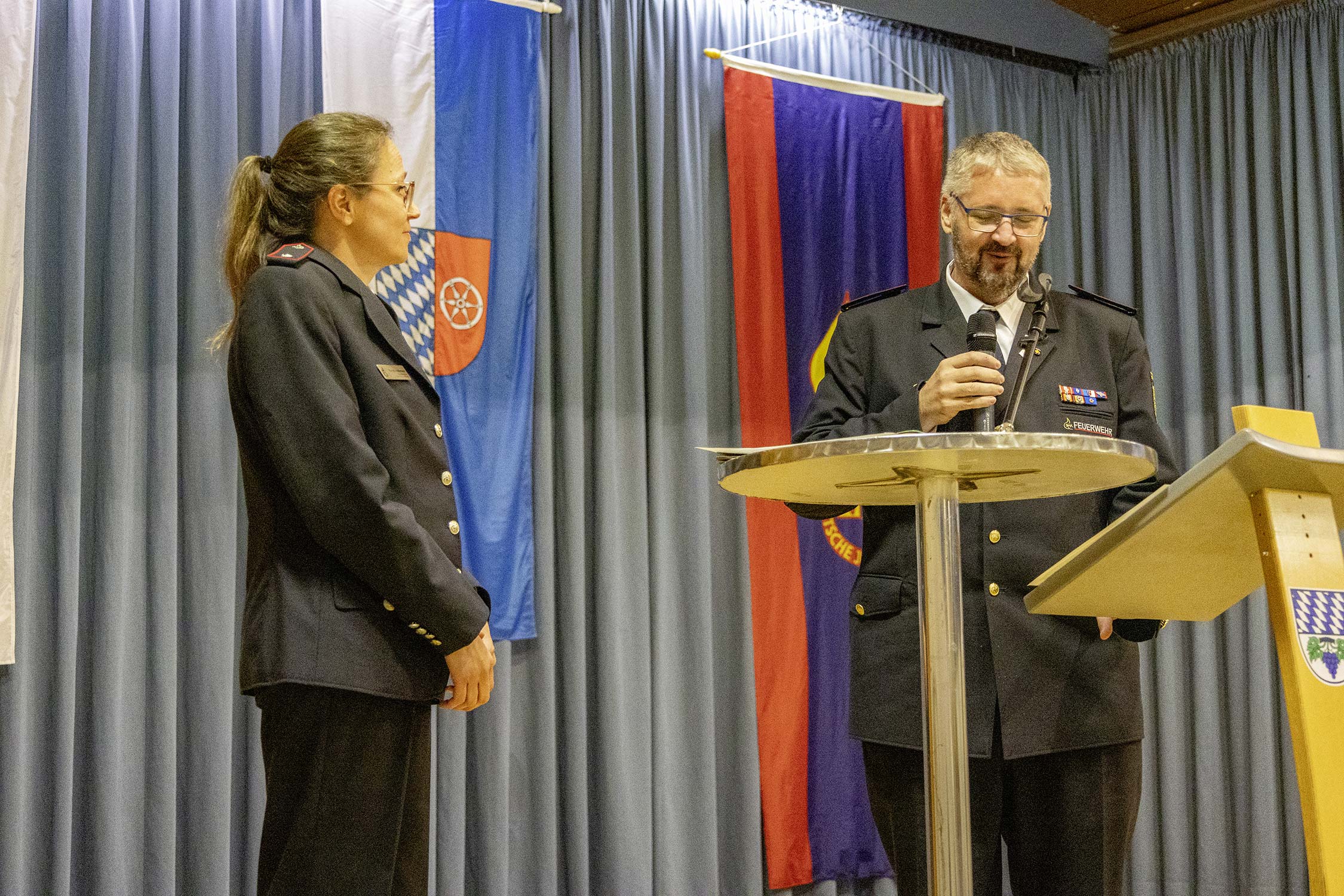 Überraschend ergriff der Vorsitzende des Kreisfeuerwehrverbandes, Michael Genzwürker, erneut das Wort und zeichnete Kreisjugendwartin Pamela Hollerbach mit der Goldenen Ehrennadel des Kreisfeuerwehrverbandes aus und dankte der sichtlich überraschten Kreisjugendwartin für mehr als 25 Jahre Verantwortung in der Jugendarbeit im Neckar-Odenwald-Kreis.