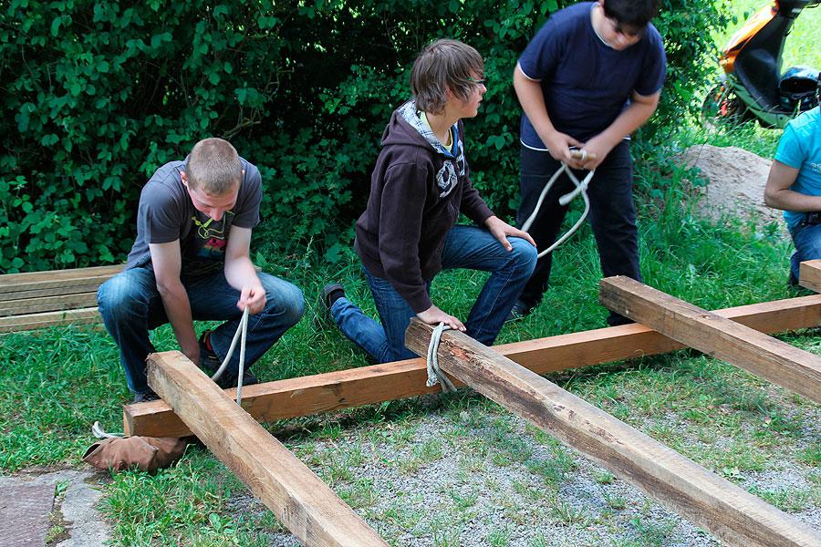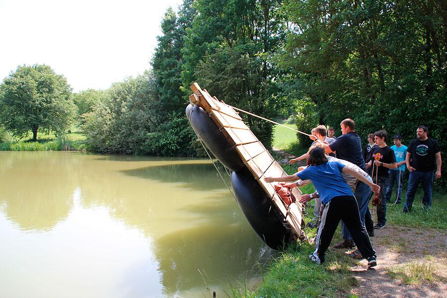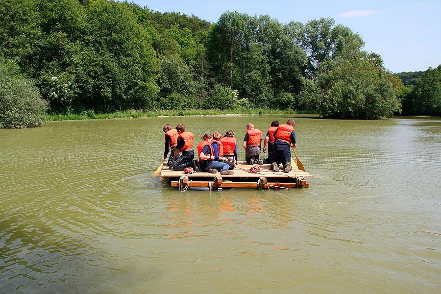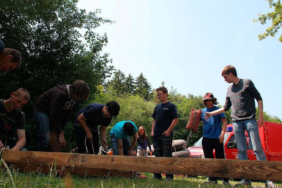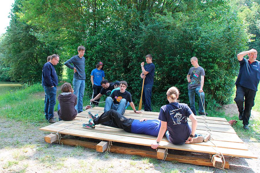 Interessante Kennenlern-, Kooperations- und Bewegungsspiele, die Kreisjugendfeuerwehrwart Nikolaus Klasan und seine Stellvertreterin Pamela Hollerbach immer wieder einstreuten, lockerten die Atmosphäre auf. Beim abschließenden Floßbau und der zum Glück trockenen Floßfahrt auf dem Daunsee waren nicht nur Kraft und Knotenkenntnisse sondern auch Kreativität gefragt, damit das Floß auch wirklich schwimmt und die Jugendlichen sicher trägt.