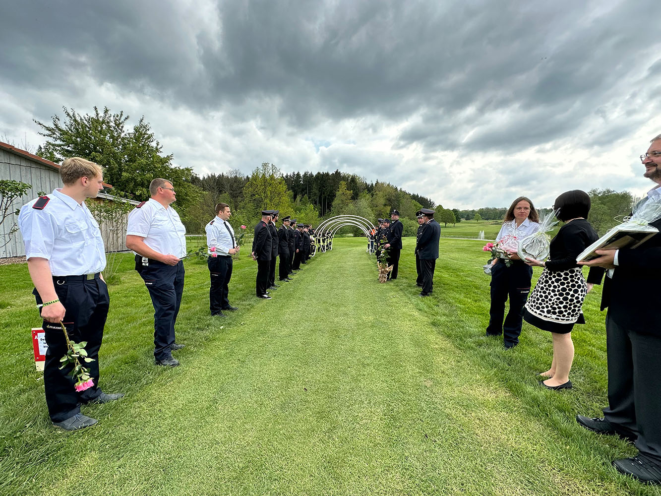 Auf dem Golfplatz in Mudau inmitten der Grüns durchschritten die beiden ein Ehrenspalier der Feuerwehr Mudau, der Jugendfeuerwehr Neckar-Odenwald-Kreis und des Kreisfeuerwehrverbandes. Nach der großen Gratulationsrunde galt es für die beiden gemeinsam mit einer Kübelspritze ein Schwedenfeuer zu löschen, was den beiden gelang und zumindest den Bräutigam ins Schwitzen brachte.