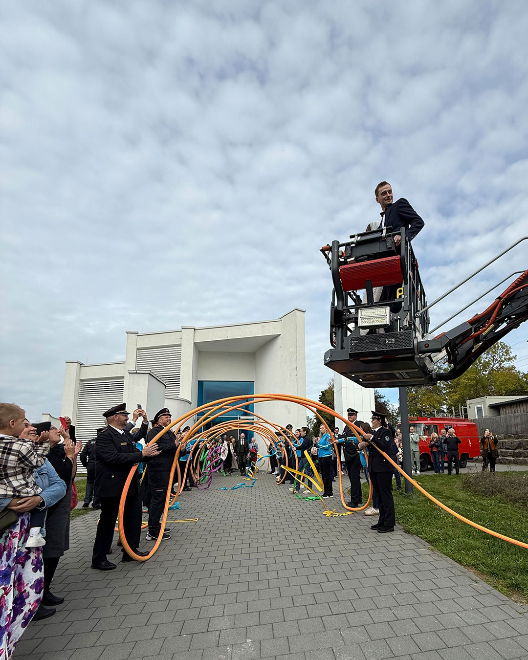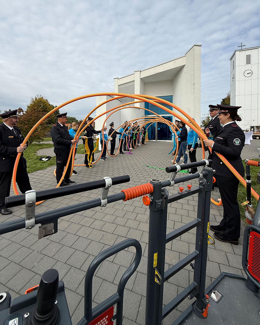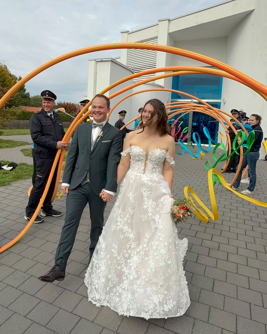 Direkt nach der Trauung und dem Durchschreiten des Spaliers, das wir, die Feuerwehr Mosbach und die Abteilung Rhytmische Sportgymnastik des TV Mosbach, gemeinsam stellten, entführte die Drehleiter die beiden in luftige Höhen. Bevor es zum obligatorischen Gruppenfoto mit dem Brautpaar kam, überreichten Kreisjugendwartin Pamela Hollerbach und Abteilungskommandant Denis Obieglo Präsente an die beiden.