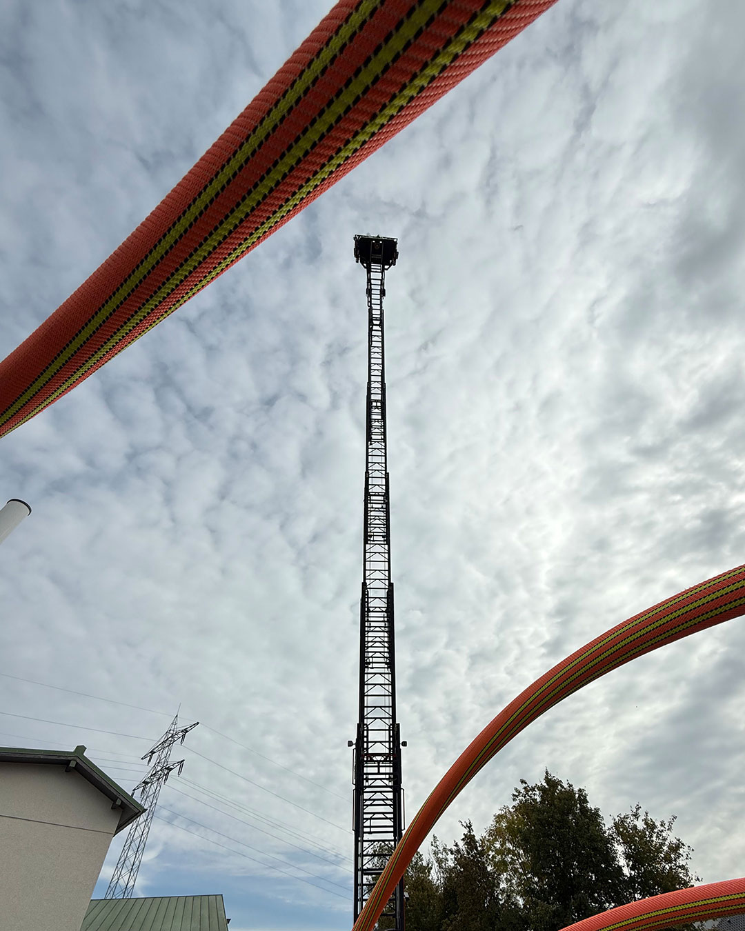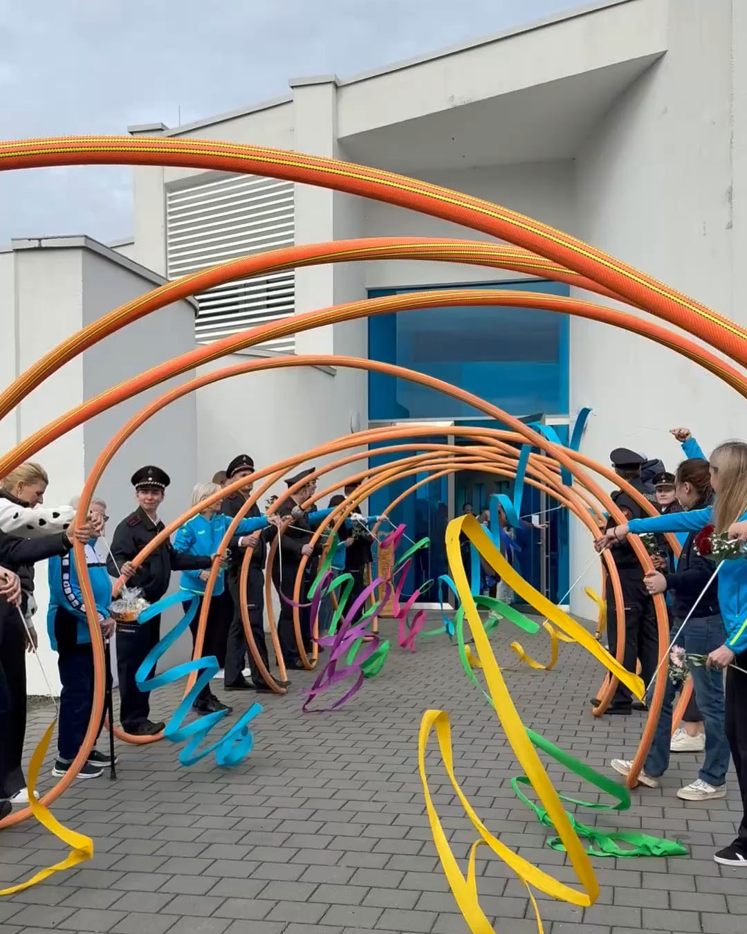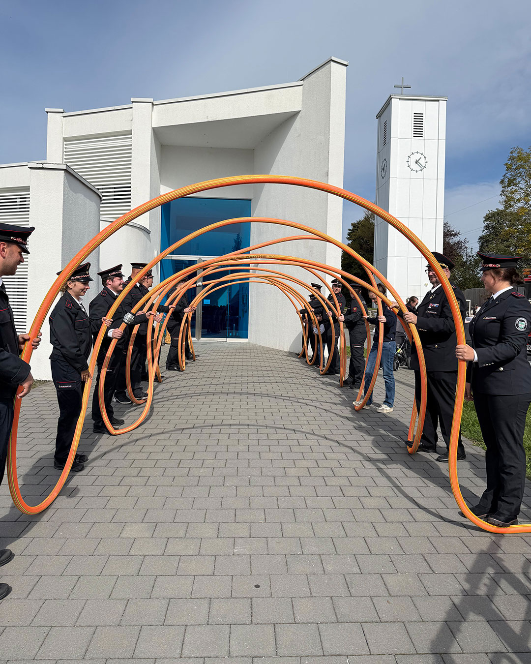 Direkt nach der Trauung und dem Durchschreiten des Spaliers, das wir, die Feuerwehr Mosbach und die Abteilung Rhytmische Sportgymnastik des TV Mosbach, gemeinsam stellten, entführte die Drehleiter die beiden in luftige Höhen. Bevor es zum obligatorischen Gruppenfoto mit dem Brautpaar kam, überreichten Kreisjugendwartin Pamela Hollerbach und Abteilungskommandant Denis Obieglo Präsente an die beiden.