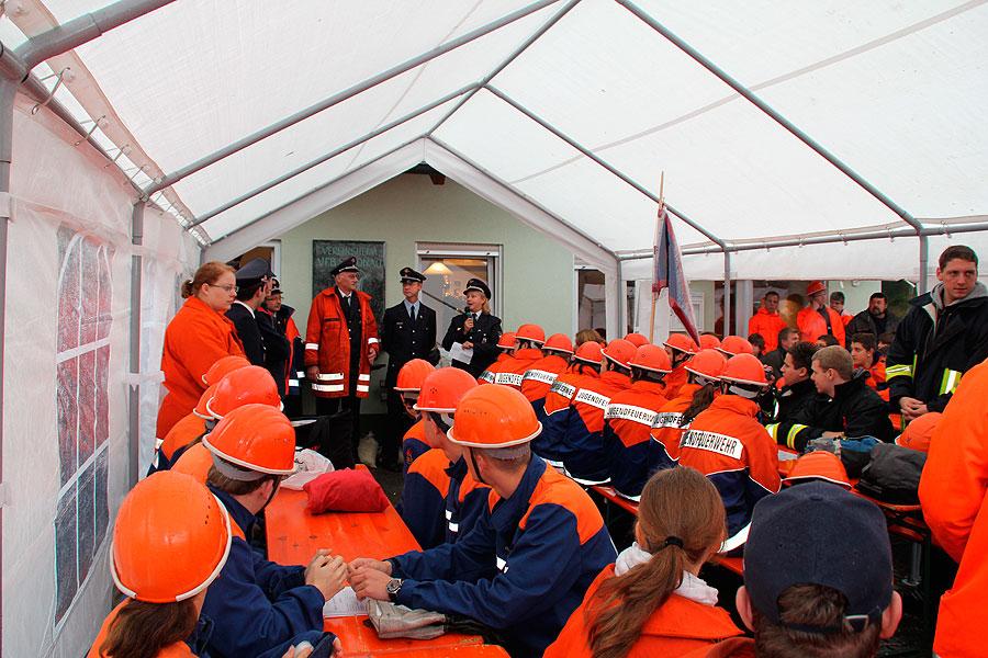 Unter den Augen des Abnahmeberechtigten der Deutschen Jugendfeuerwehr, Norbert Wanner und Ralf Tiemann und den Schiedsrichtern galt es die fünf Aufgaben der Jugendleistungsspange zu erfüllen. Nachdem die Gruppen am Morgen von Kreisjugendfeuerwehrwartin Doris Göschl (Rhein-Neckar-Kreis) begrüßt worden waren, ging es an's Eingemachte. Für die je neun Gruppenmitglieder galt es gemeinsam fünf Aufgaben zu erfüllen und dabei auch noch einen guten Eindruck bei den Schiedsrichtern zu hinterlassen.