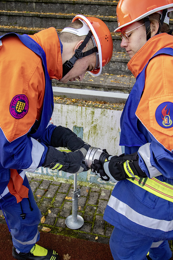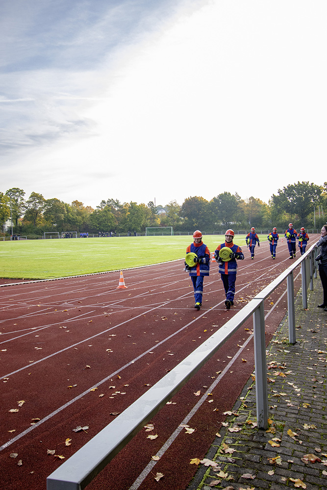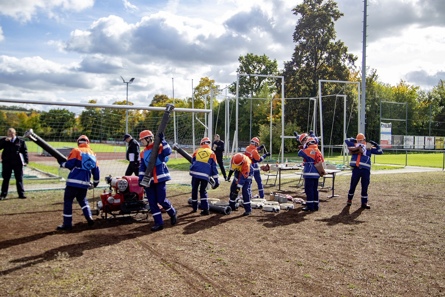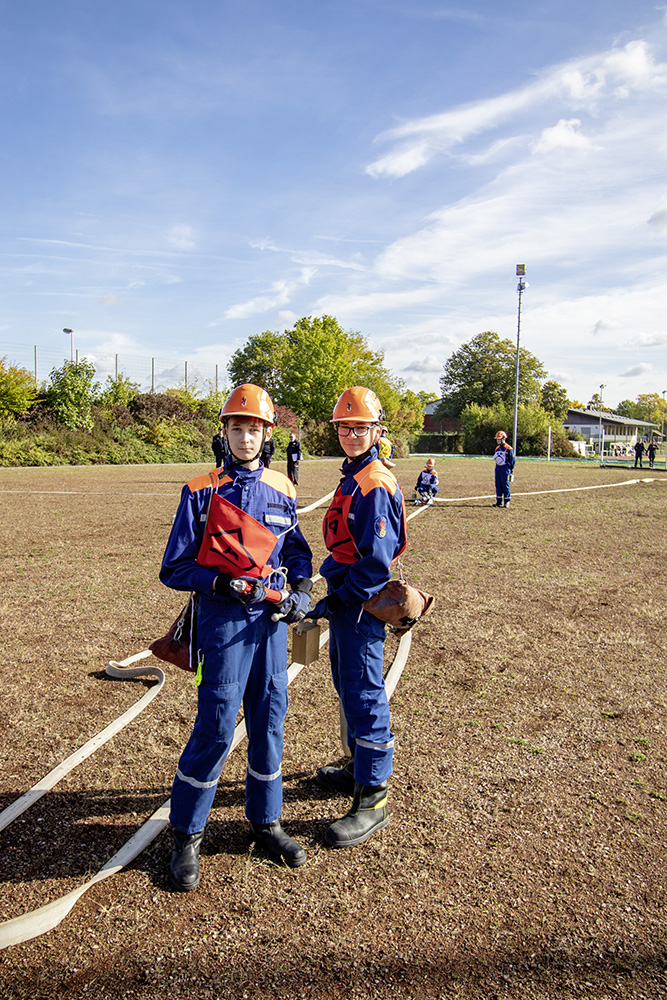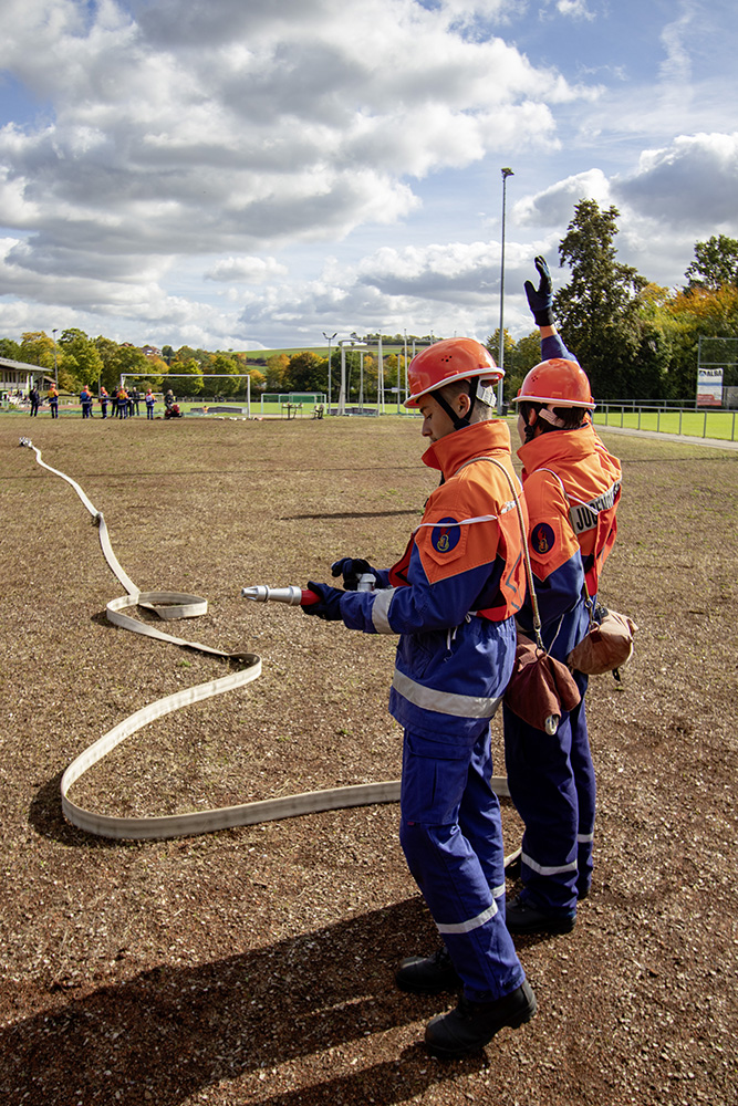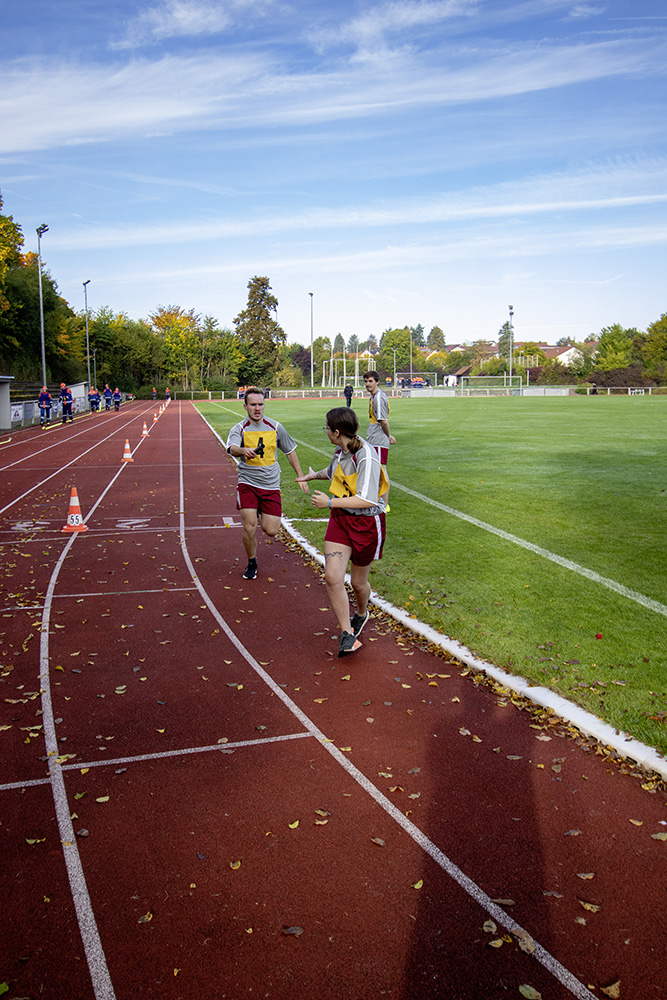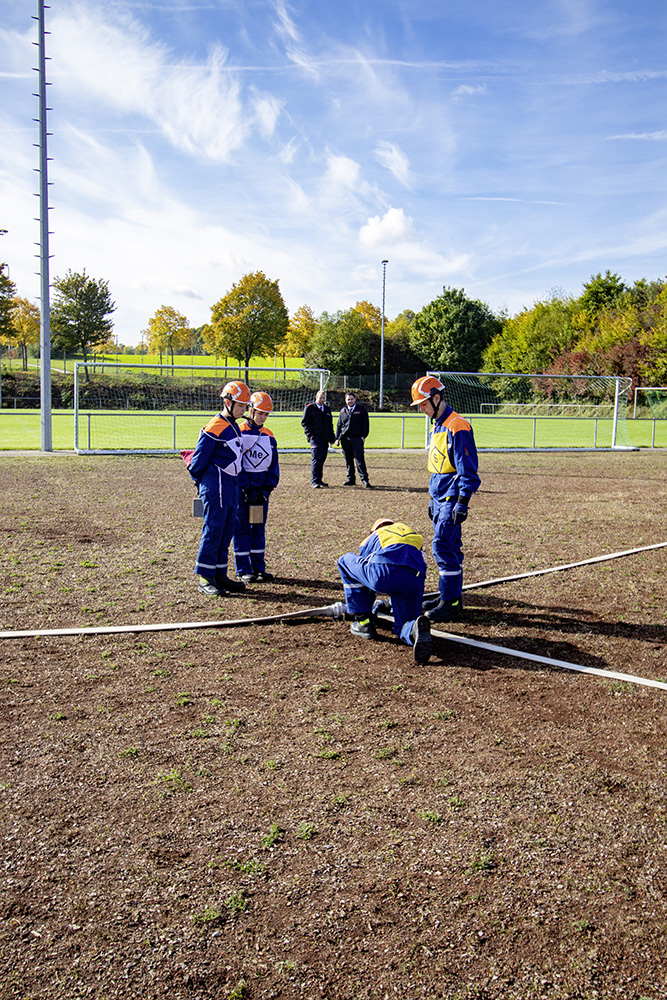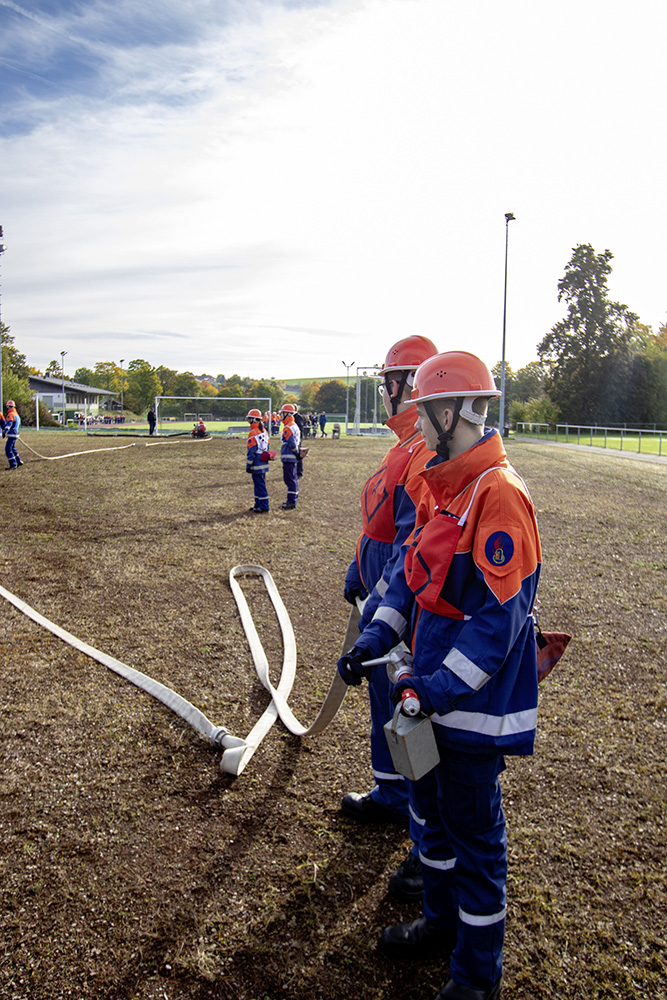 Kreisjugendwartin Pamela Hollerbach und Bürgermeister Roland Burger begrüßten am Morgen die Jugendlichen und ihre Betreuer im Frankenlandstadion bevor sich die Gruppen mit je neun Jugendlichen sich bei schönstem Herbstwetter ans Werk machten. Unter den Augen der Schiedsrichter und der Abnahmeberechtigten der Deutschen Jugendfeuerwehr, Mike Supper und Frank Luckenbach, zeigten die Jugendfeuerwehrler gute bis sehr gute Leistungen.