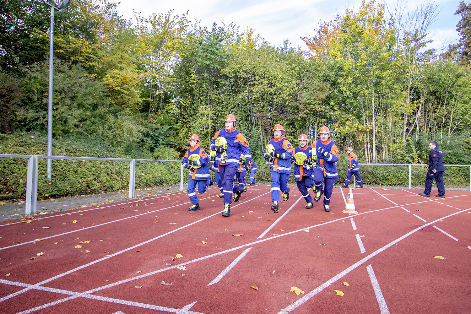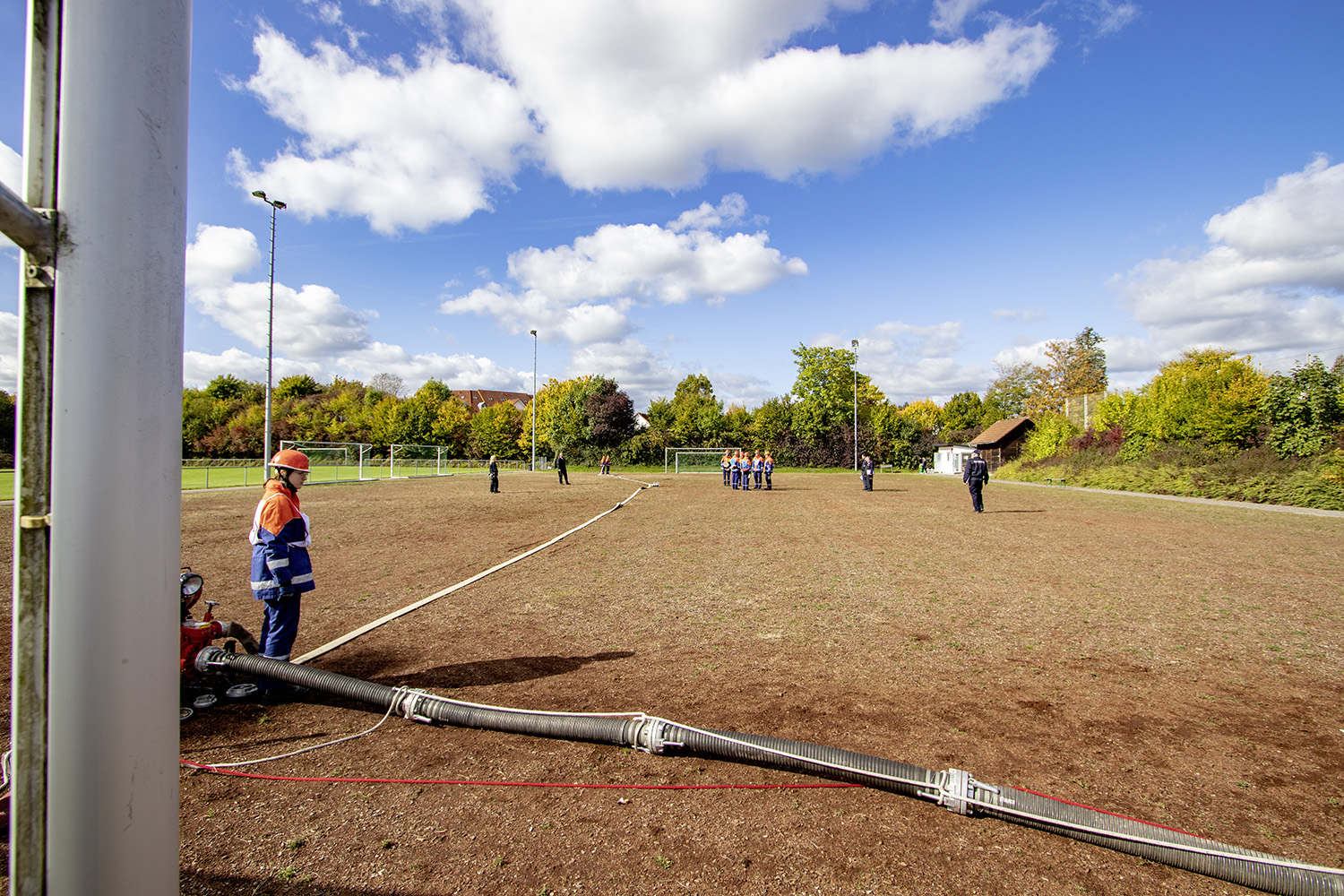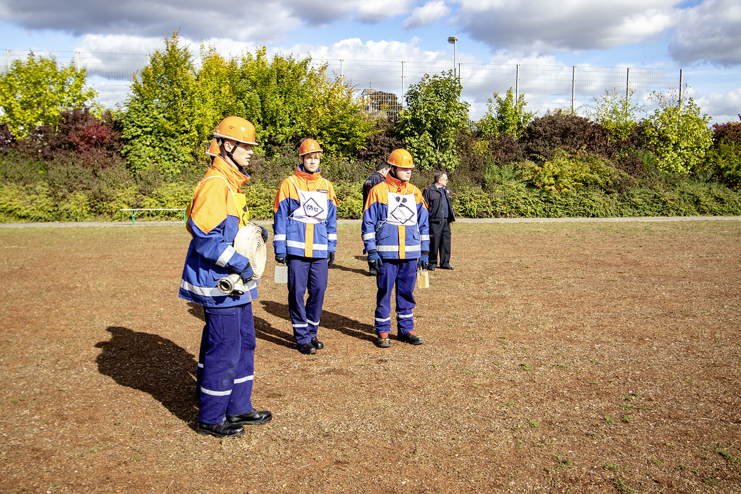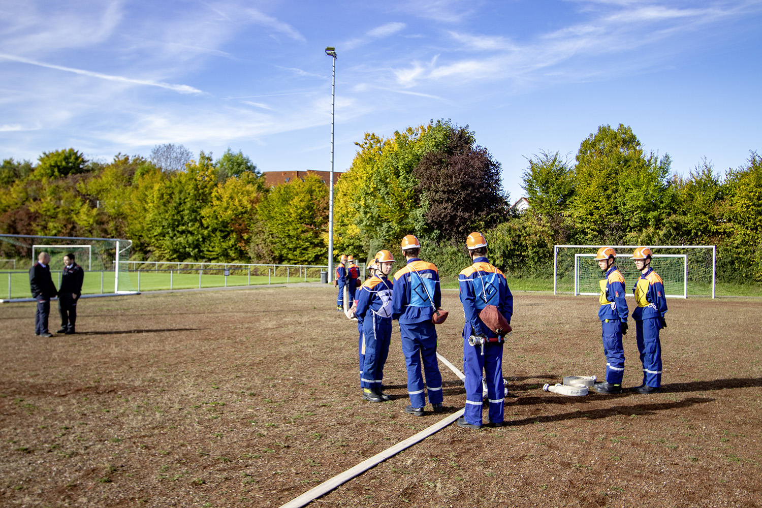 Kreisjugendwartin Pamela Hollerbach und Bürgermeister Roland Burger begrüßten am Morgen die Jugendlichen und ihre Betreuer im Frankenlandstadion bevor sich die Gruppen mit je neun Jugendlichen sich bei schönstem Herbstwetter ans Werk machten. Unter den Augen der Schiedsrichter und der Abnahmeberechtigten der Deutschen Jugendfeuerwehr, Mike Supper und Frank Luckenbach, zeigten die Jugendfeuerwehrler gute bis sehr gute Leistungen.